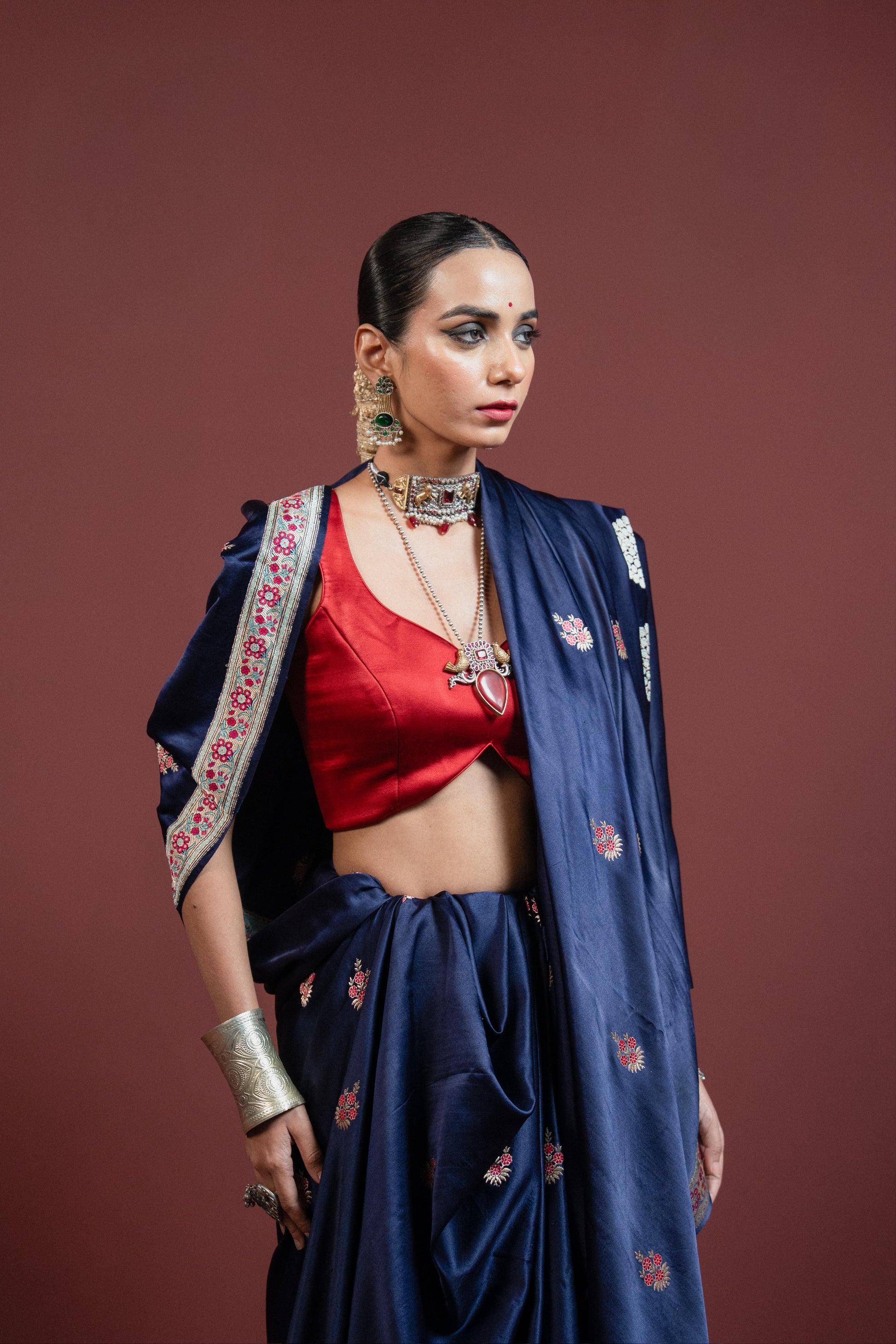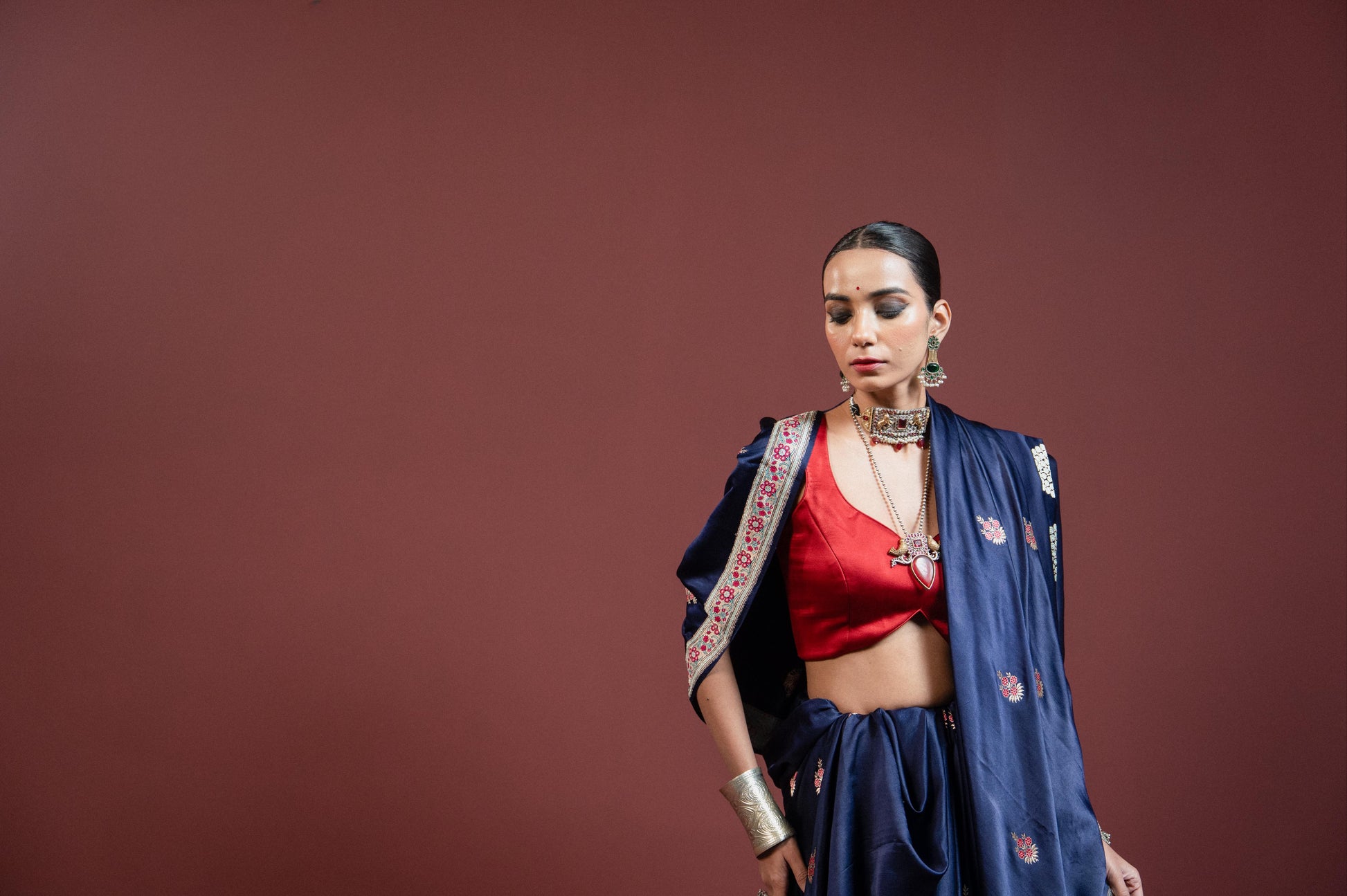 Ambuj, meaning “born of water,” draws its essence from calm surfaces and hidden strength. Draped in a deep navy blue, this saree reflects quiet power, stability, and timeless elegance. The rich hue creates a striking presence, while refined woven detailing adds subtle texture and depth.