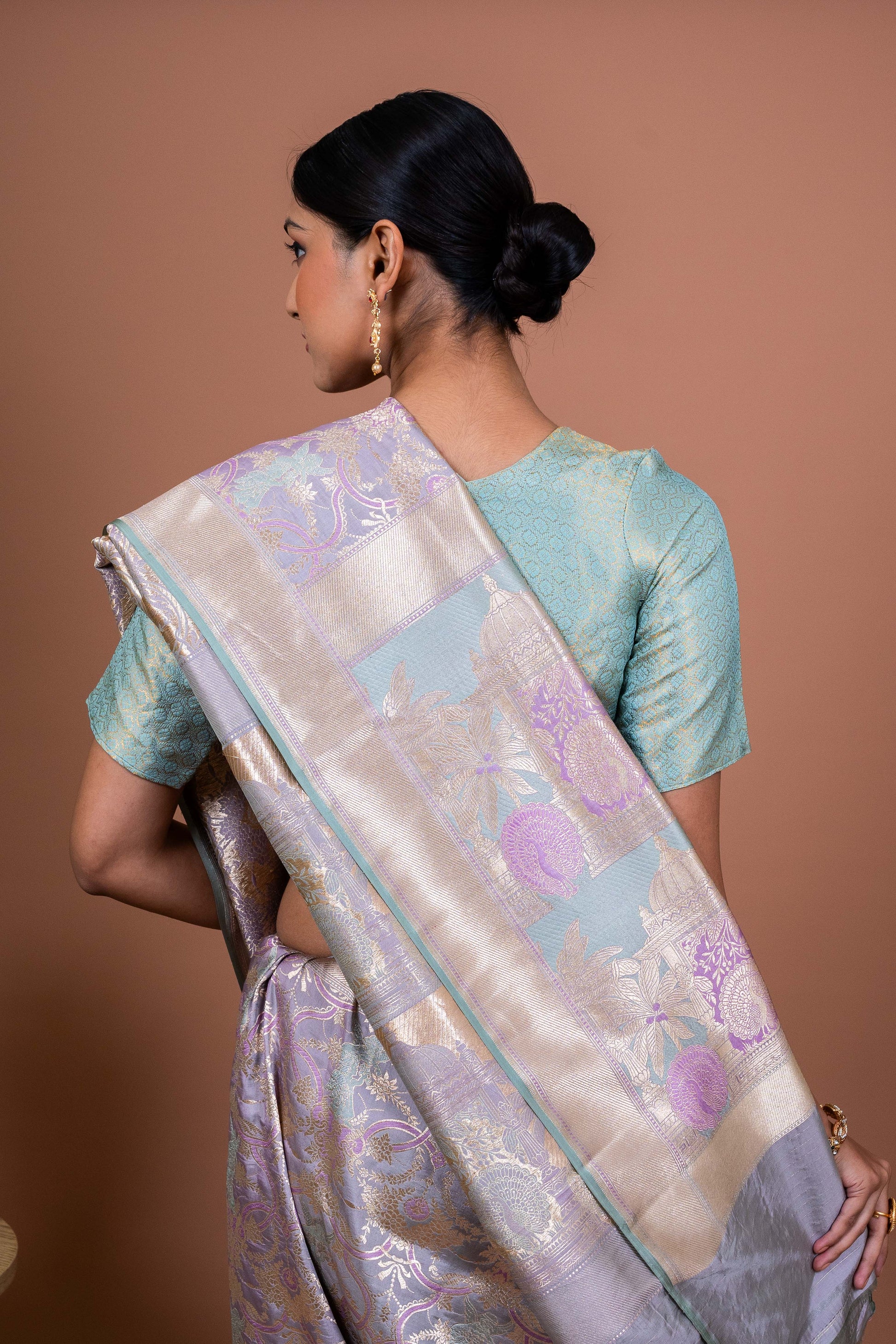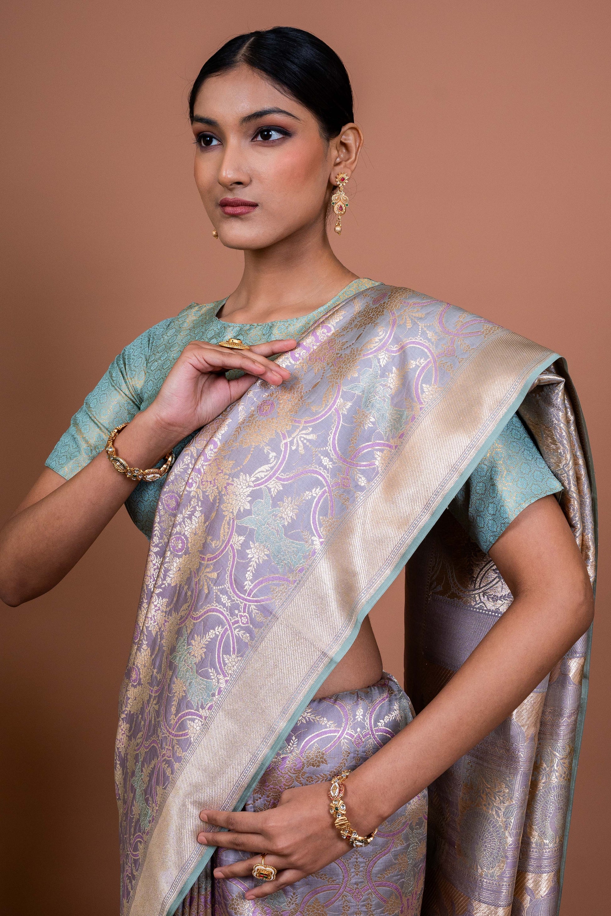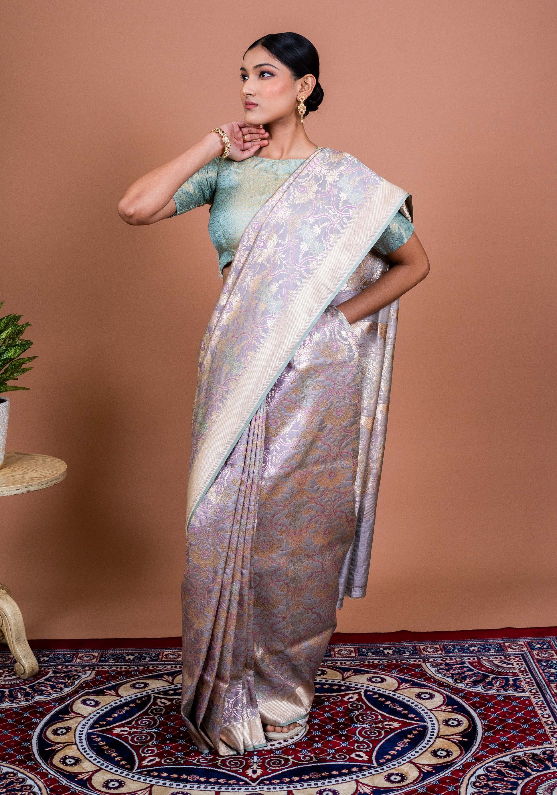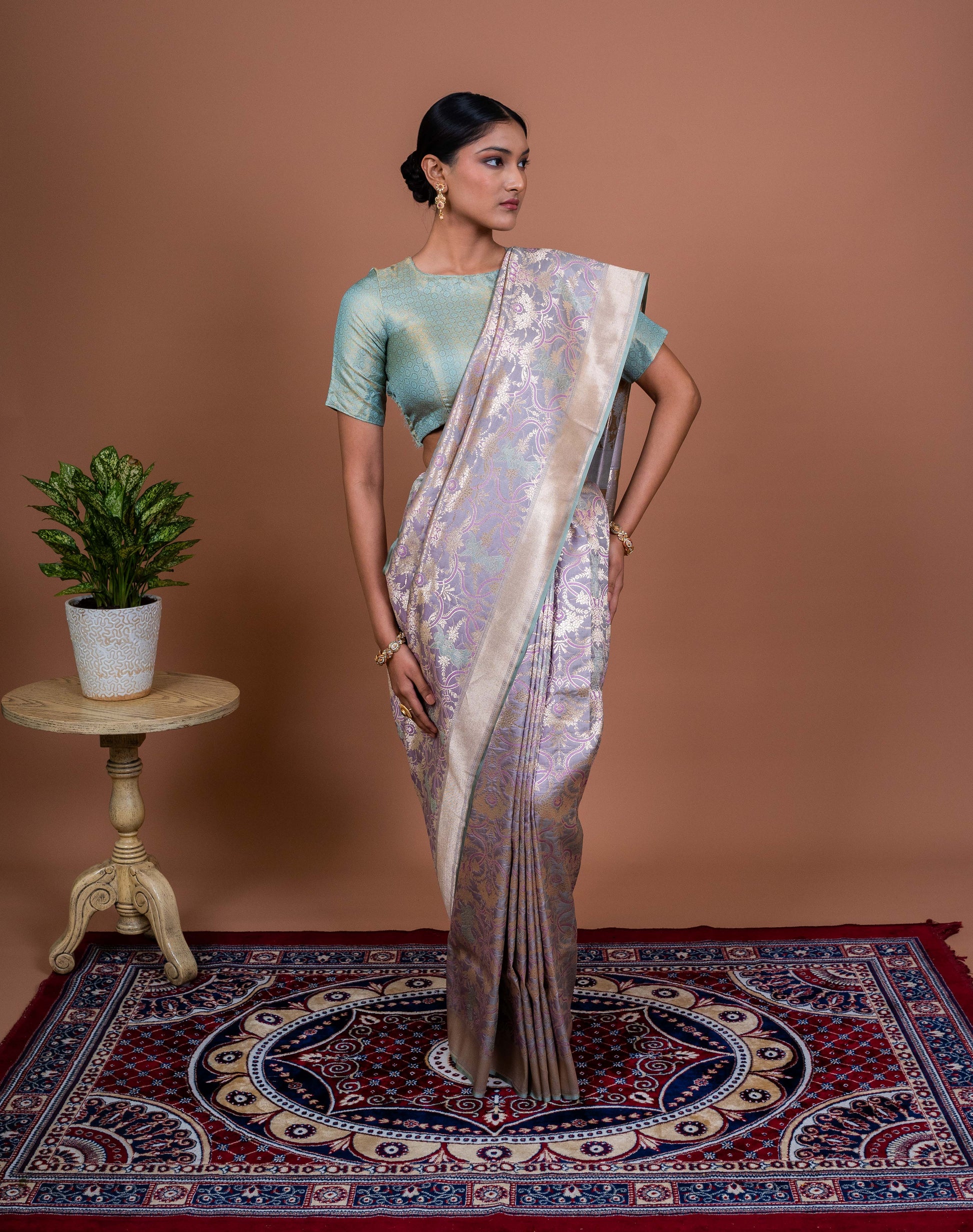 The Apsara Jaal Handwoven Banarasi Saree is a vision of ethereal beauty, woven with intricate artistry in the soft embrace of lavender. It carries the grace of celestial nymphs and the timeless charm of Banarasi craftsmanship.