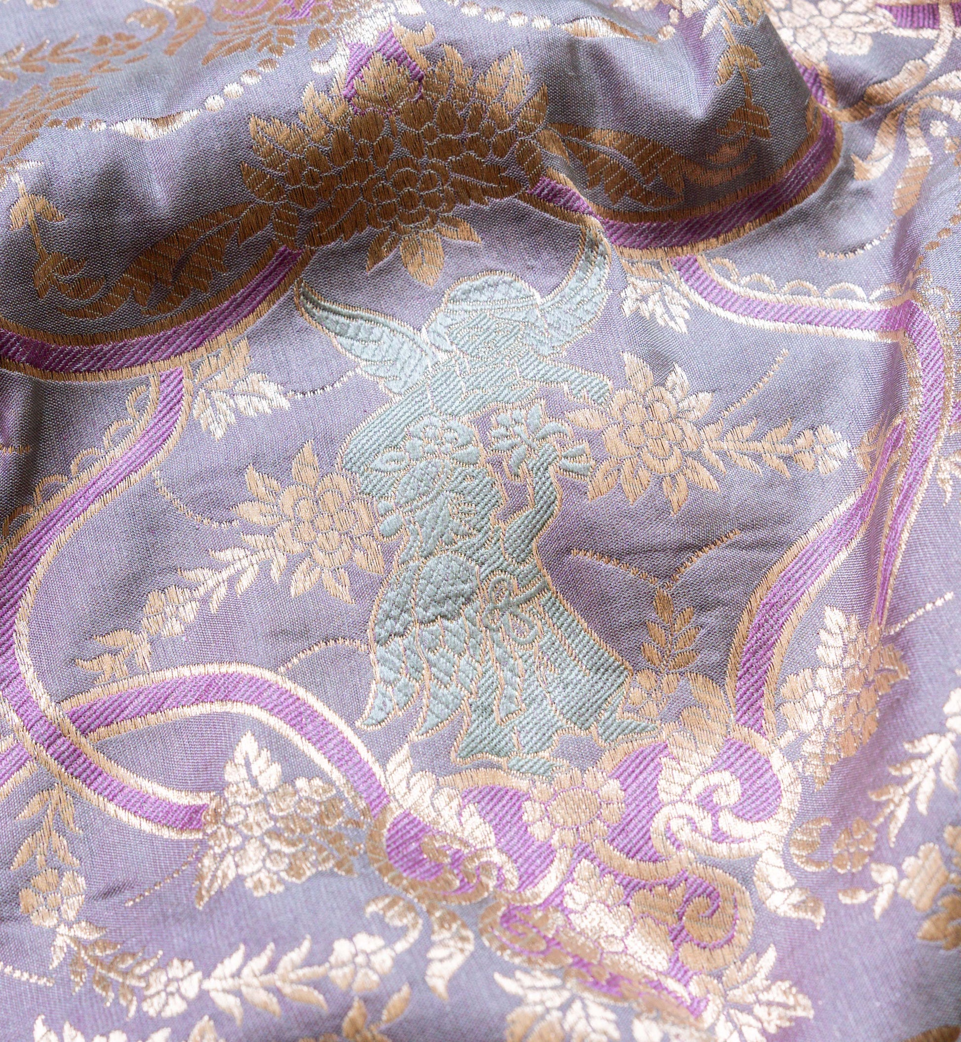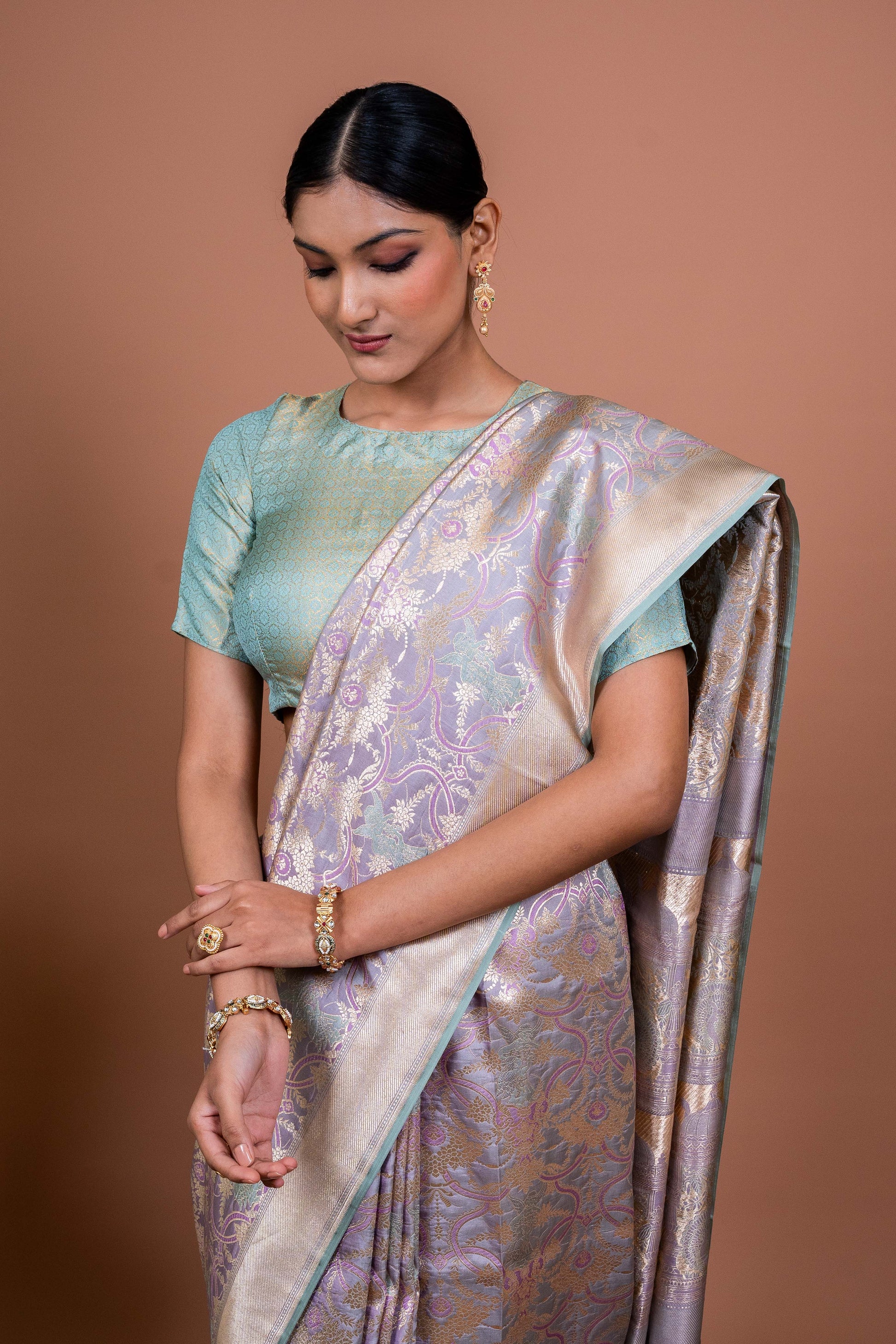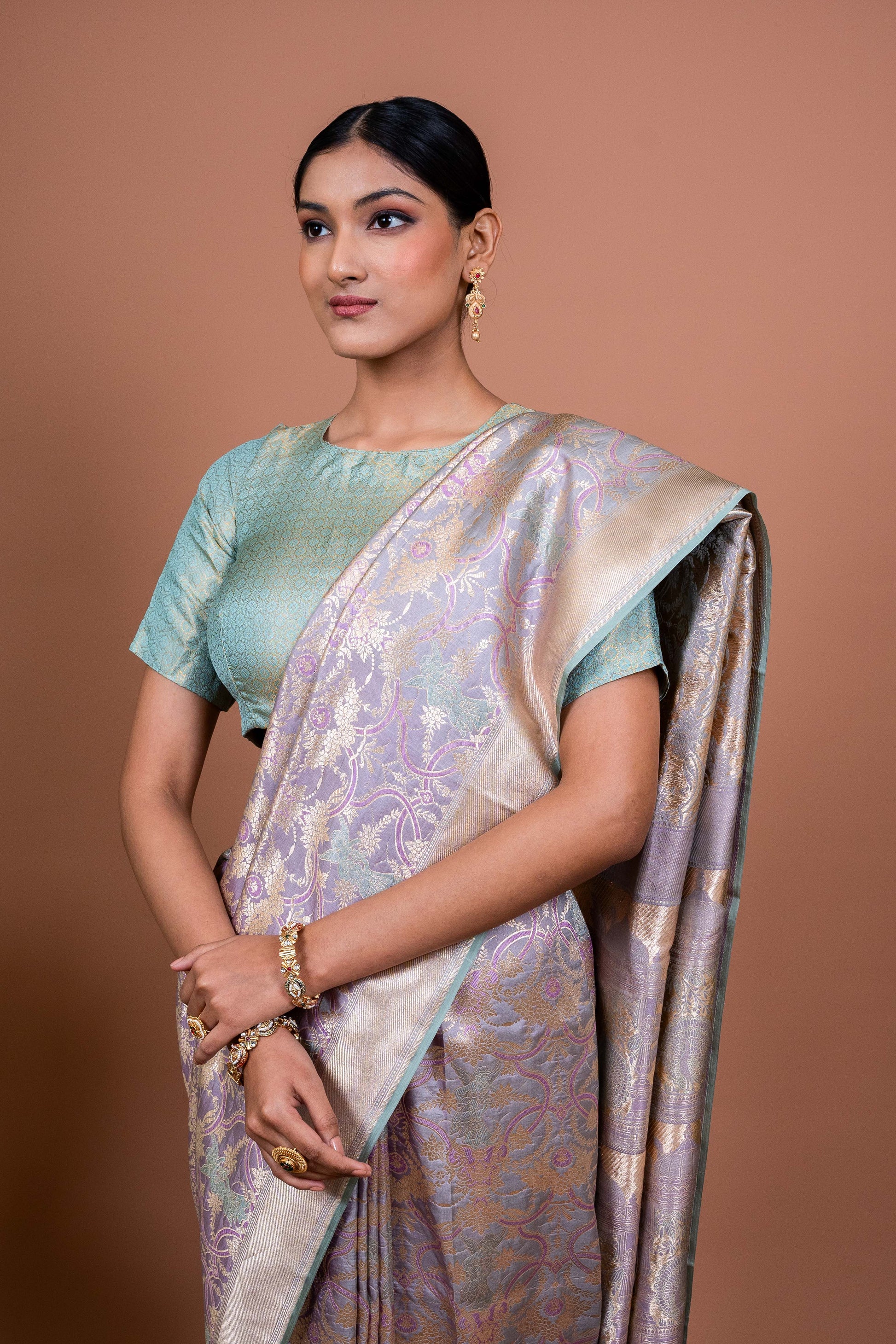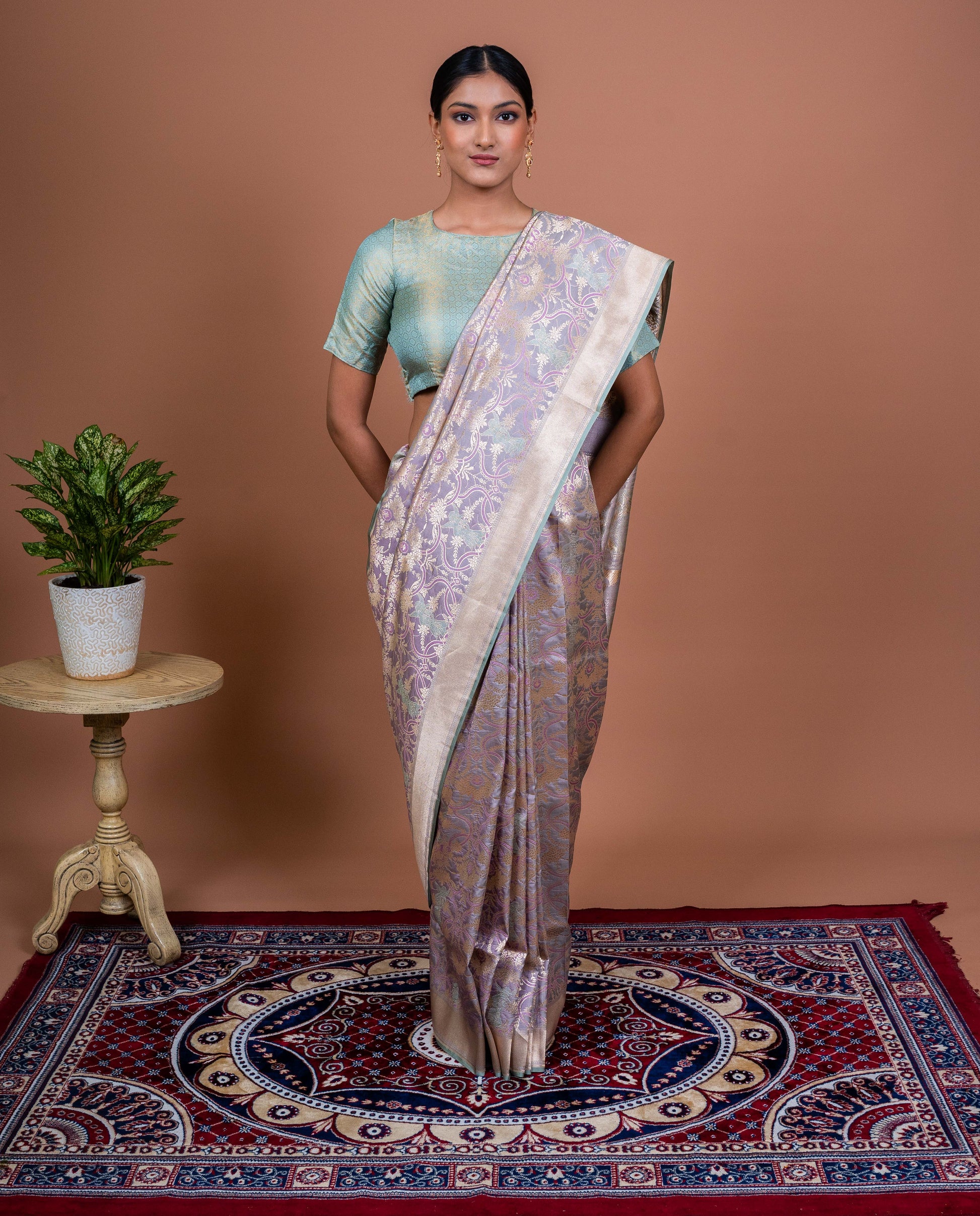 The Apsara Jaal Handwoven Banarasi Saree is a vision of ethereal beauty, woven with intricate artistry in the soft embrace of lavender. It carries the grace of celestial nymphs and the timeless charm of Banarasi craftsmanship.