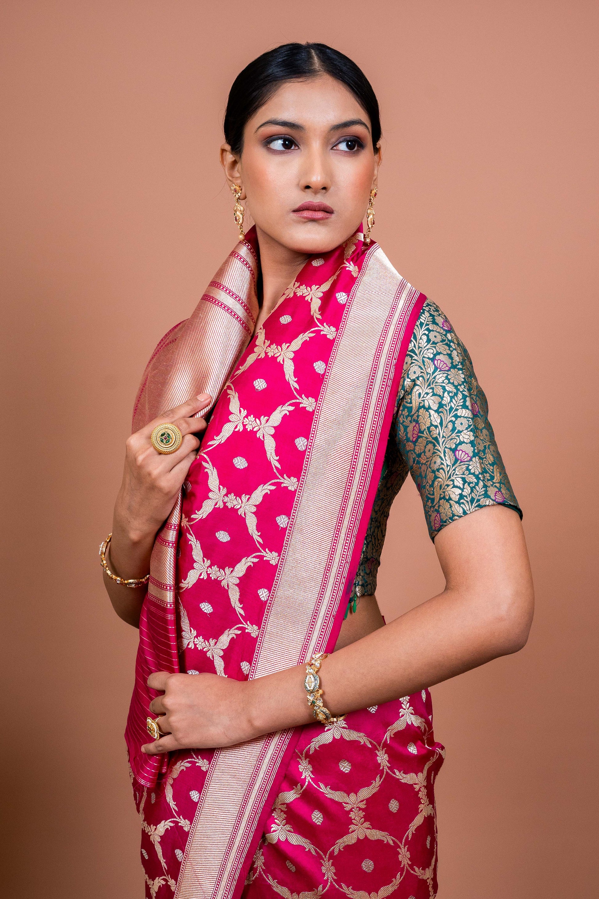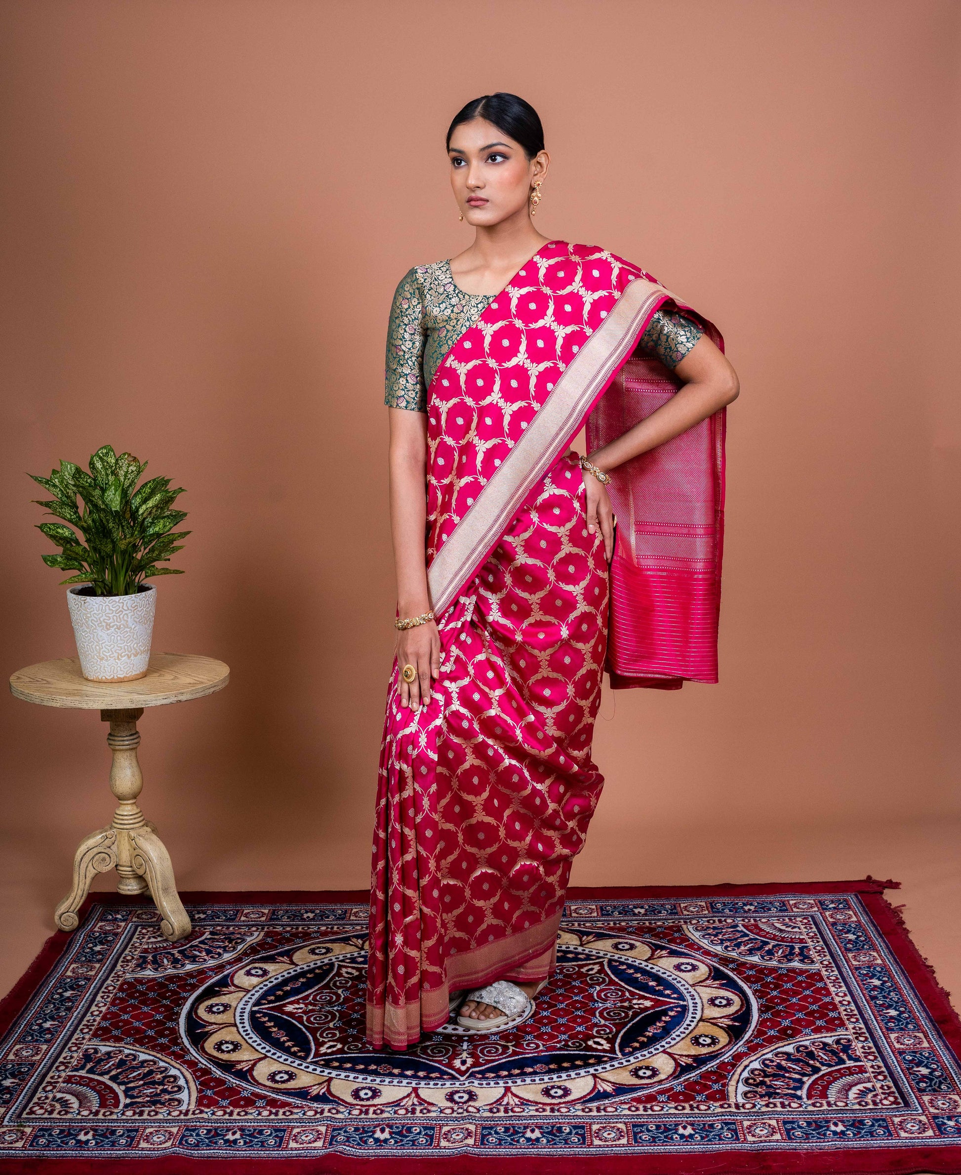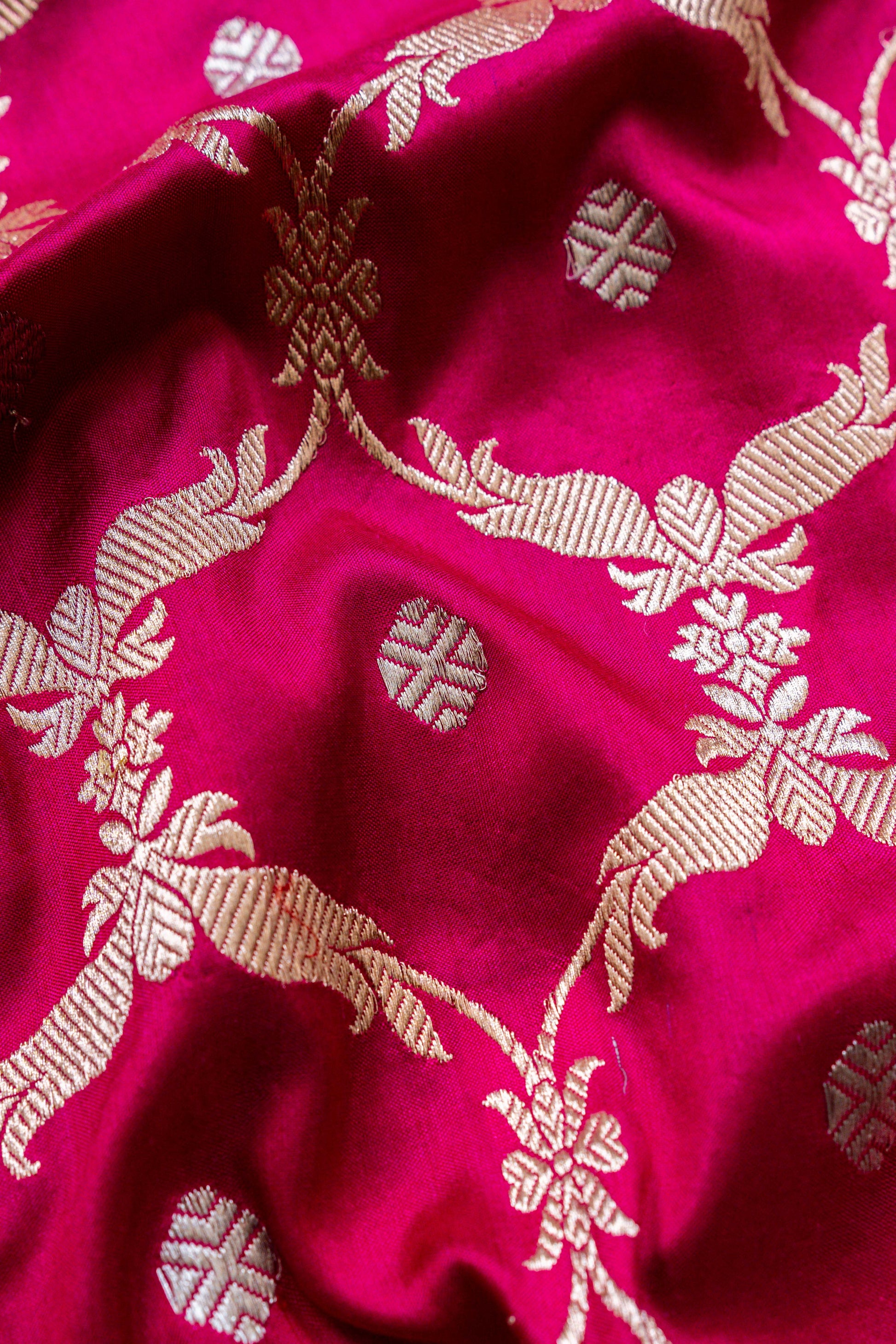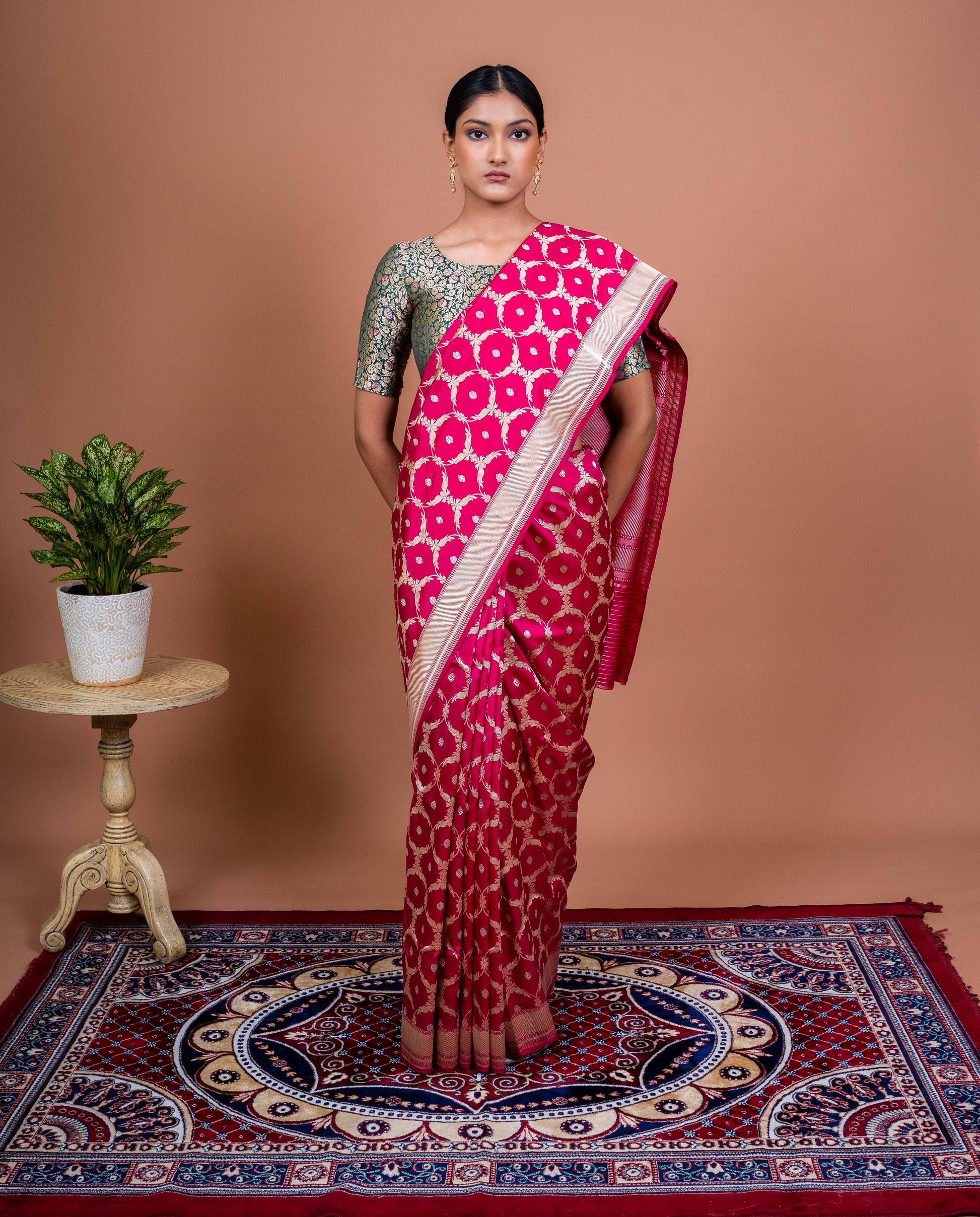 The Charulata Handwoven Banarasi Saree in mesmerizing magenta is where tradition meets timeless beauty. Every thread is a labor of love, every motif a glimpse into the artistry of master weavers.