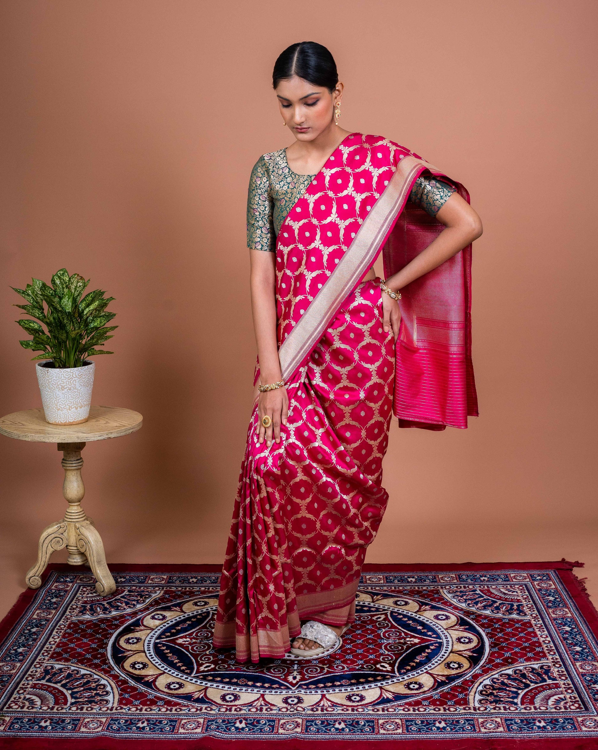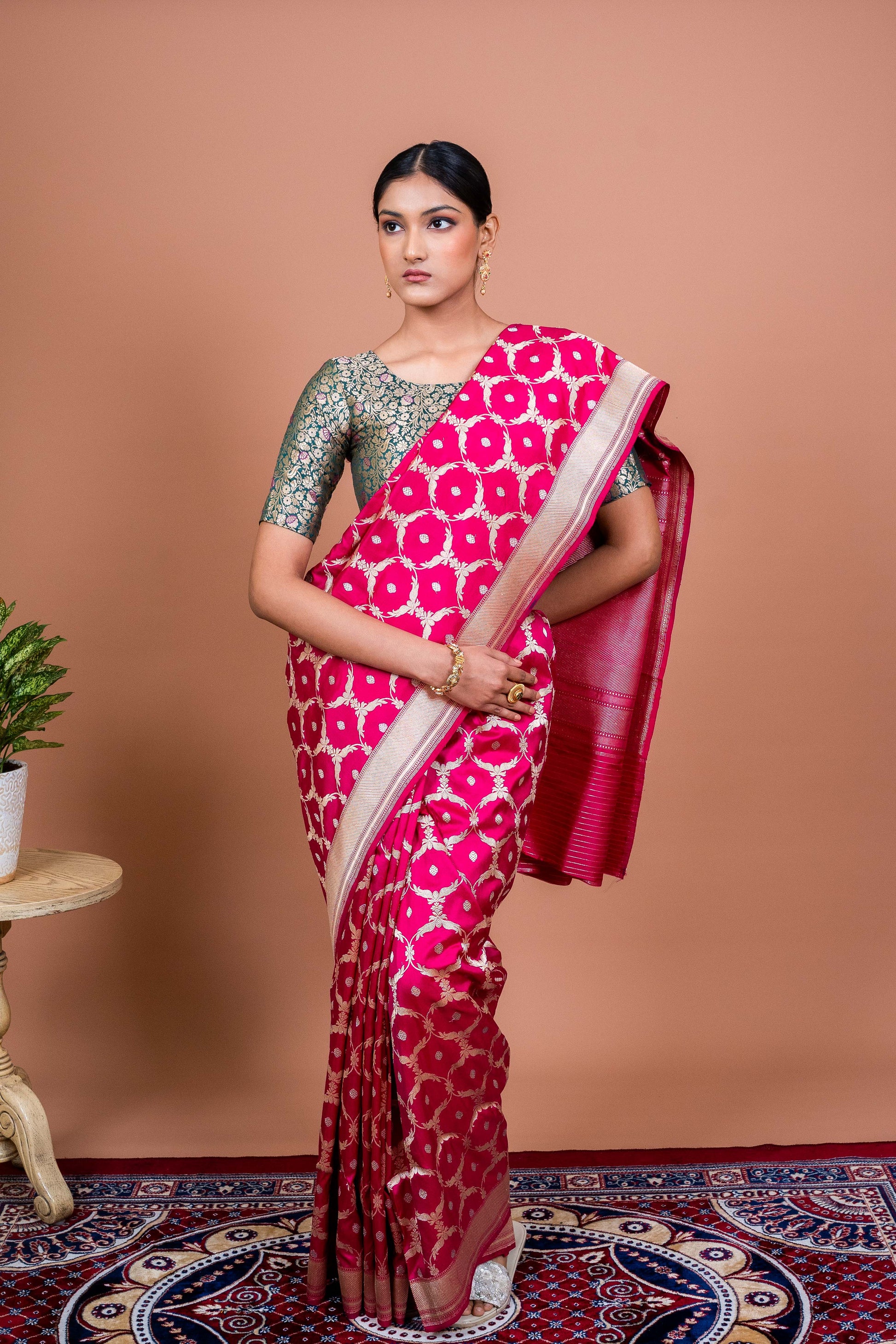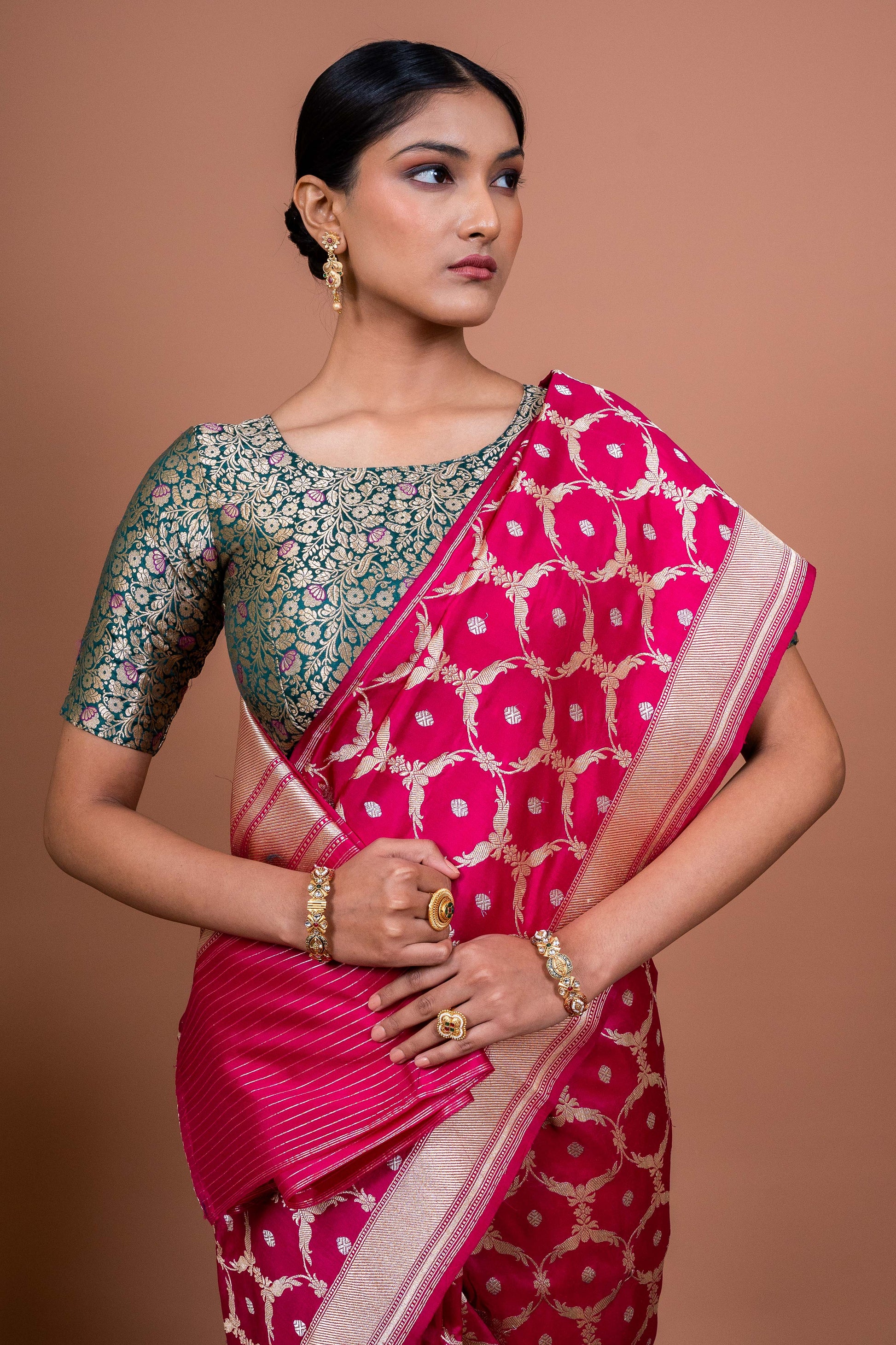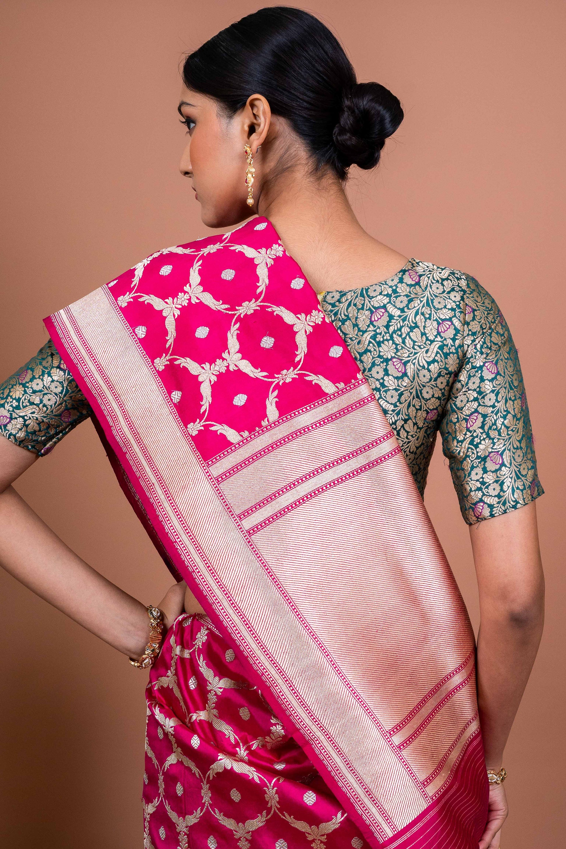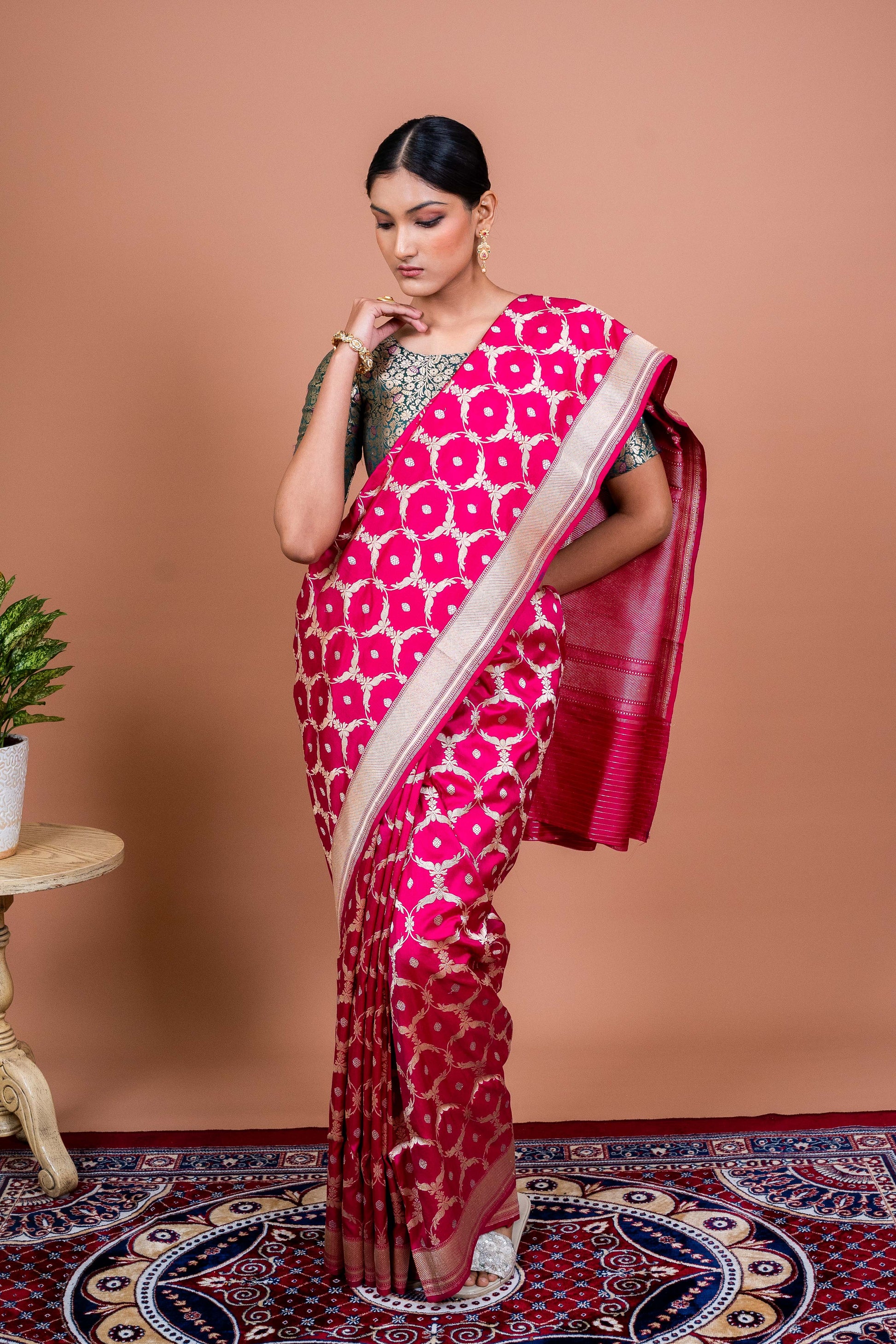 The Charulata Handwoven Banarasi Saree in mesmerizing magenta is where tradition meets timeless beauty. Every thread is a labor of love, every motif a glimpse into the artistry of master weavers.
