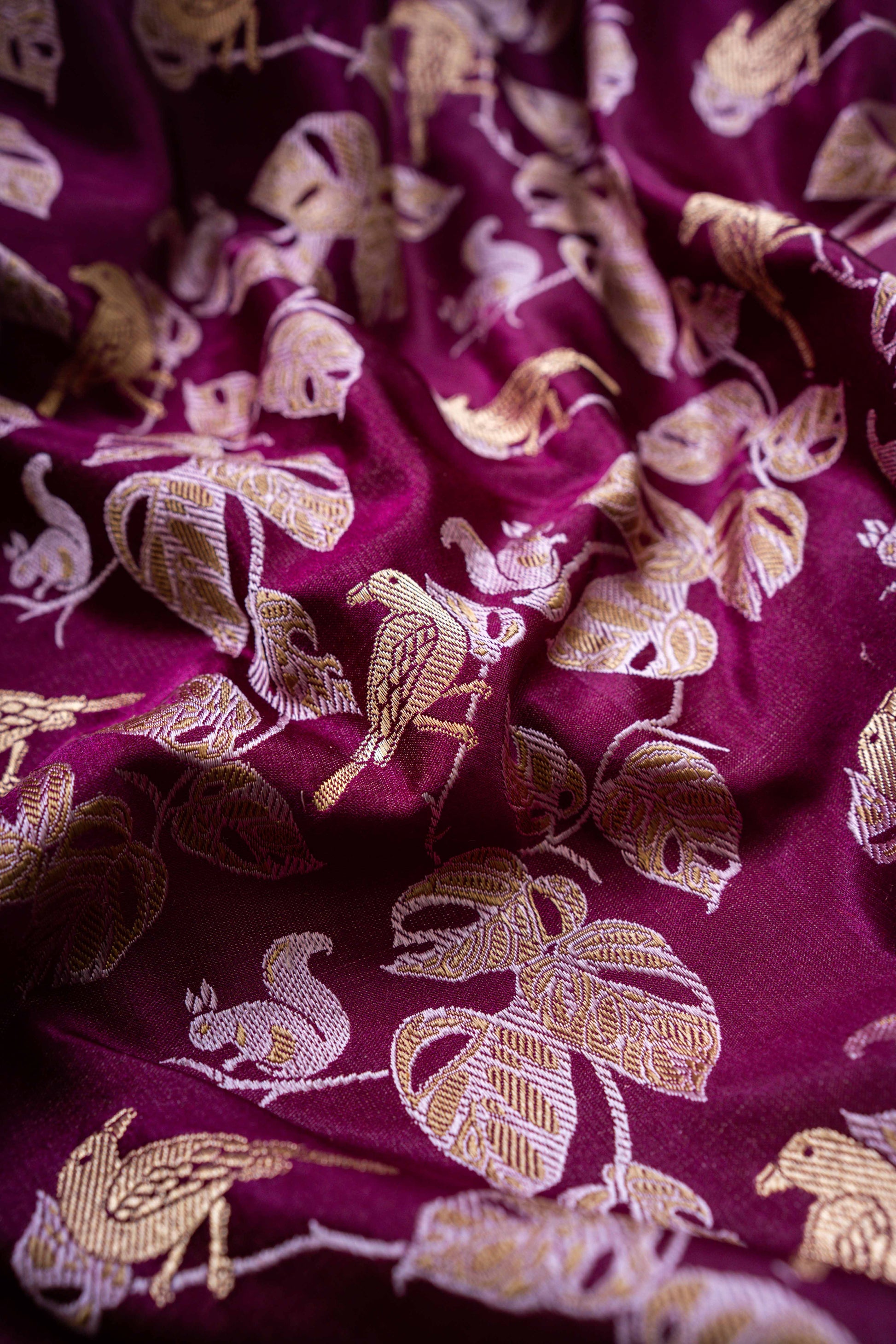 This Chidiya Jaal Handwoven Banaras Saree in wine is a stunning display of traditional craftsmanship from Banaras. Made with intricate bird motif patterns, this saree is handwoven with precision and care. Stand out at any occasion with this unique and elegant piece.
