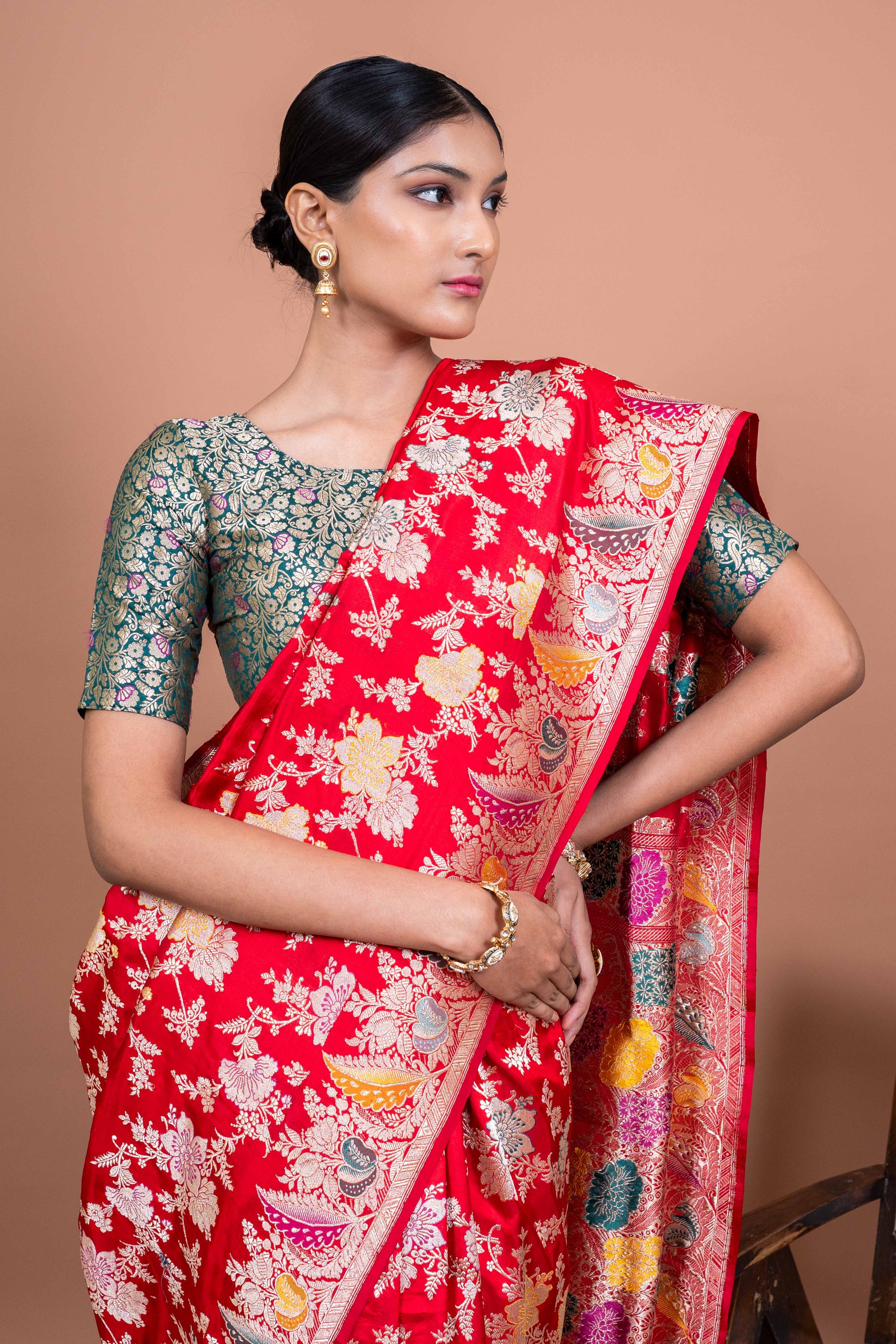 Experience the timeless elegance of the Diya Jangla Handwoven Banaras Saree. Handcrafted by skilled artisans, this saree features intricate Jangla weaving, creating a stunning texture. Made from the finest quality fabric, it promises a comfortable fit and long-lasting drape. Elevate your ethnic wardrobe with this exquisite piece.