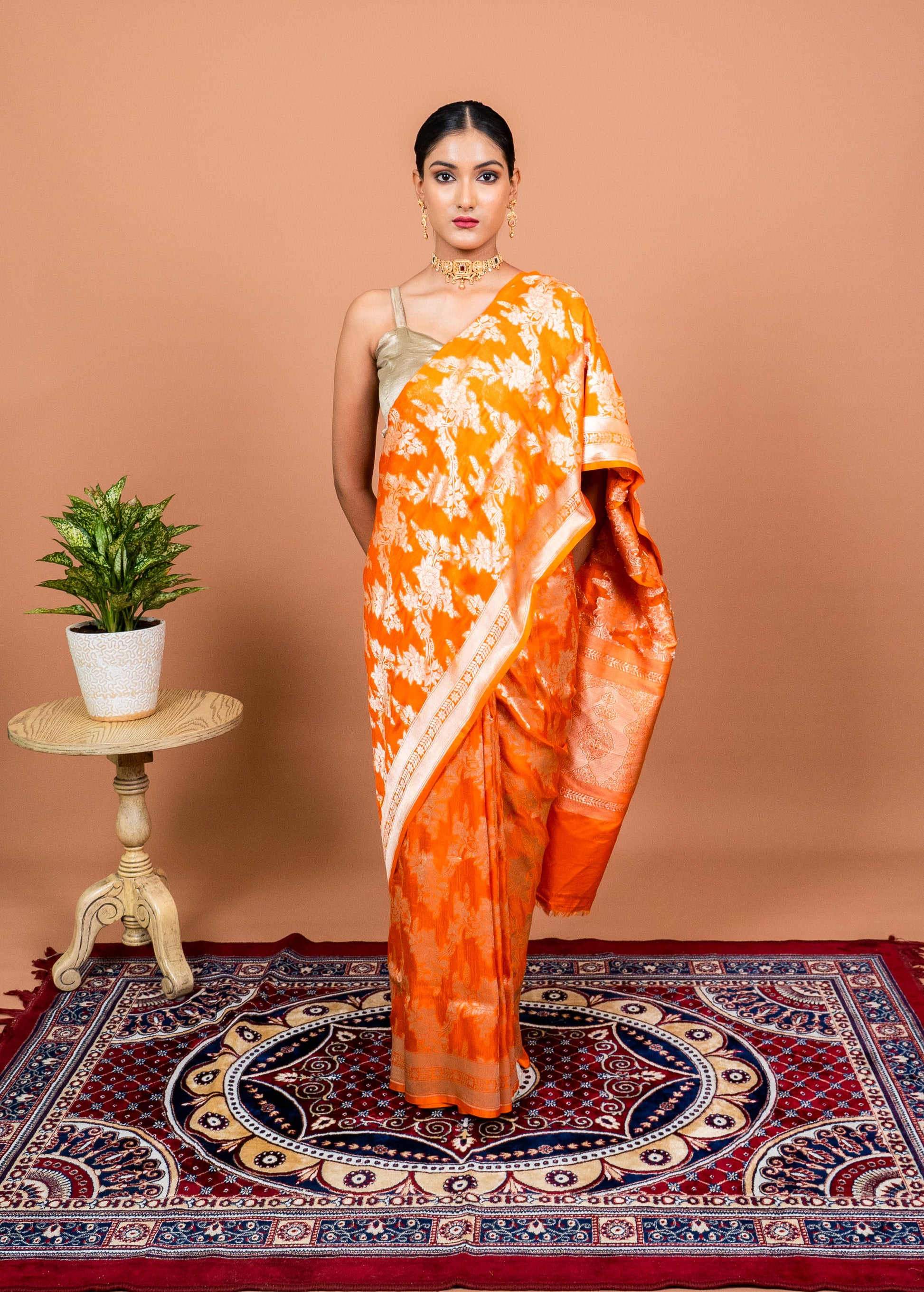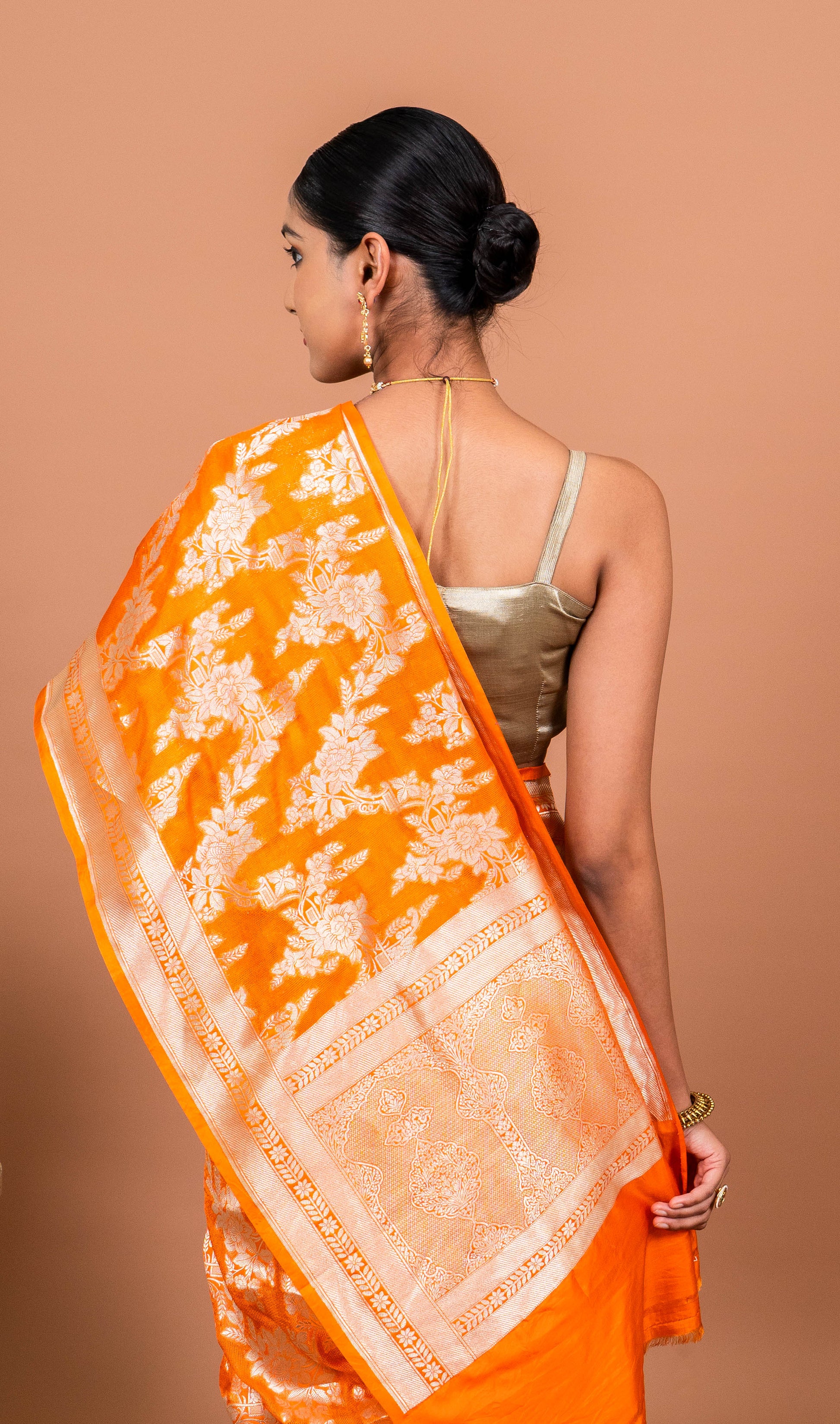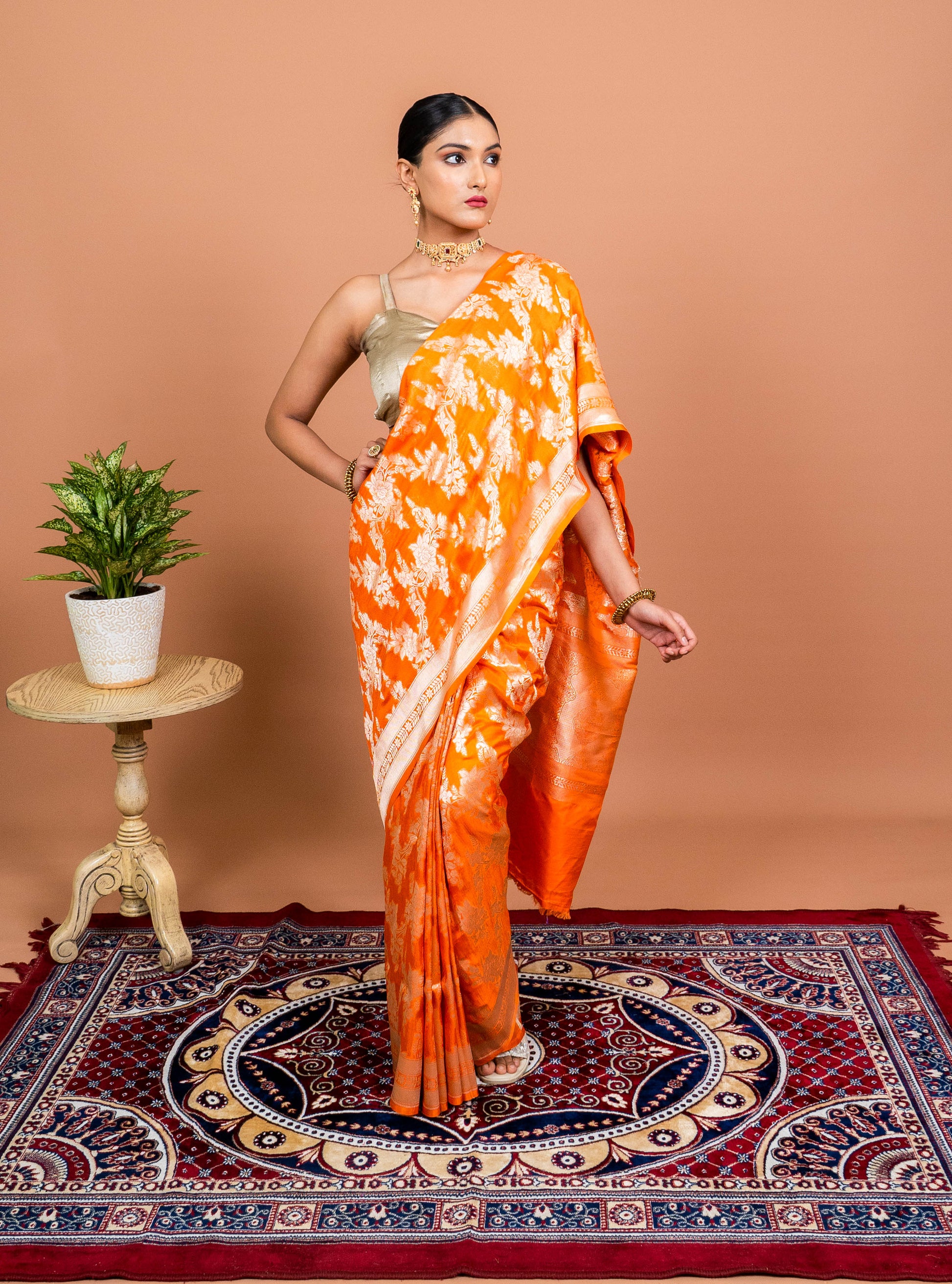 Some sarees don’t just add to your wardrobe; they add to your aura. The Gul Handwoven Banarasi Silk Saree in a radiant orange is one such piece—vibrant, elegant, and woven with care. Its delicate floral motifs bloom across pure silk, bringing together heritage and timeless beauty in every drape.
