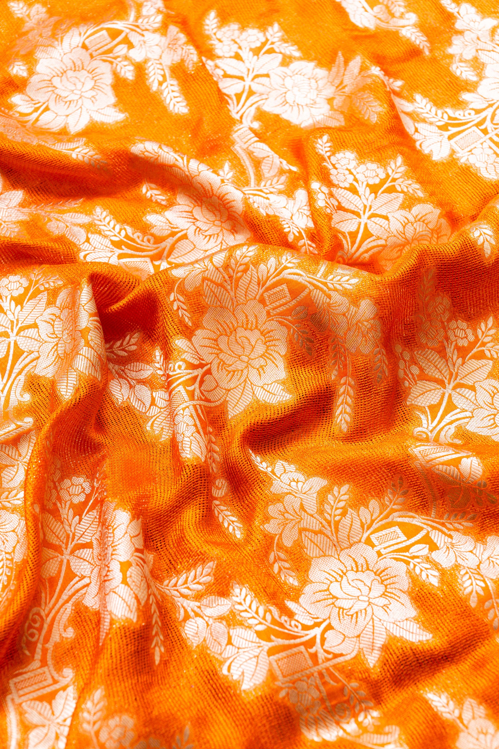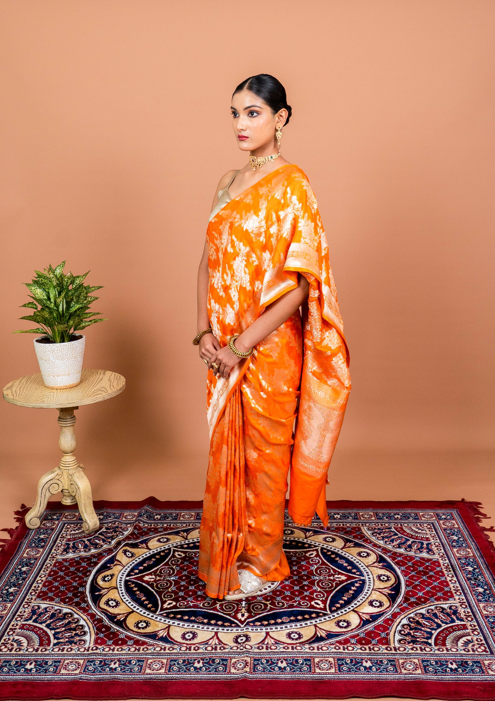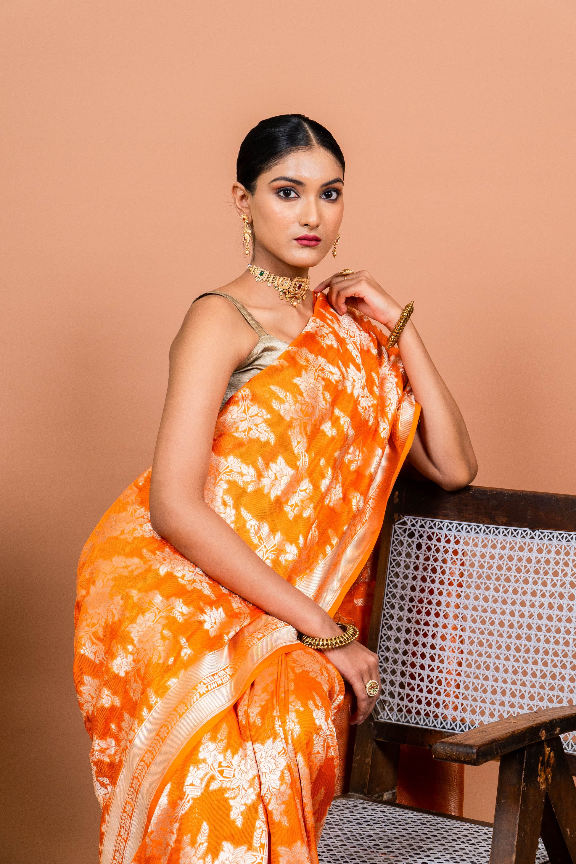 Some sarees don’t just add to your wardrobe; they add to your aura. The Gul Handwoven Banarasi Silk Saree in a radiant orange is one such piece—vibrant, elegant, and woven with care. Its delicate floral motifs bloom across pure silk, bringing together heritage and timeless beauty in every drape.