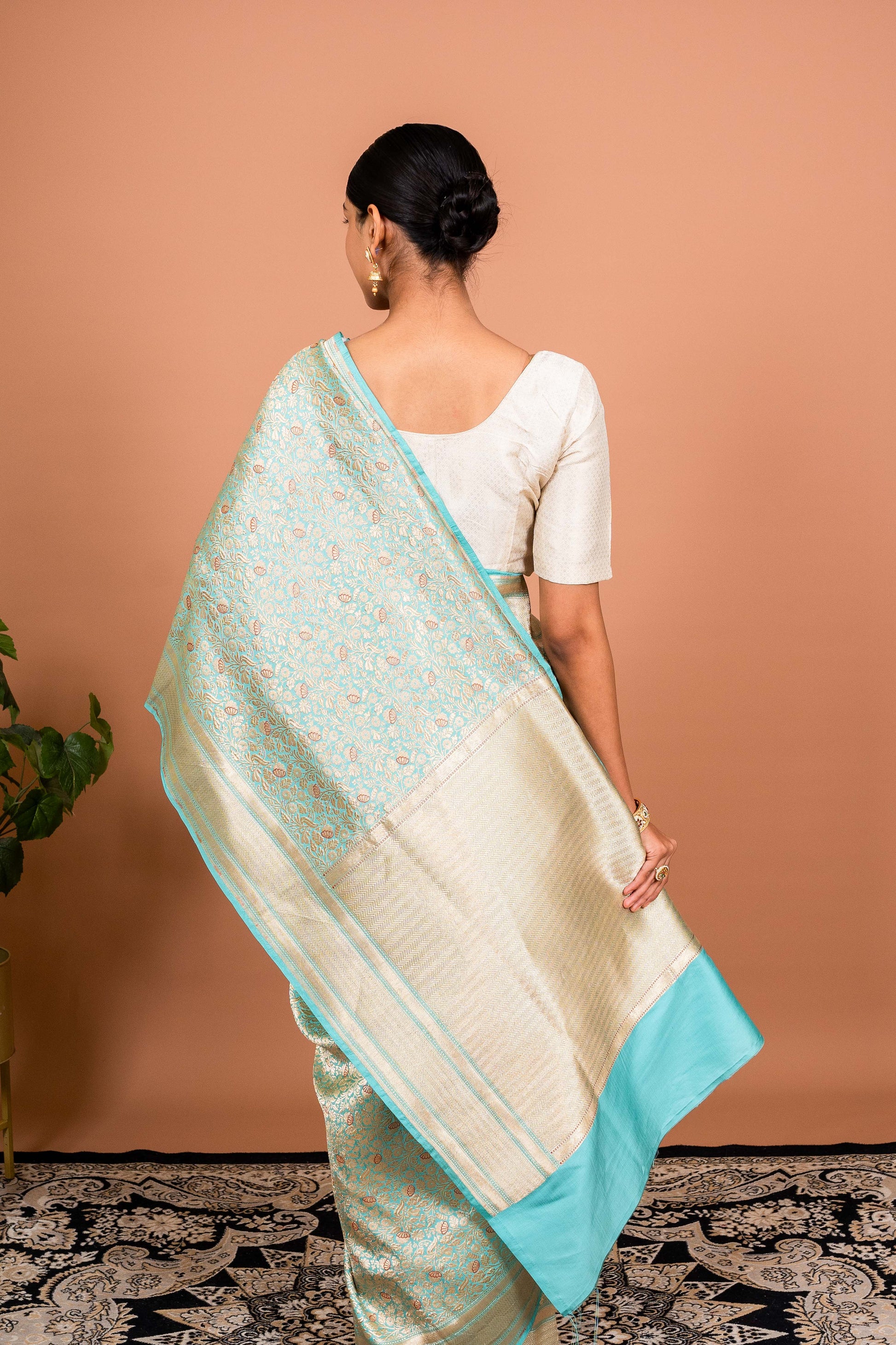 Like a garden in full bloom under a twilight sky, the Gulbagh Handwoven Banarasi Silk Saree in a serene blue hue is a vision of grace and artistry. Every thread, every motif is a tribute to the timeless beauty of nature, woven with the skill of generations. This saree is made for the woman who carries elegance with ease and radiates charm in every step.