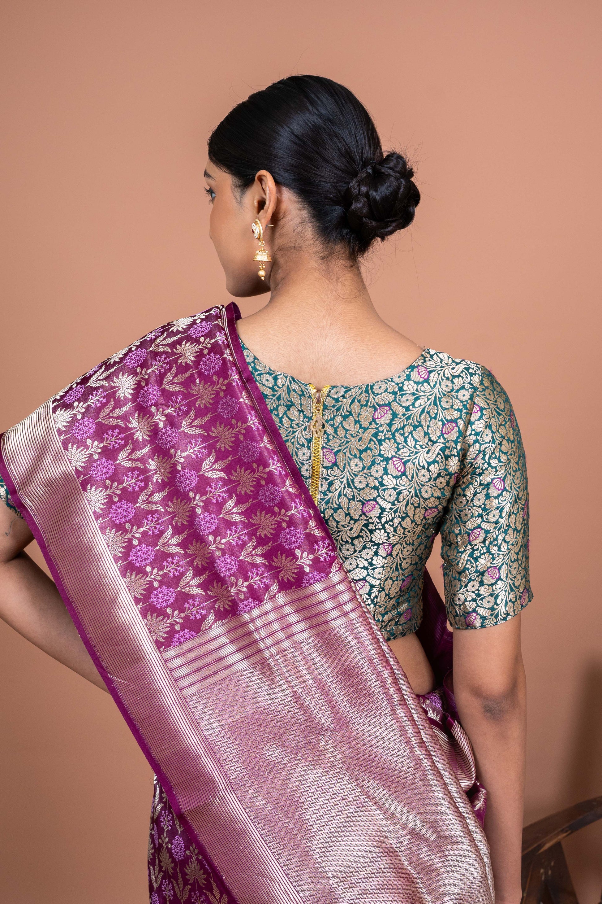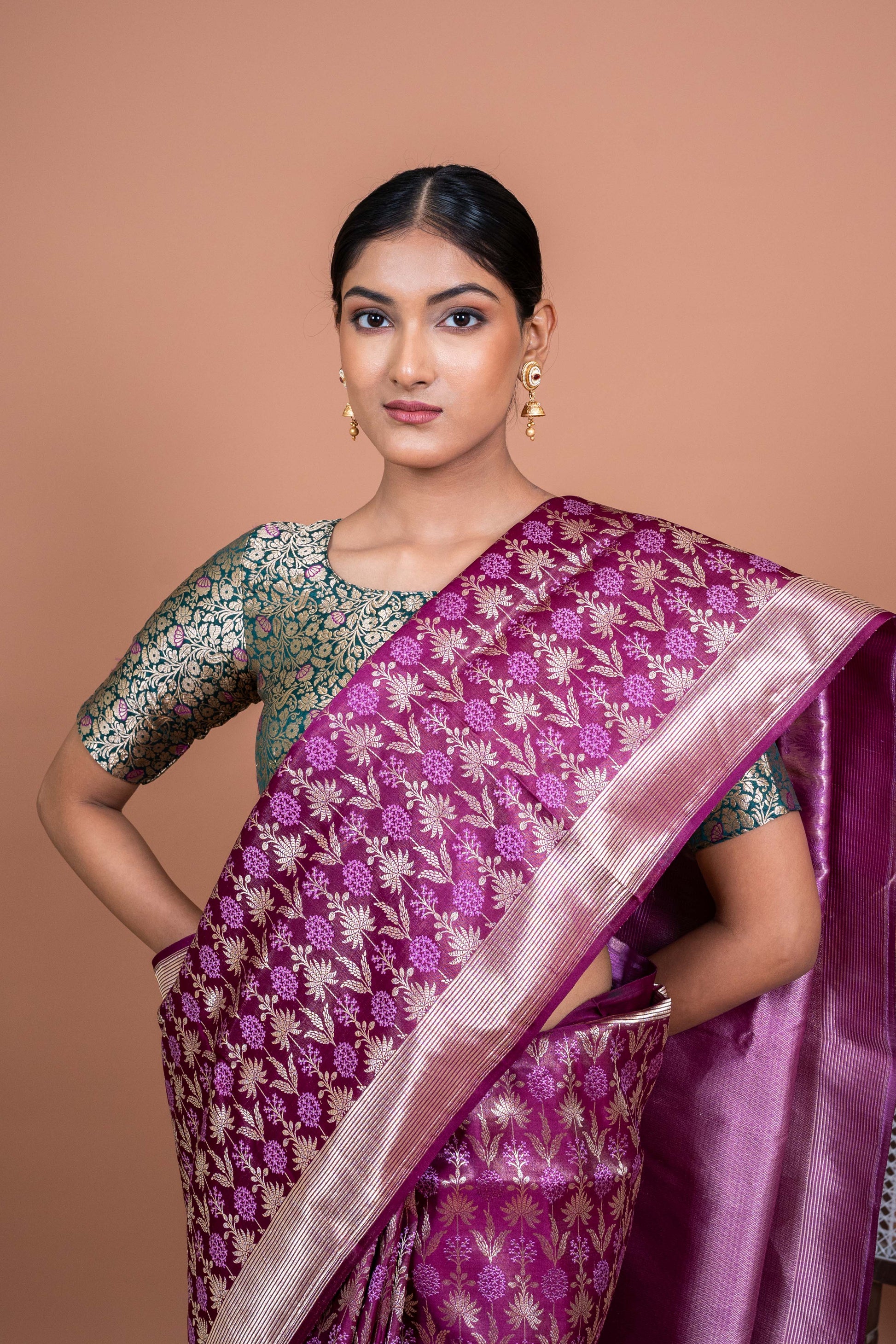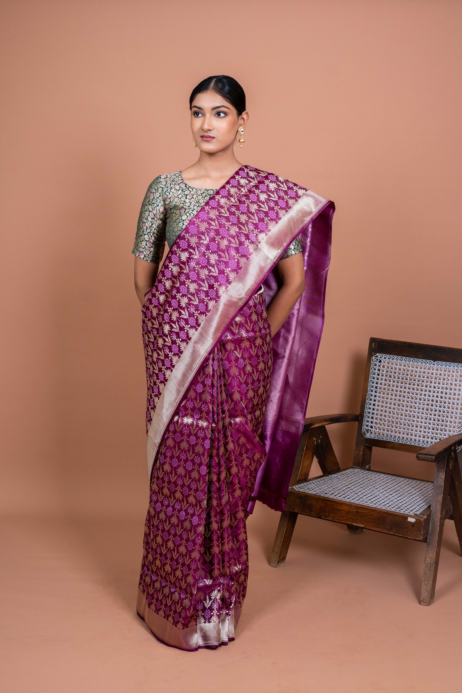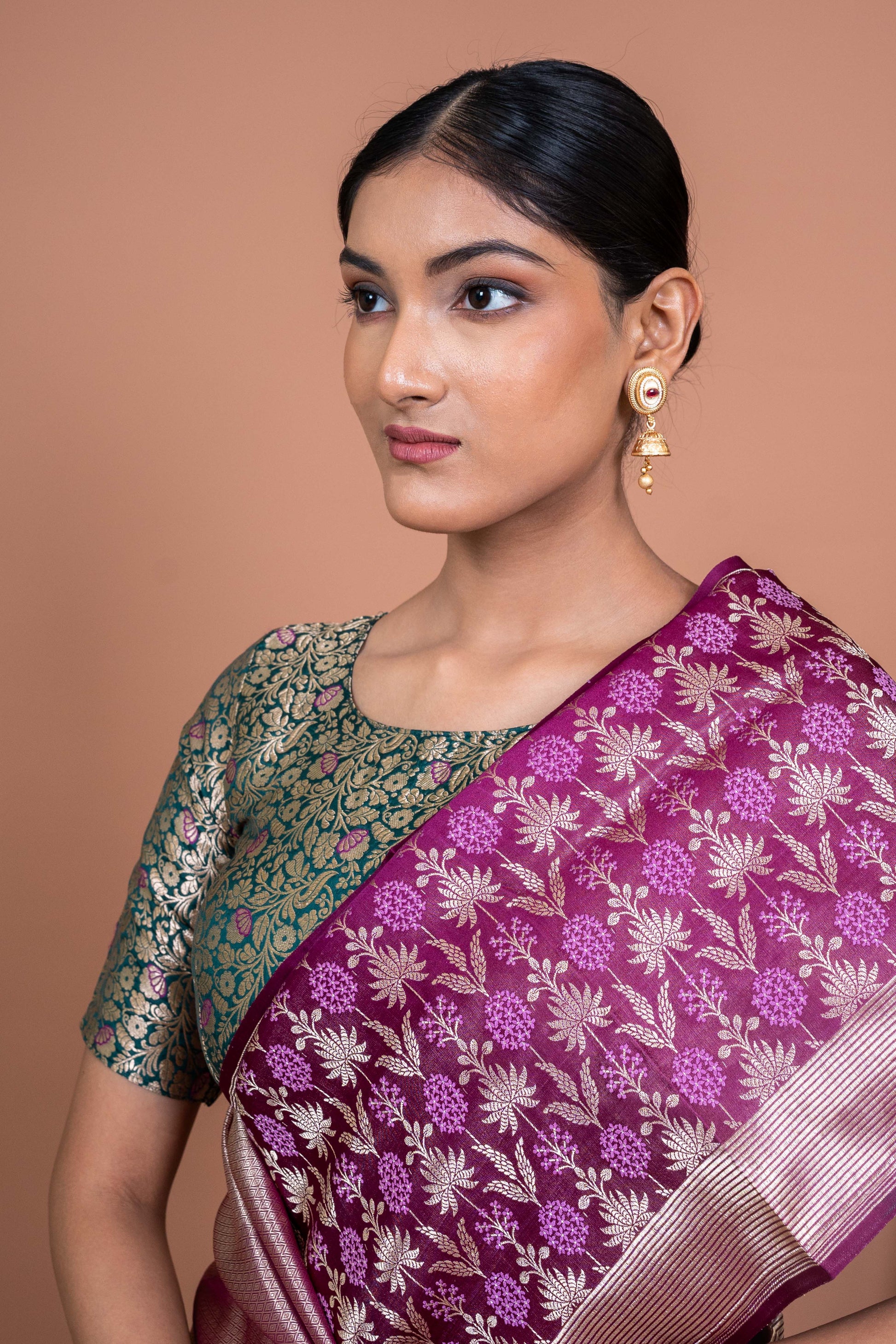 The Guldhaari Handwoven Banaras Saree in a rich, luxurious wine shade is a timeless piece that captures the essence of elegance and tradition. The deep, soulful hue adds a touch of sophistication, making it the perfect choice for those moments when you want to stand out with grace.