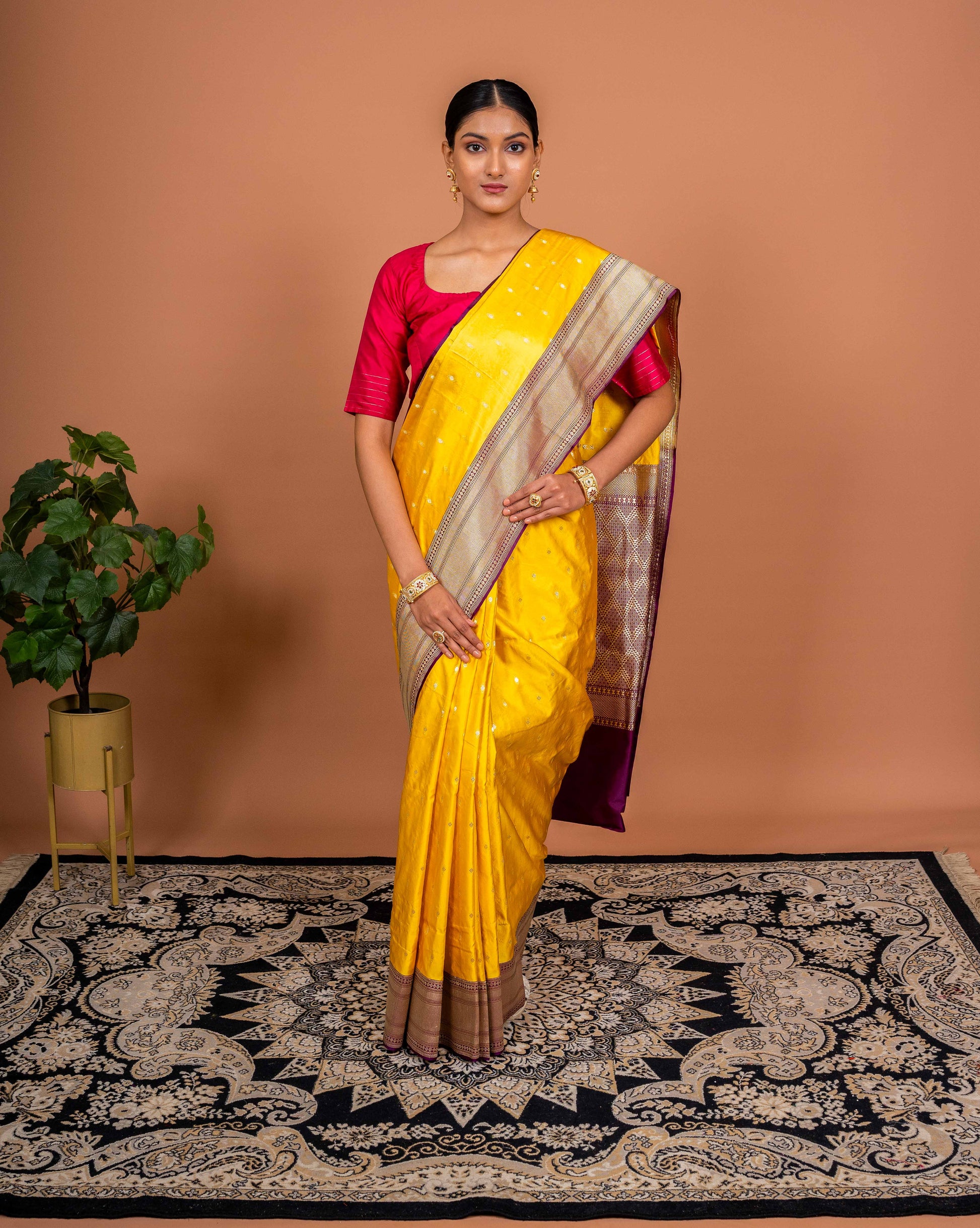 A celebration of heritage and craftsmanship—the Kadhiyal Handwoven Banarasi Silk Saree in a radiant yellow hue is a masterpiece that blends tradition with effortless grace. The hallmark of the Kadhiyal weave lies in its striking contrast borders, a technique perfected over generations by Banaras’ finest artisans. This saree is for the woman who cherishes elegance in every thread and confidence in every step.