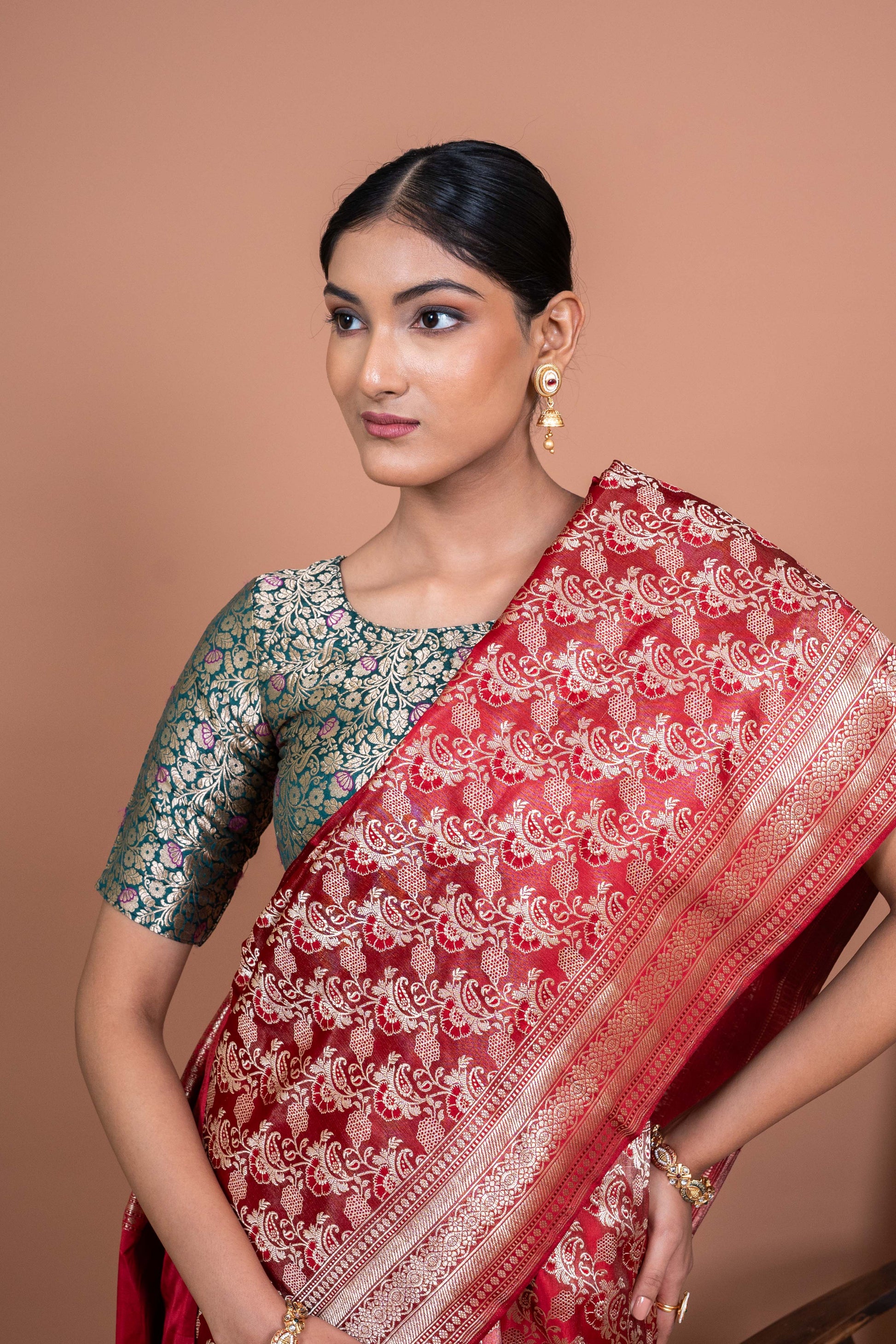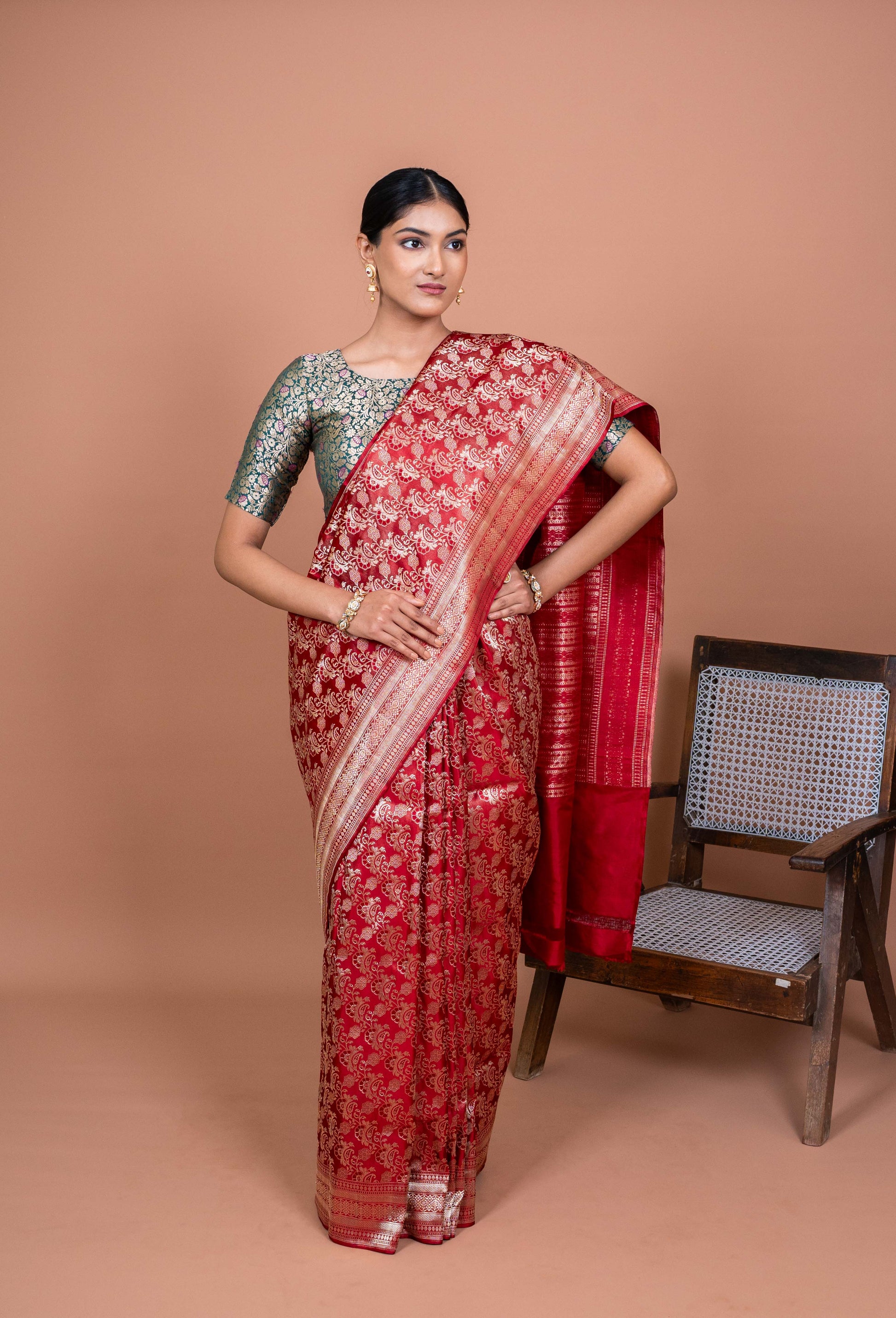 The Kinari Handwoven Banaras Saree in a rich maroon is a masterpiece that blends tradition with elegance. This deep, warm hue evokes a sense of royalty and refinement, making it a timeless choice for any special occasion.