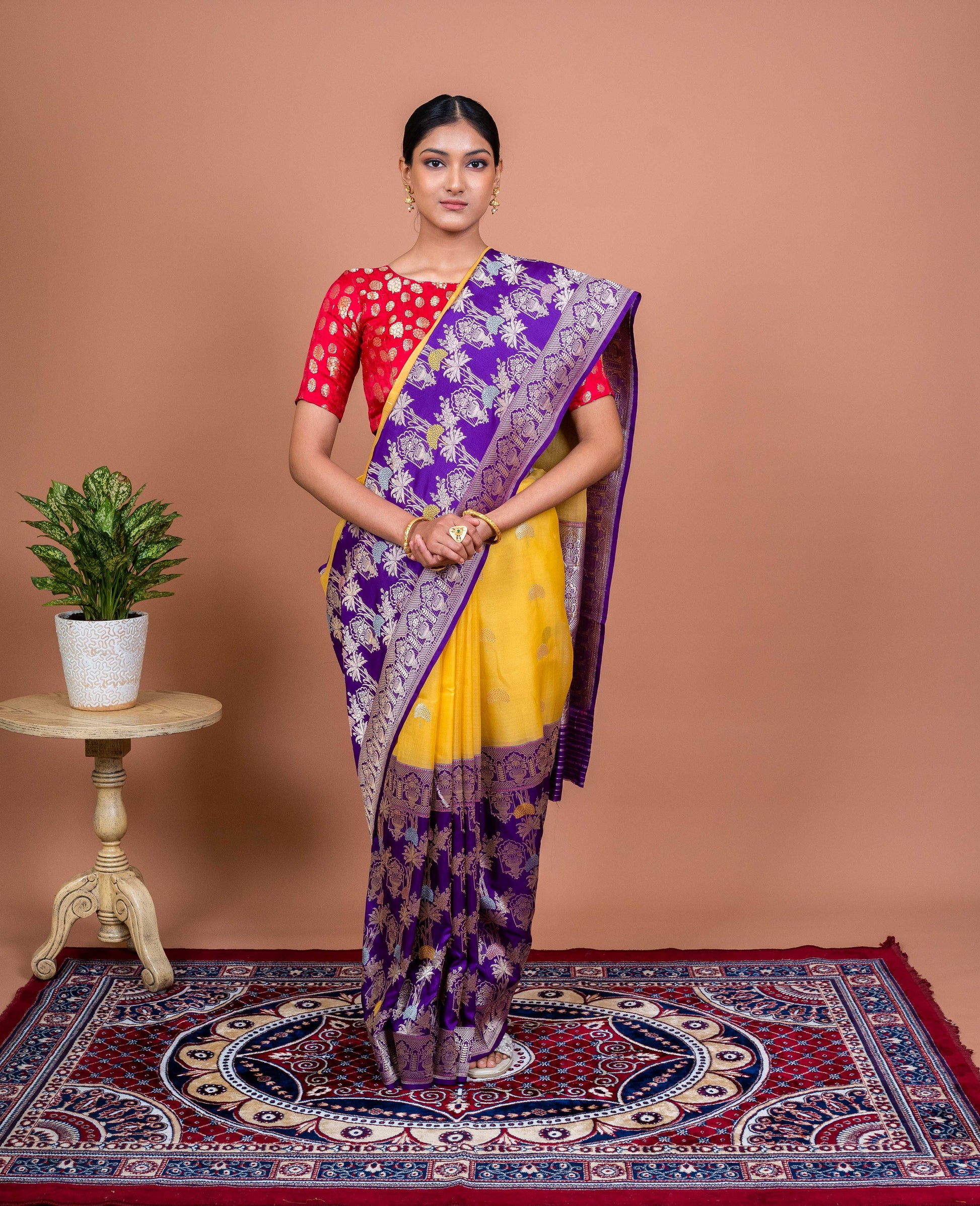 Crafted with Precision – Handwoven by master artisans in Banaras, every inch of this saree reflects the skill and dedication of the craftsmen. The intricate Jaal motifs are woven with the utmost care, adding depth and texture to the fabric that tells a tale of heritage passed down through generations.