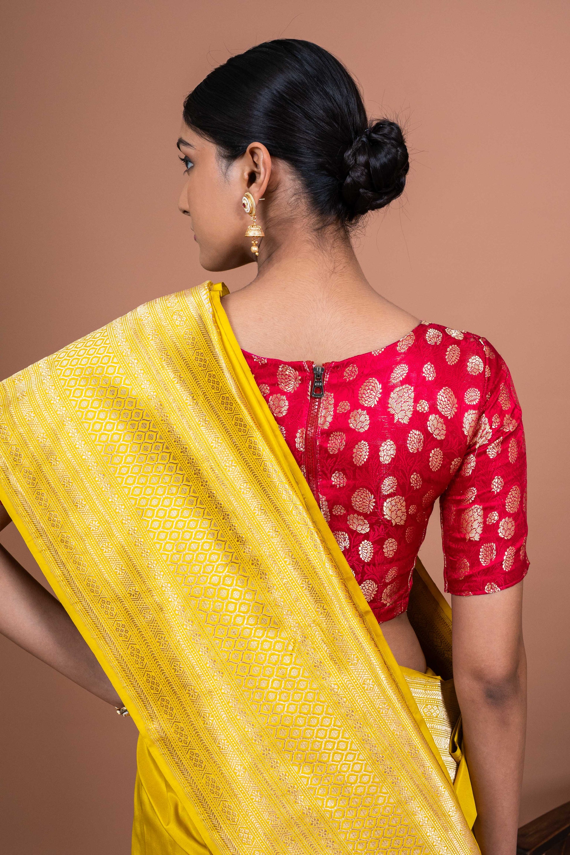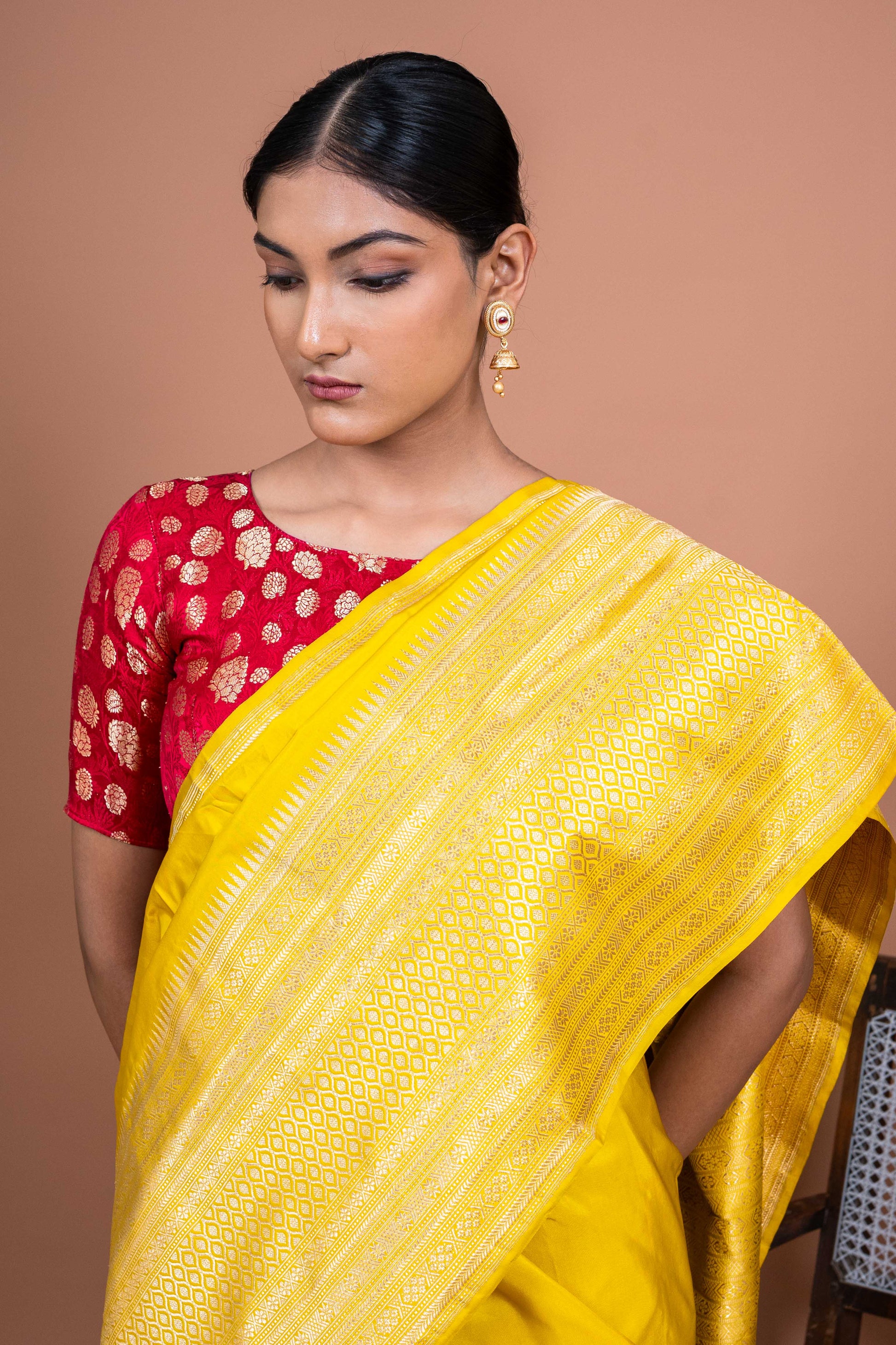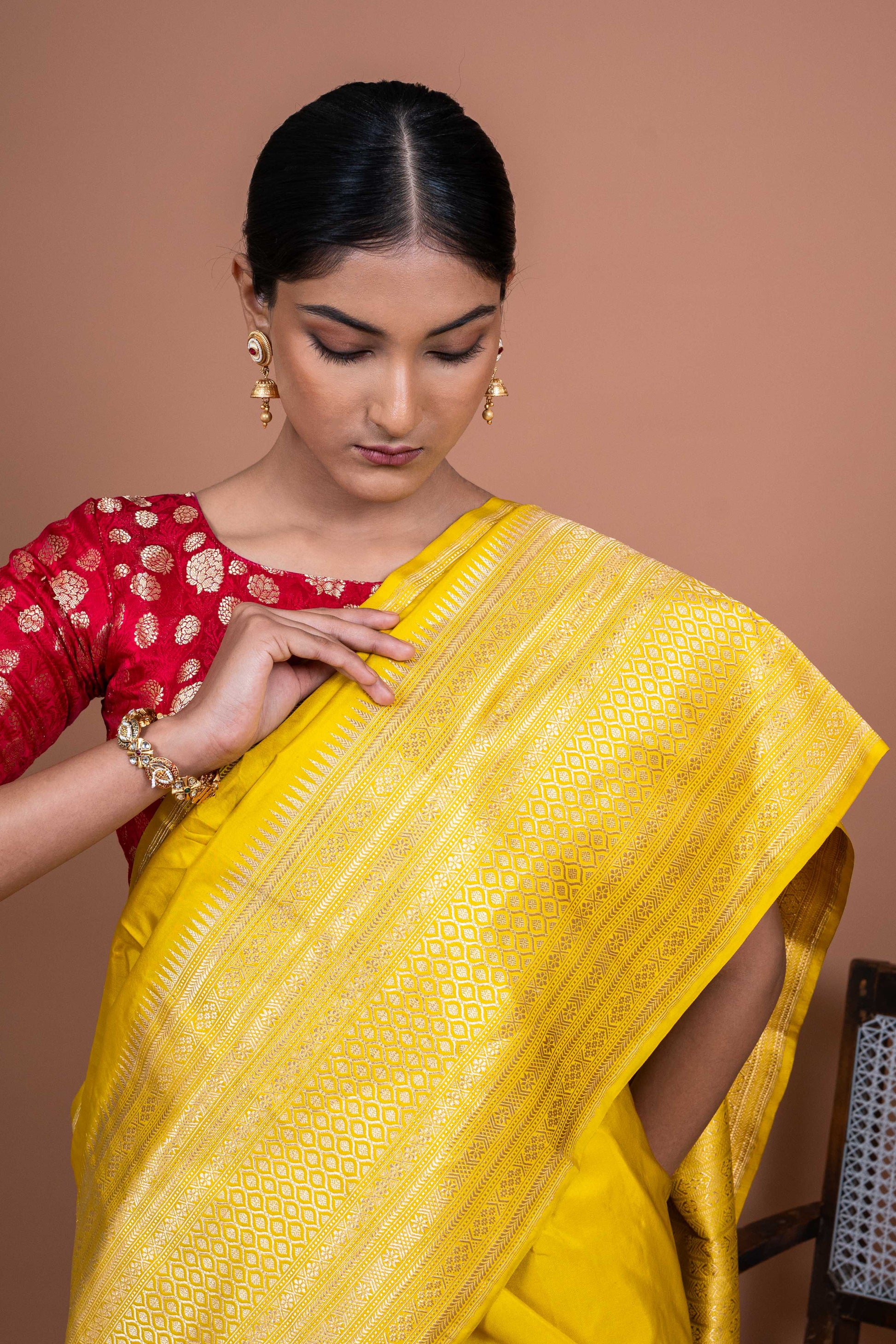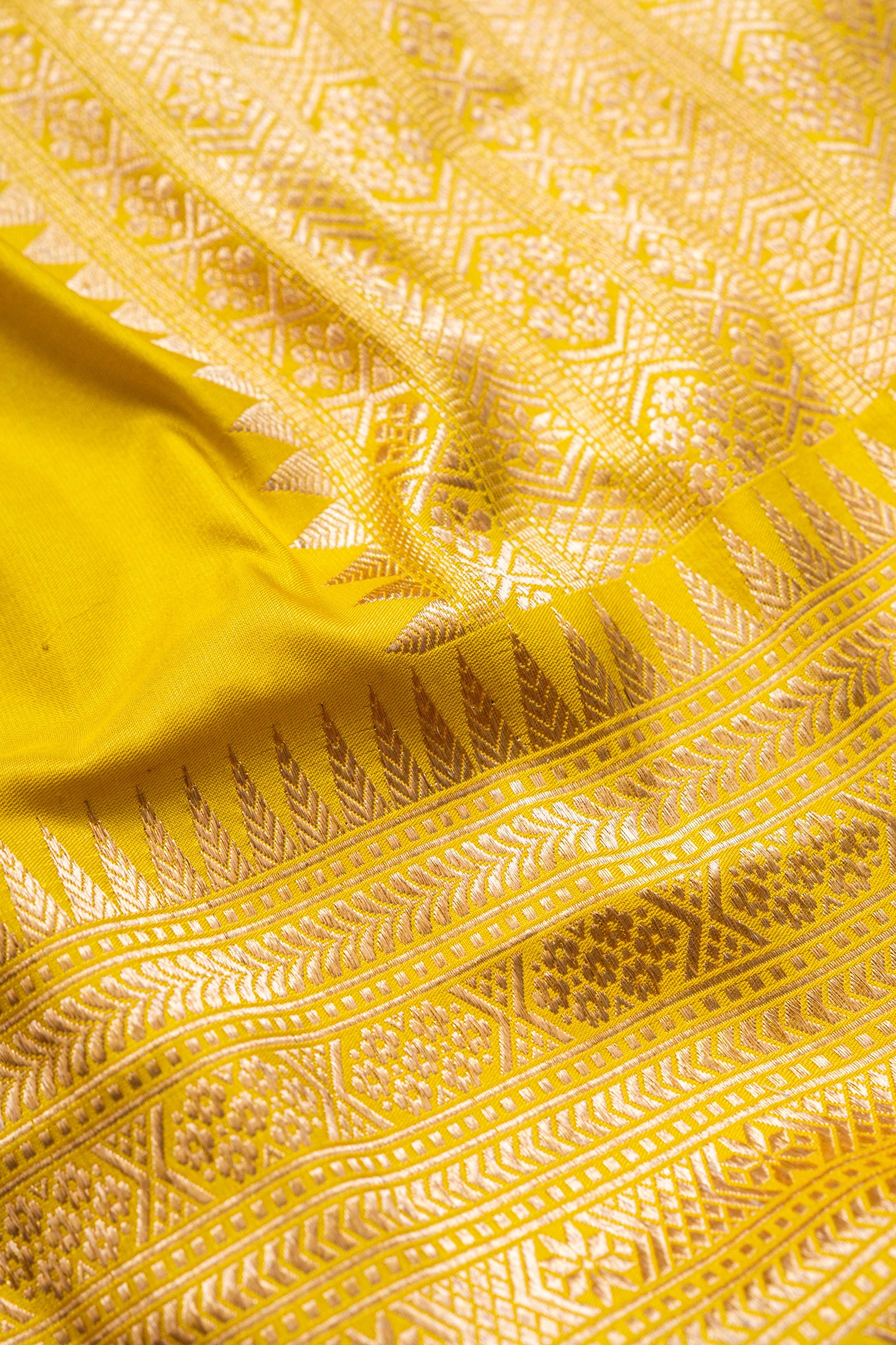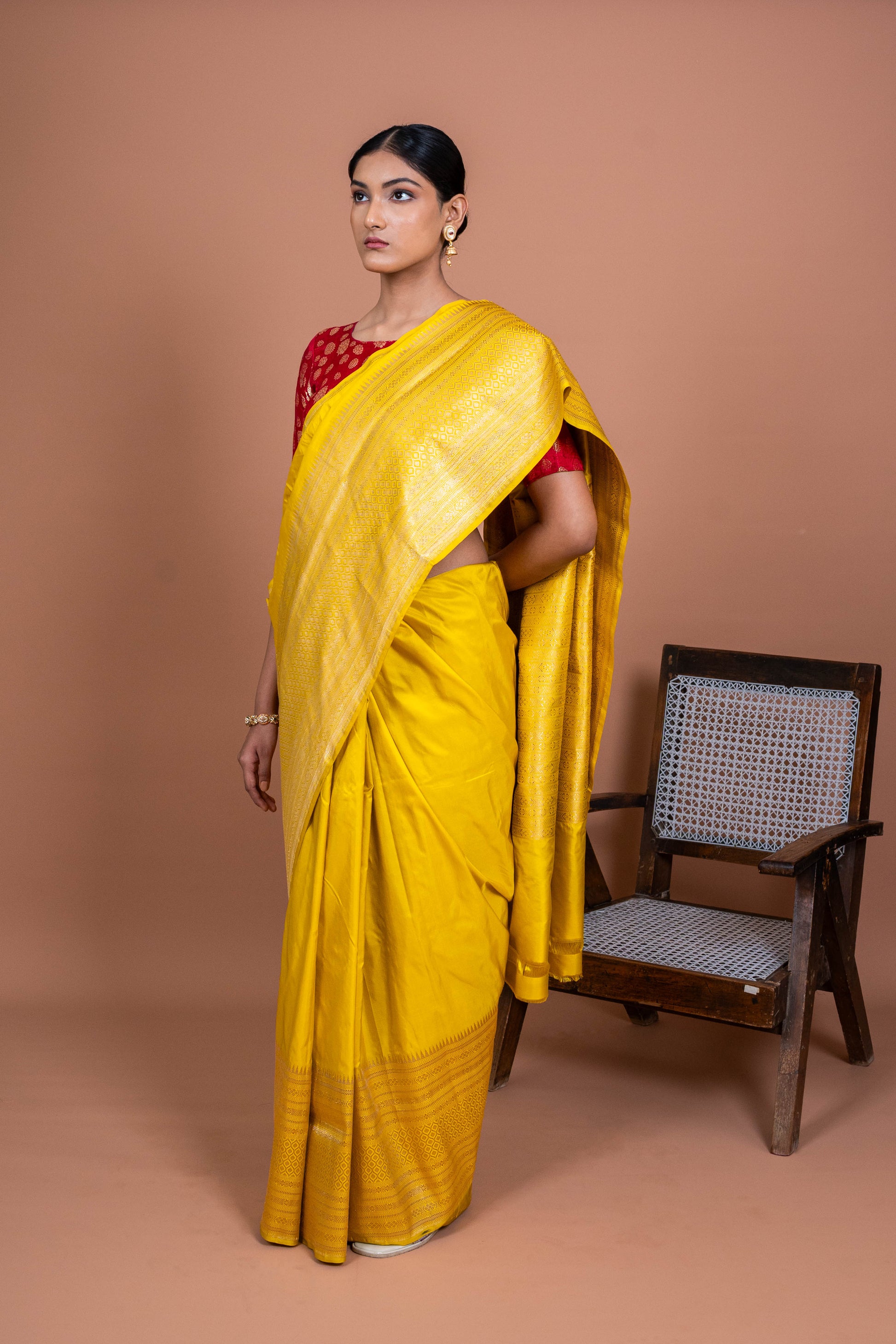 Woven by the hands of skilled artisans, each thread in this saree tells a story of craftsmanship passed down through generations. The delicate patterns on the border reflect the timeless beauty of Banarasi weaving, while the rich yellow color embodies positivity and energy.
