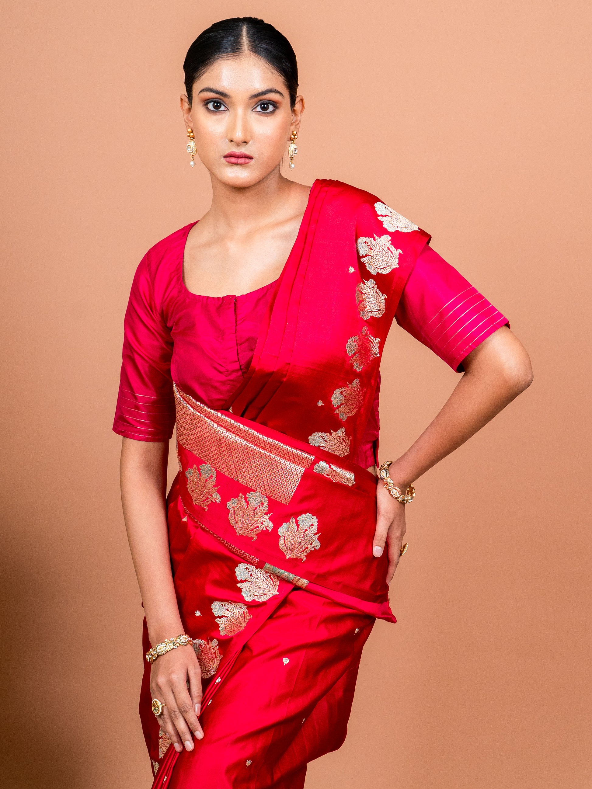 Some sarees don’t just add to your wardrobe; they become a part of your story. The Meenakar Boota Handwoven Banarasi Silk Saree is one such masterpiece. Drenched in a deep, regal red and adorned with delicate meenakari boota work, this saree carries the legacy of Banaras in every weave.