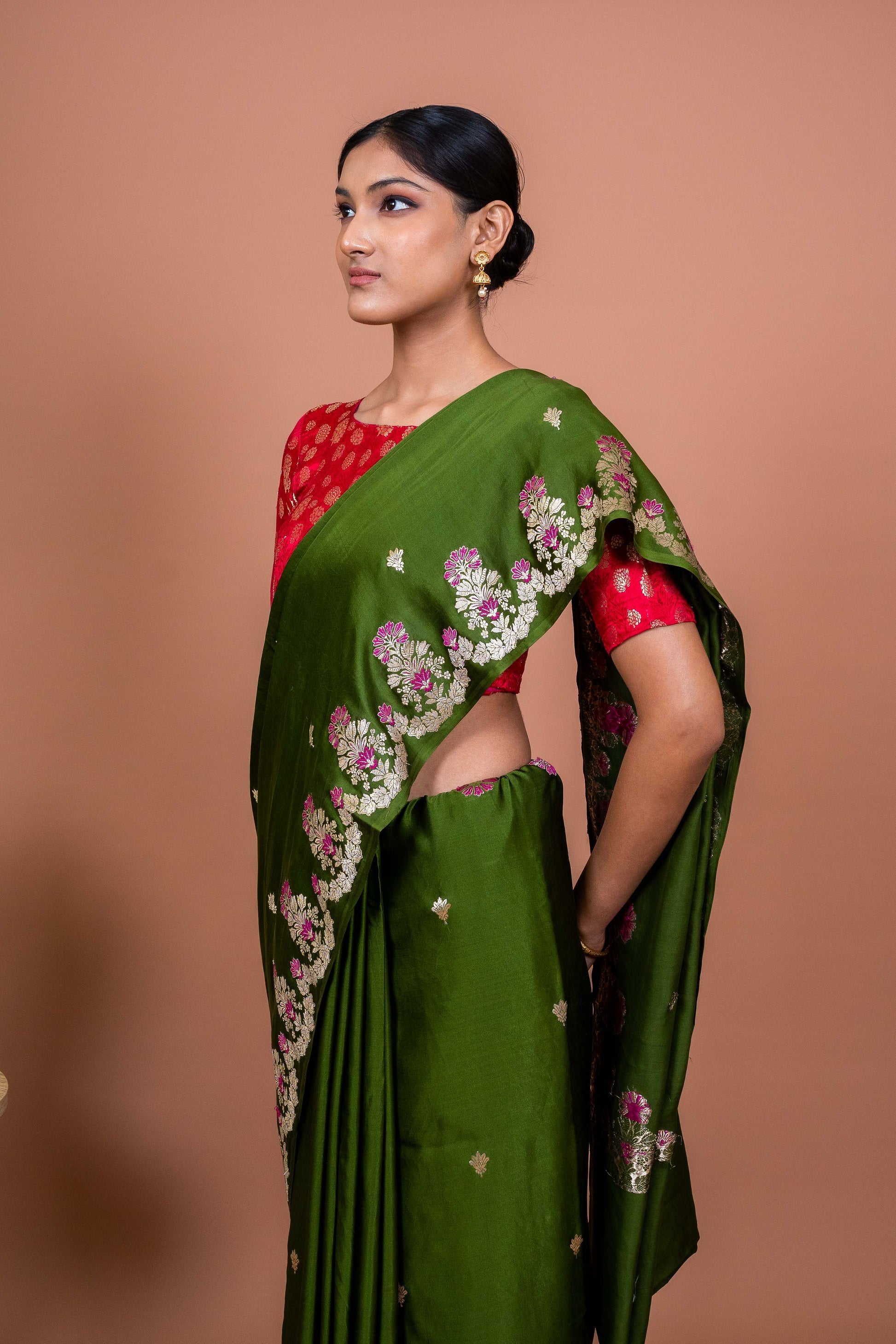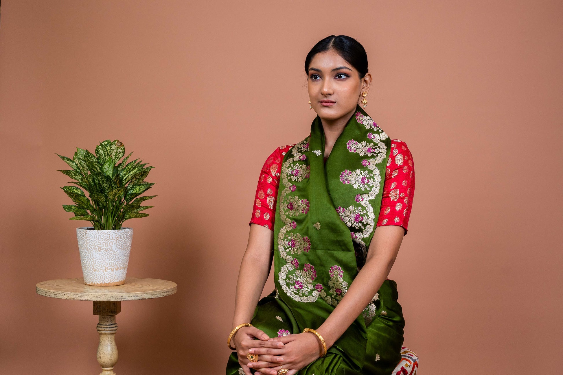A celebration of artistry and tradition, the Meenakar Border Handwoven Banarasi Saree in a rich, verdant green brings a fresh elegance to timeless craftsmanship.