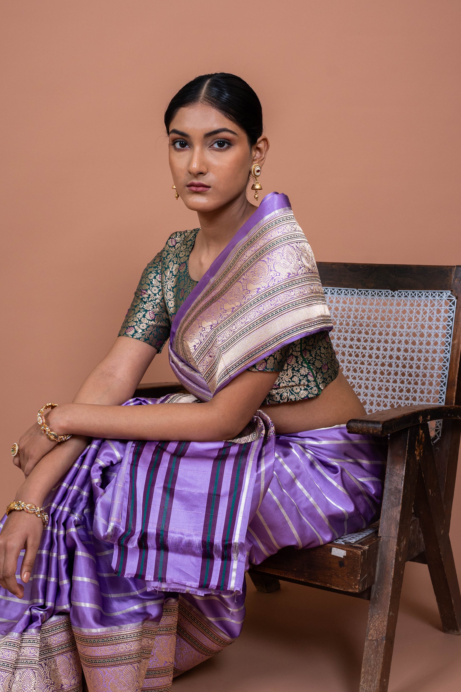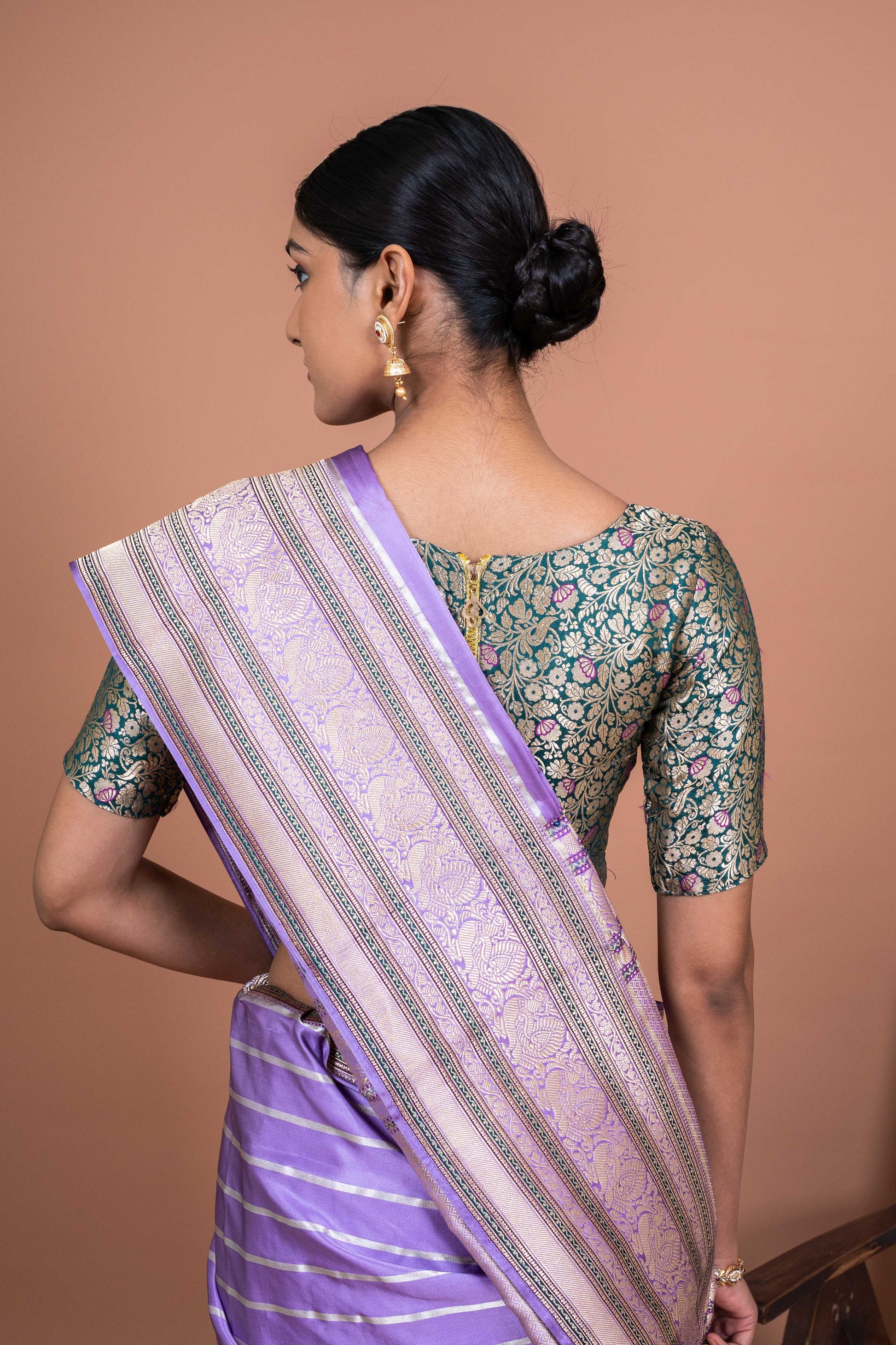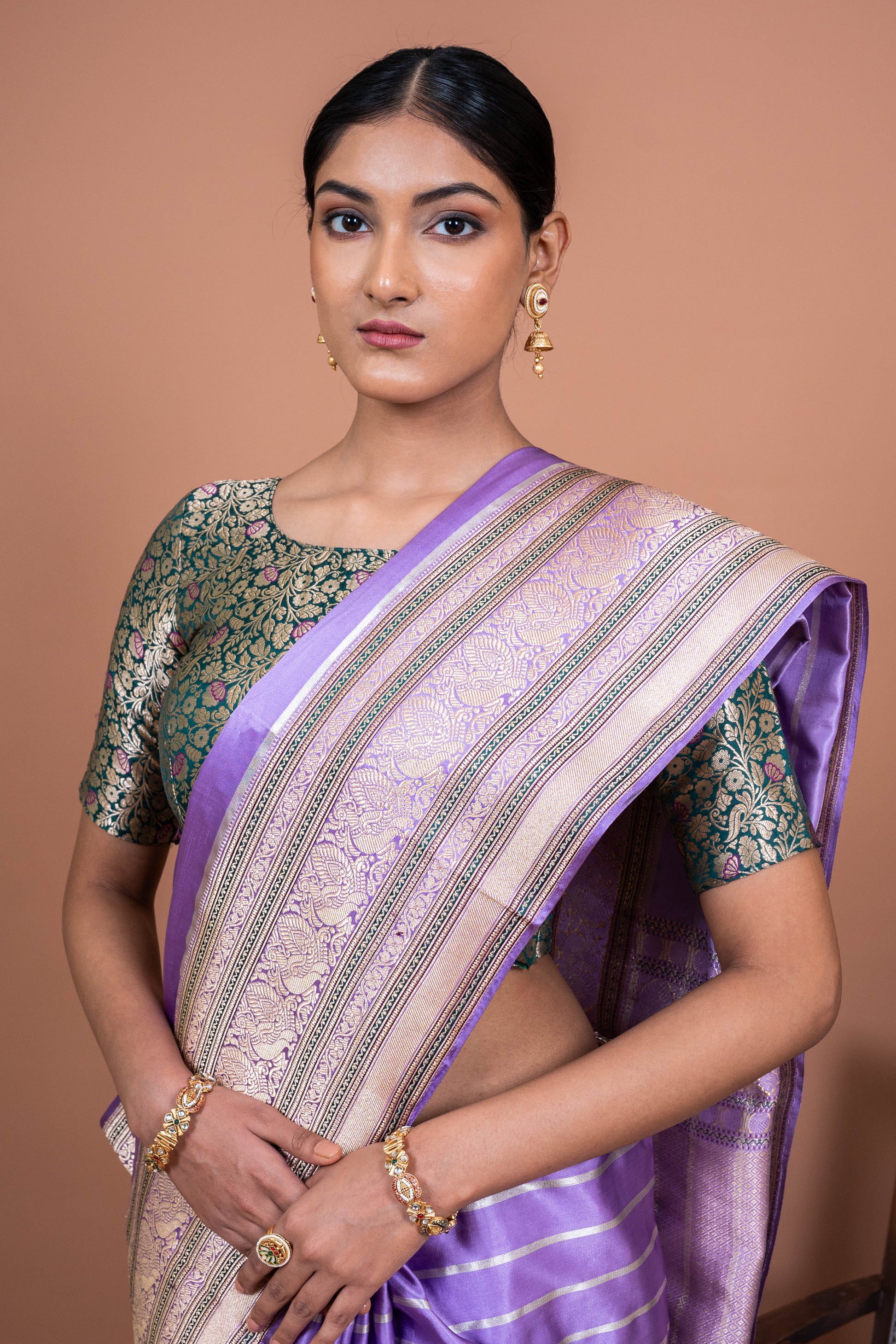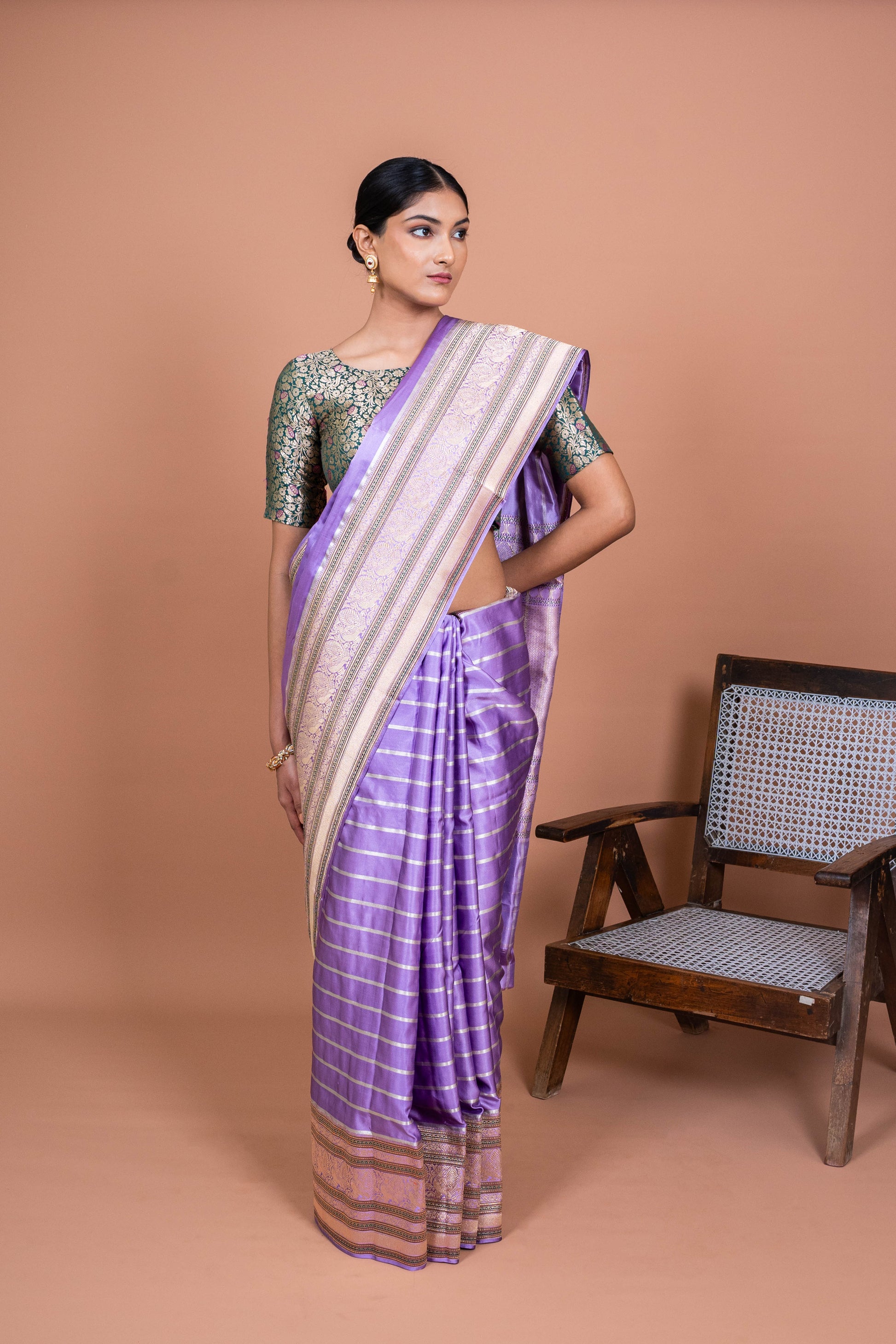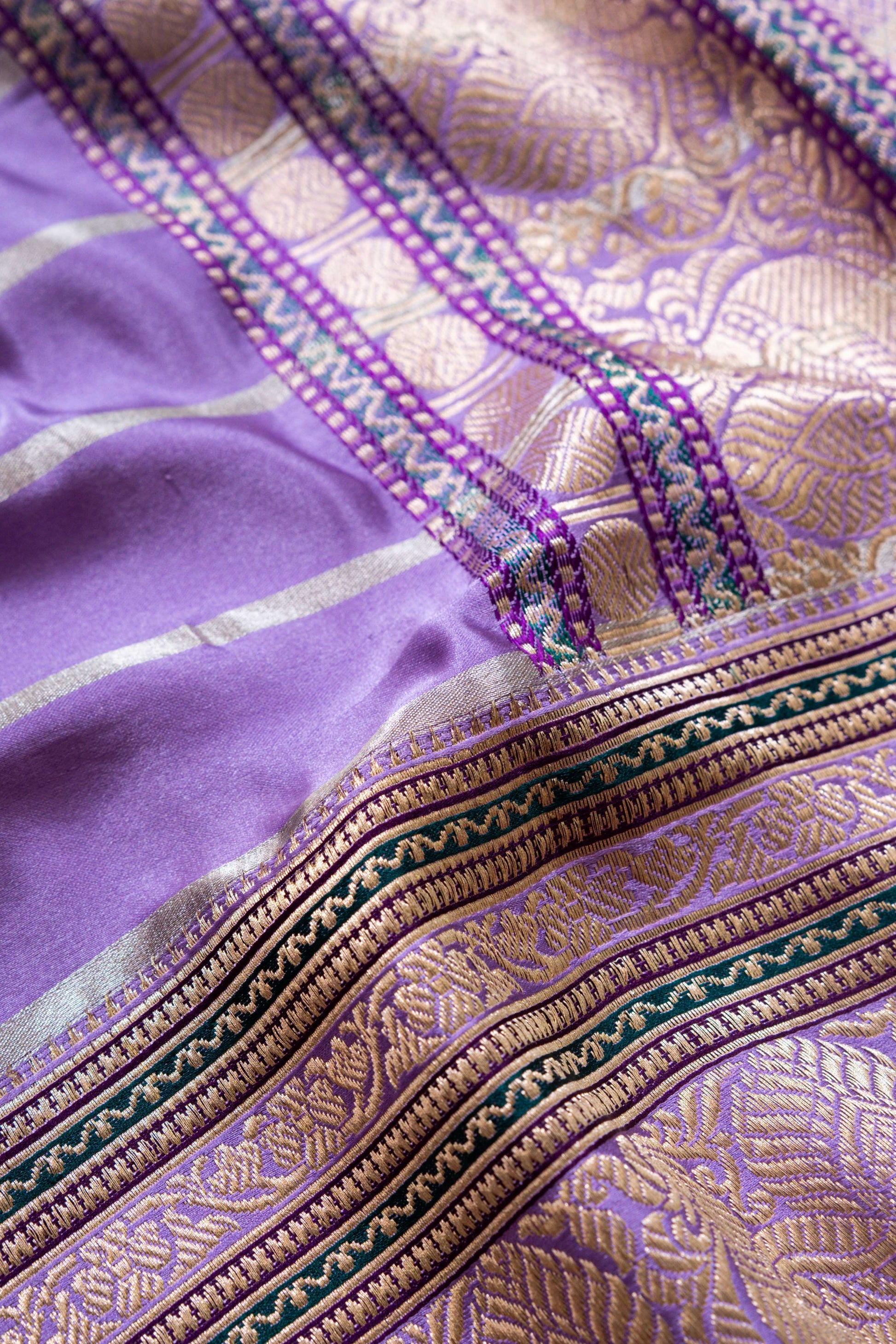 Whether you're attending a wedding, an evening gala, or a family gathering, the Meenakshi Handwoven Banaras Sareewill make you feel like the center of attention, effortlessly blending tradition with timeless beauty. It's more than just fabric; it's a piece of cultural history, lovingly crafted to make you shine with every step you take. Let the elegance of lavender and the art of Banaras weaving transform your special moments.