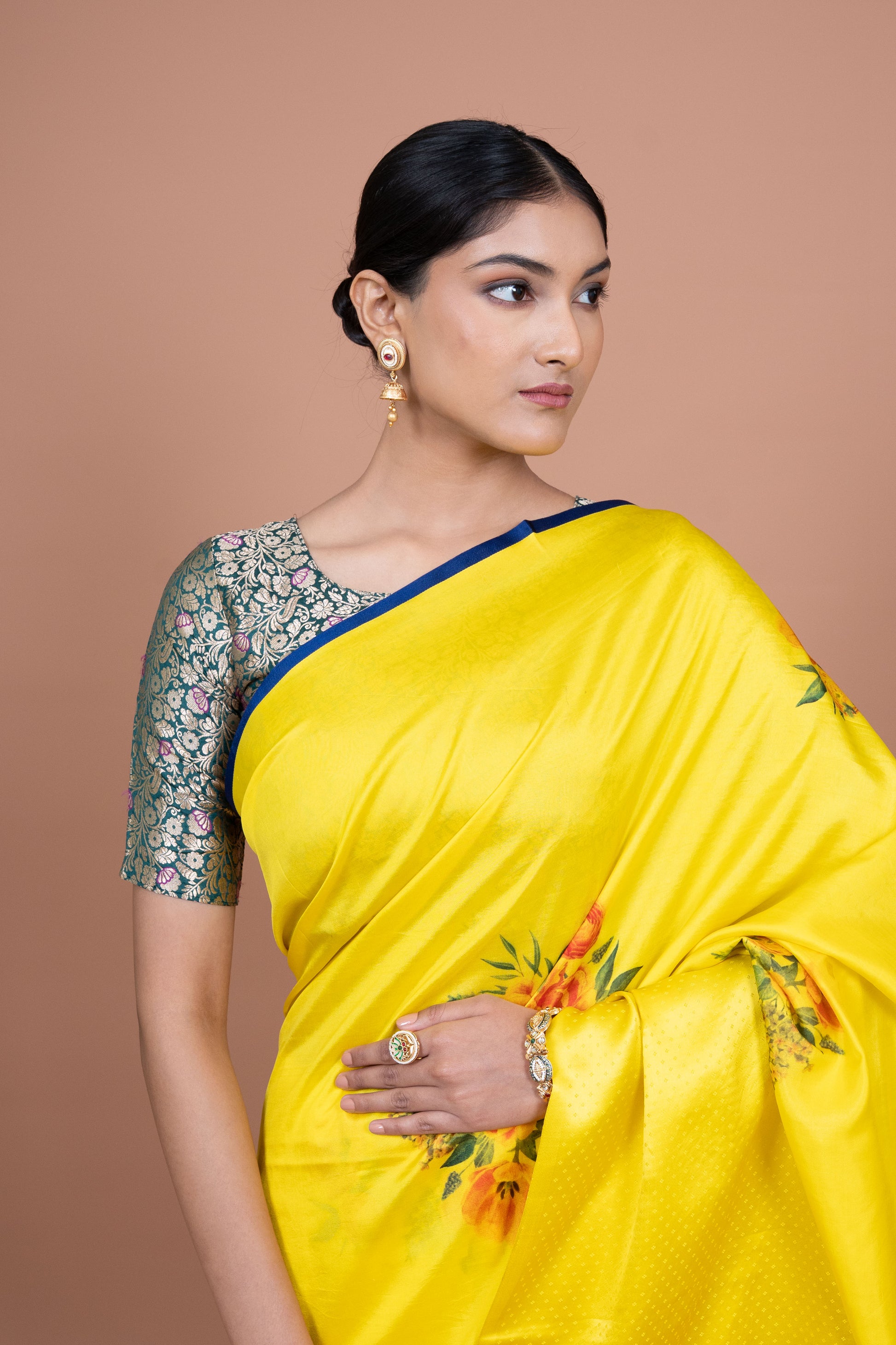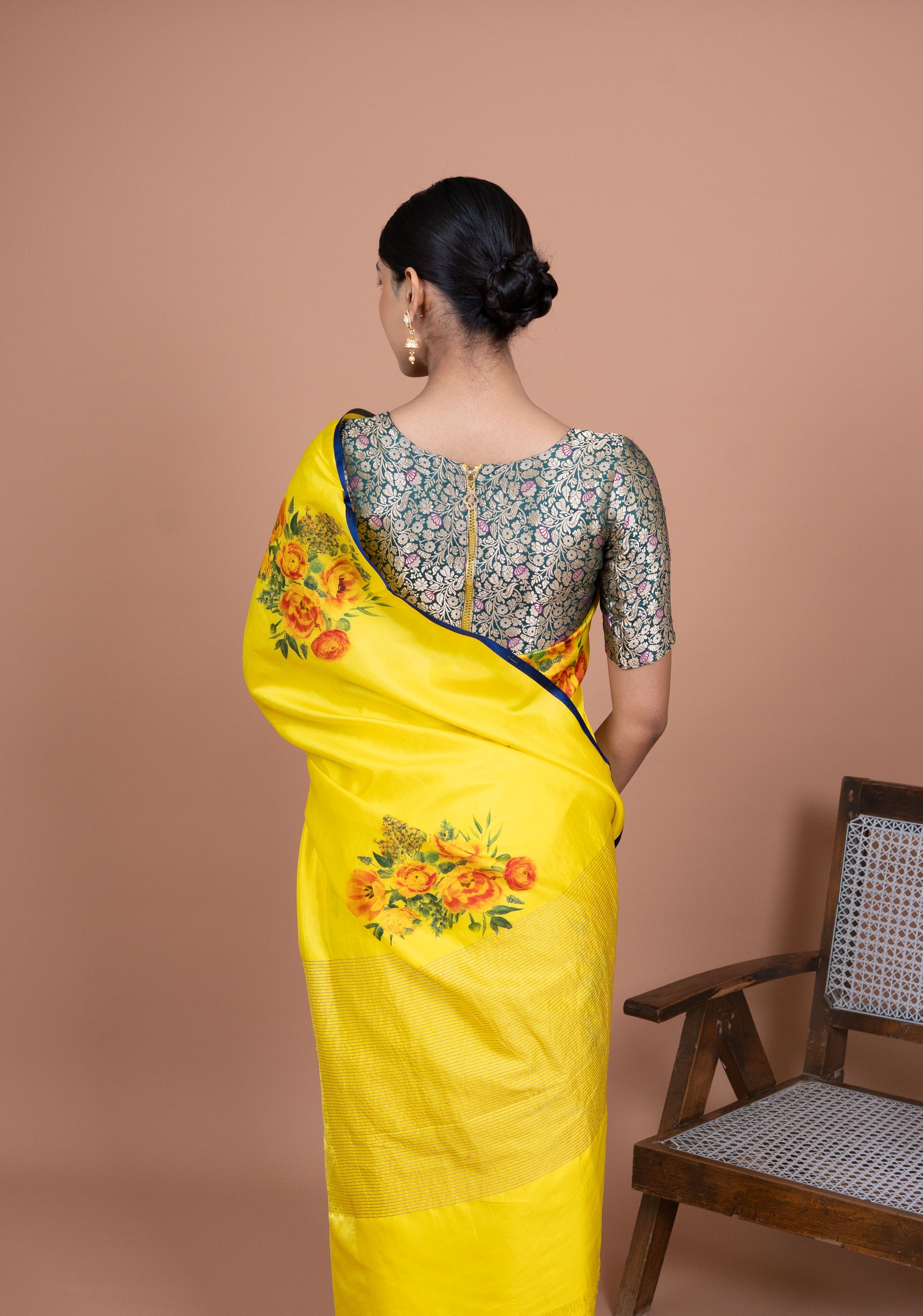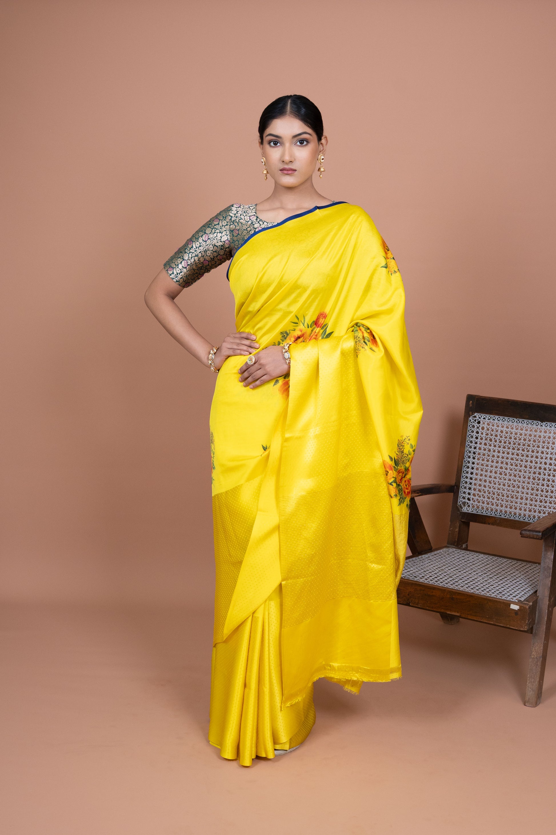 The Meera Handwoven Banaras Saree in a radiant yellow is a stunning testament to the craftsmanship and artistry of Banarasi weaving. The vibrant yellow hue speaks of joy, energy, and positivity, making it the perfect choice for a celebration of life, love, and heritage.