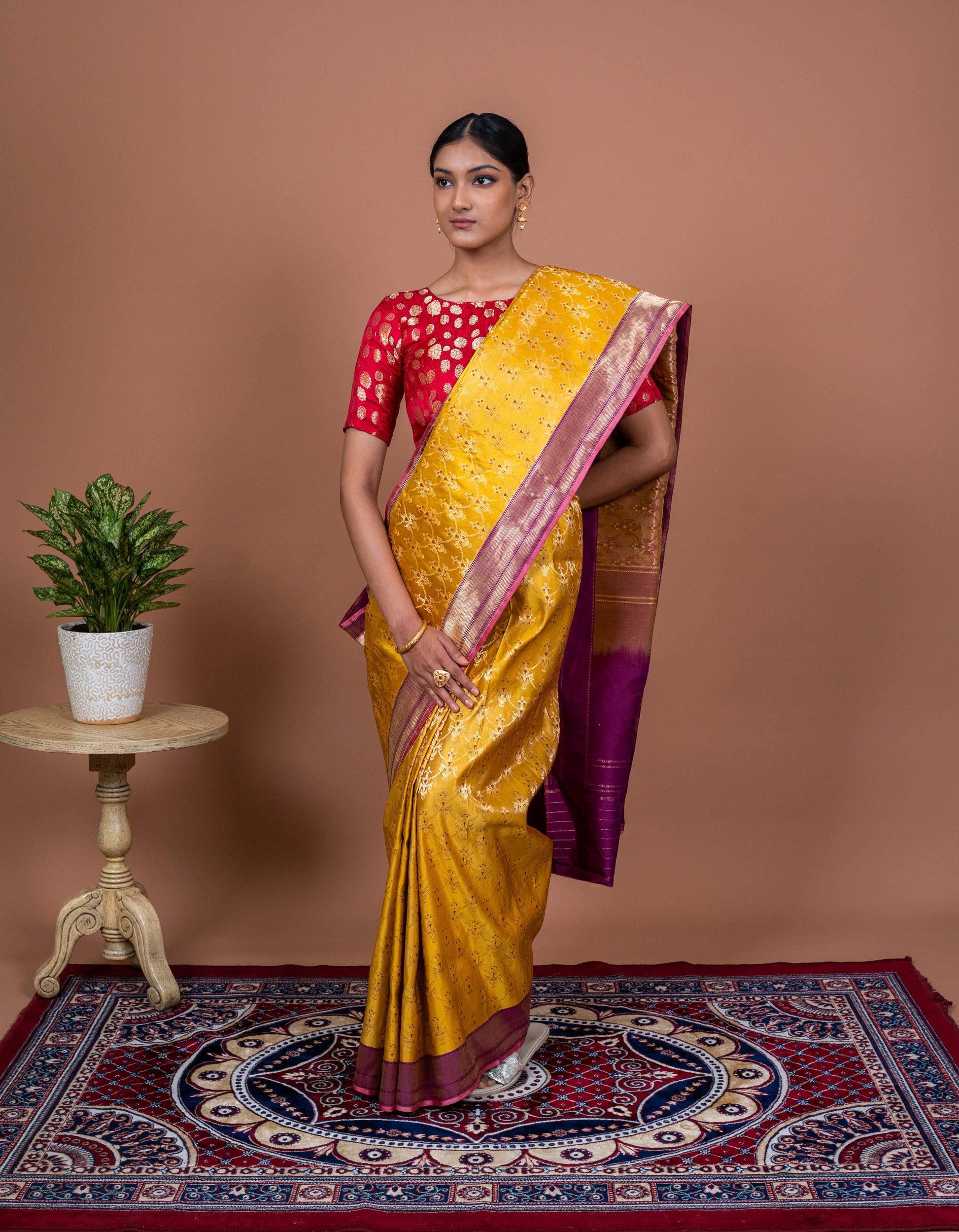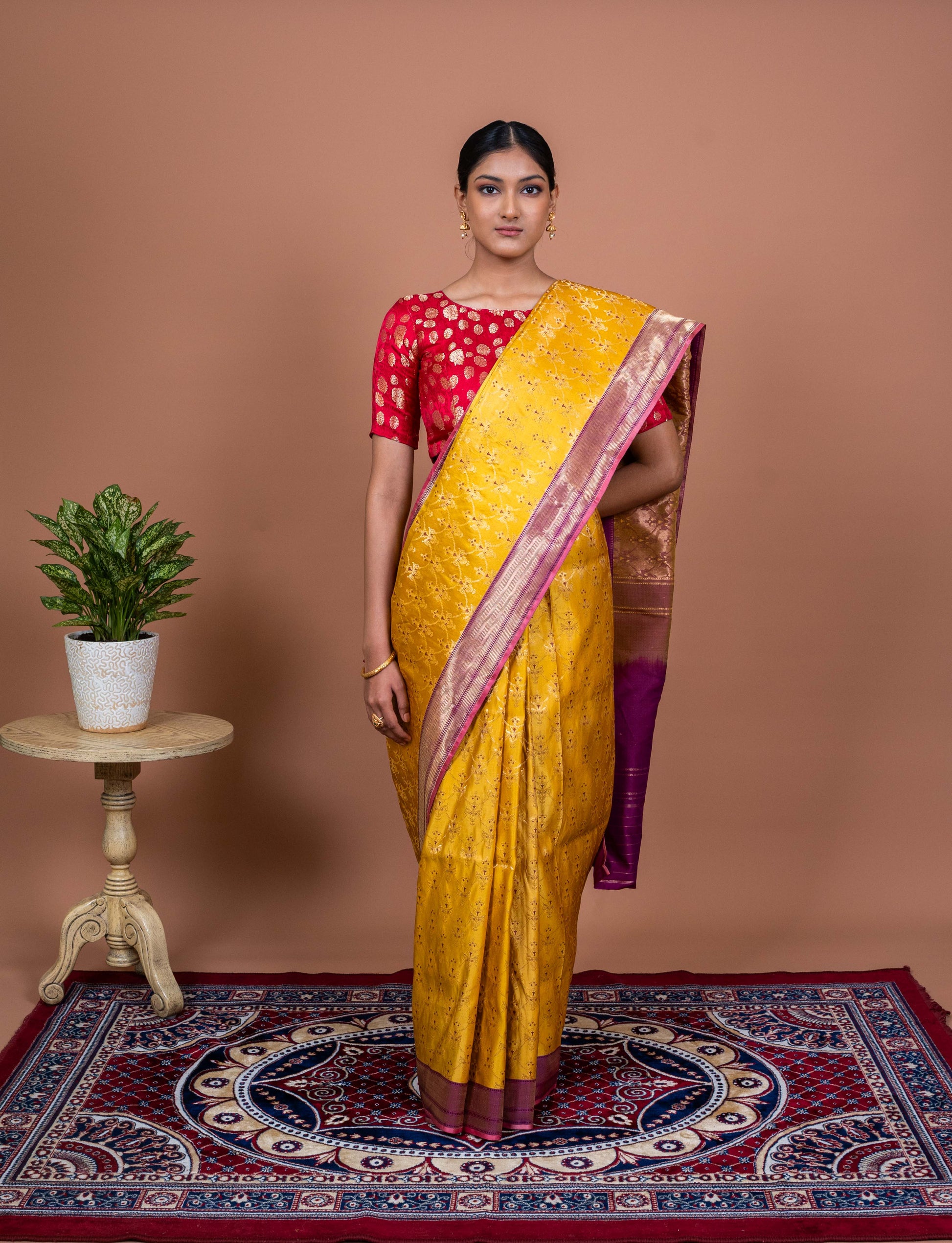 A Golden Glow – The warm yellow of this saree glows like sunshine, bringing brightness to your day and infusing a sense of positivity wherever you go. It’s more than just a colour; it’s an aura of celebration and festivity.