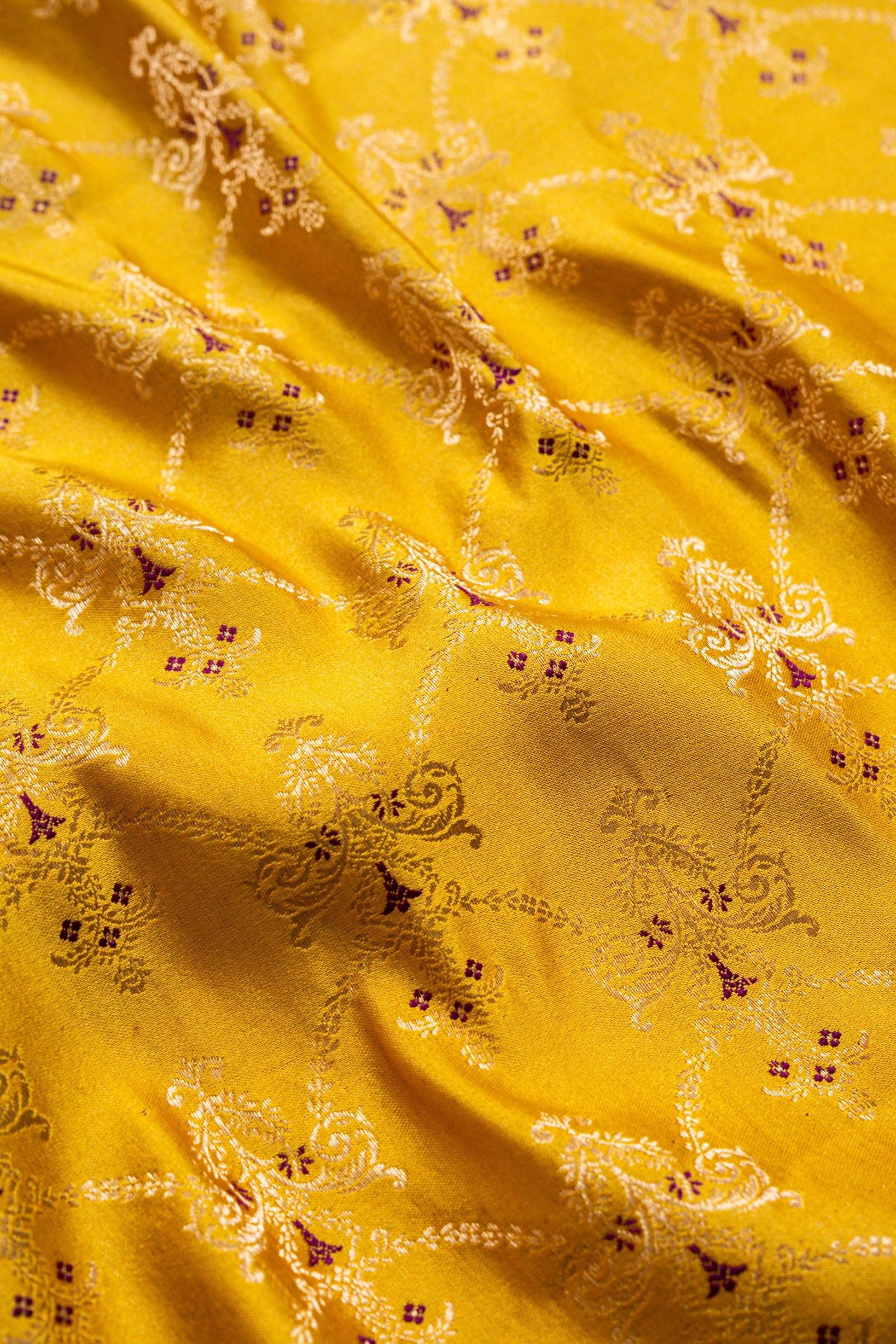The Mehraab Jaal Handwoven Banaras Saree in yellow is a radiant embodiment of joy and elegance, weaving together tradition and contemporary charm.