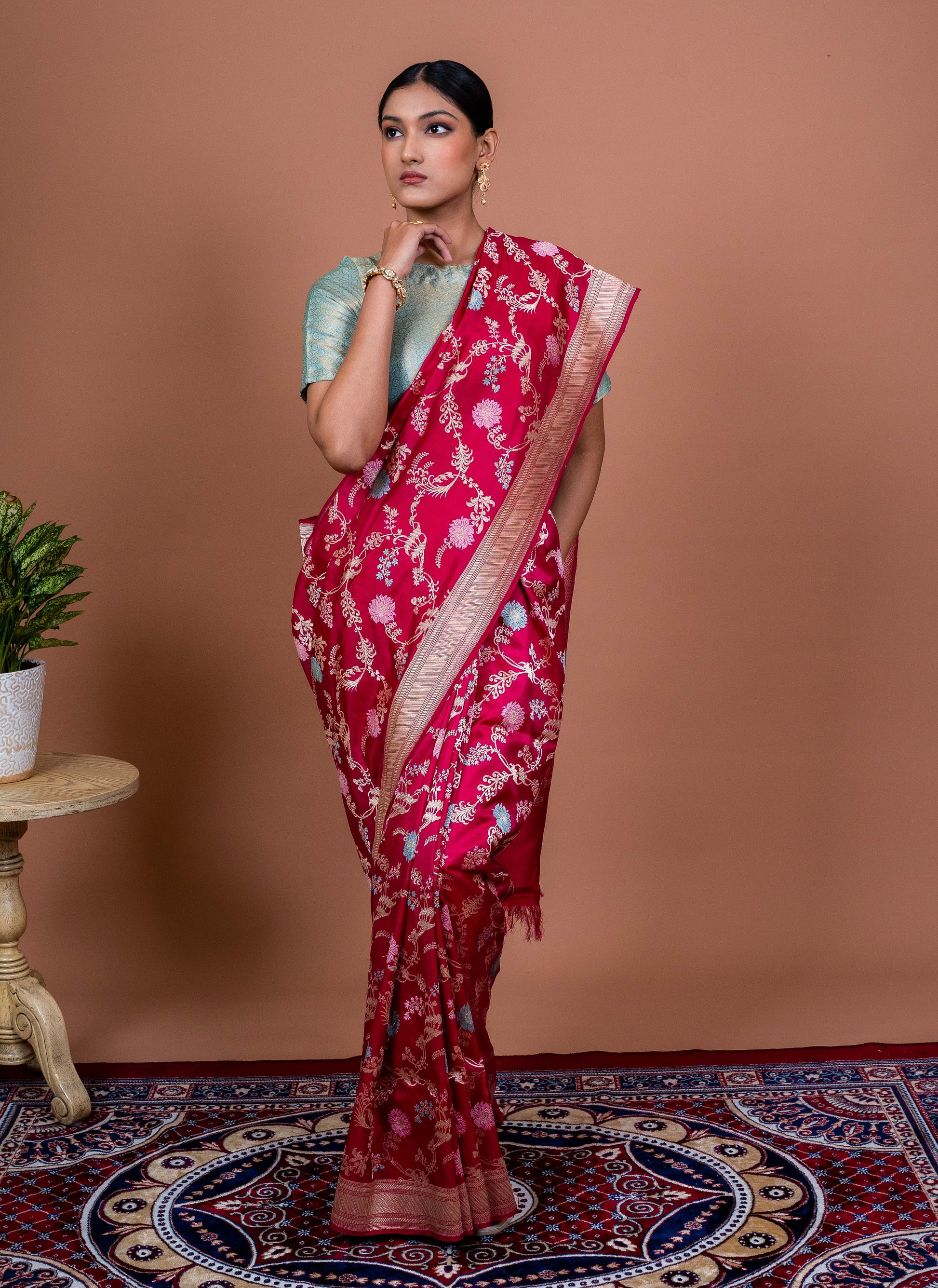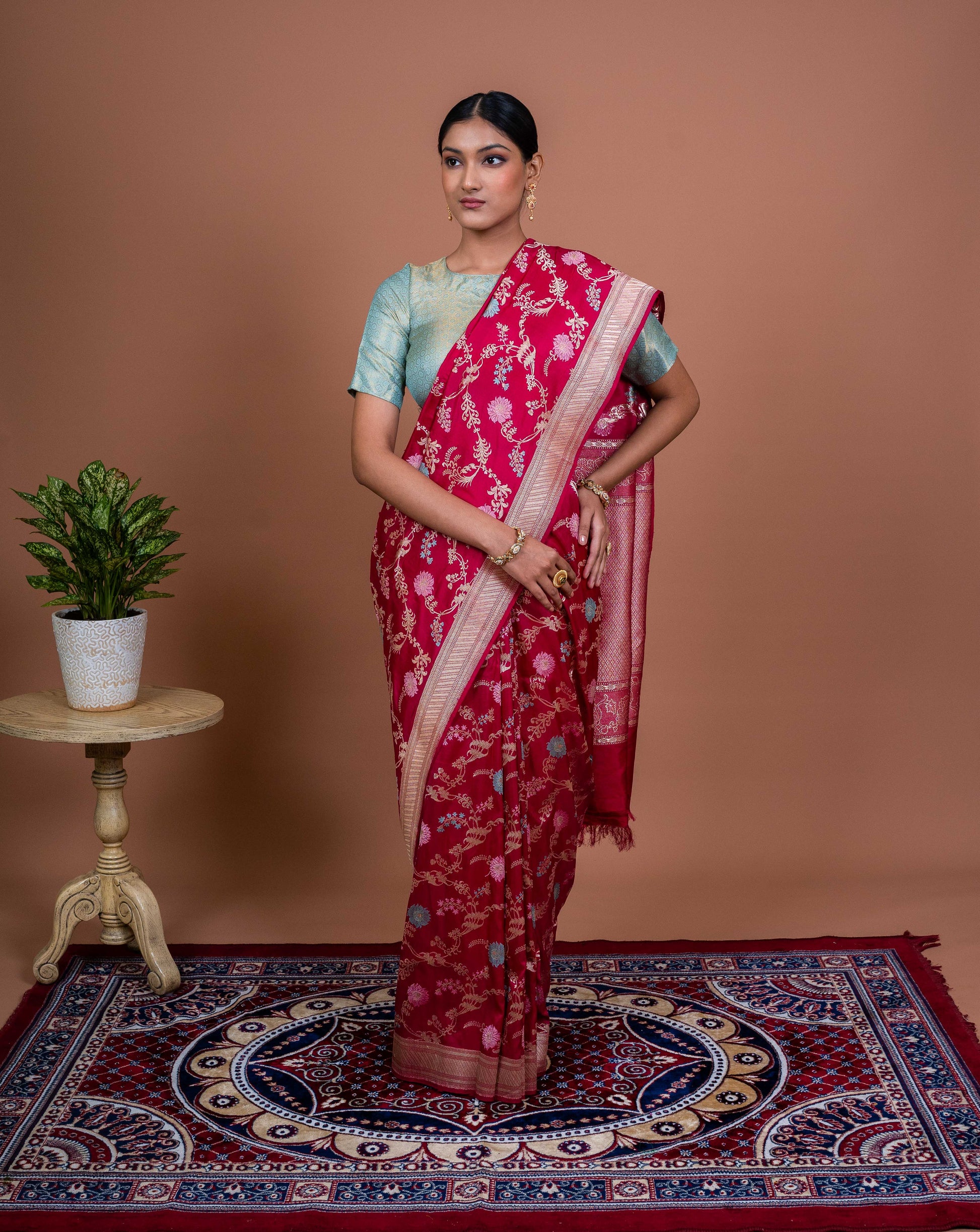 Draped in heritage, woven with devotion—the Mehreem Handwoven Banarasi Saree is an ode to timeless beauty, bathed in the passionate depth of red.