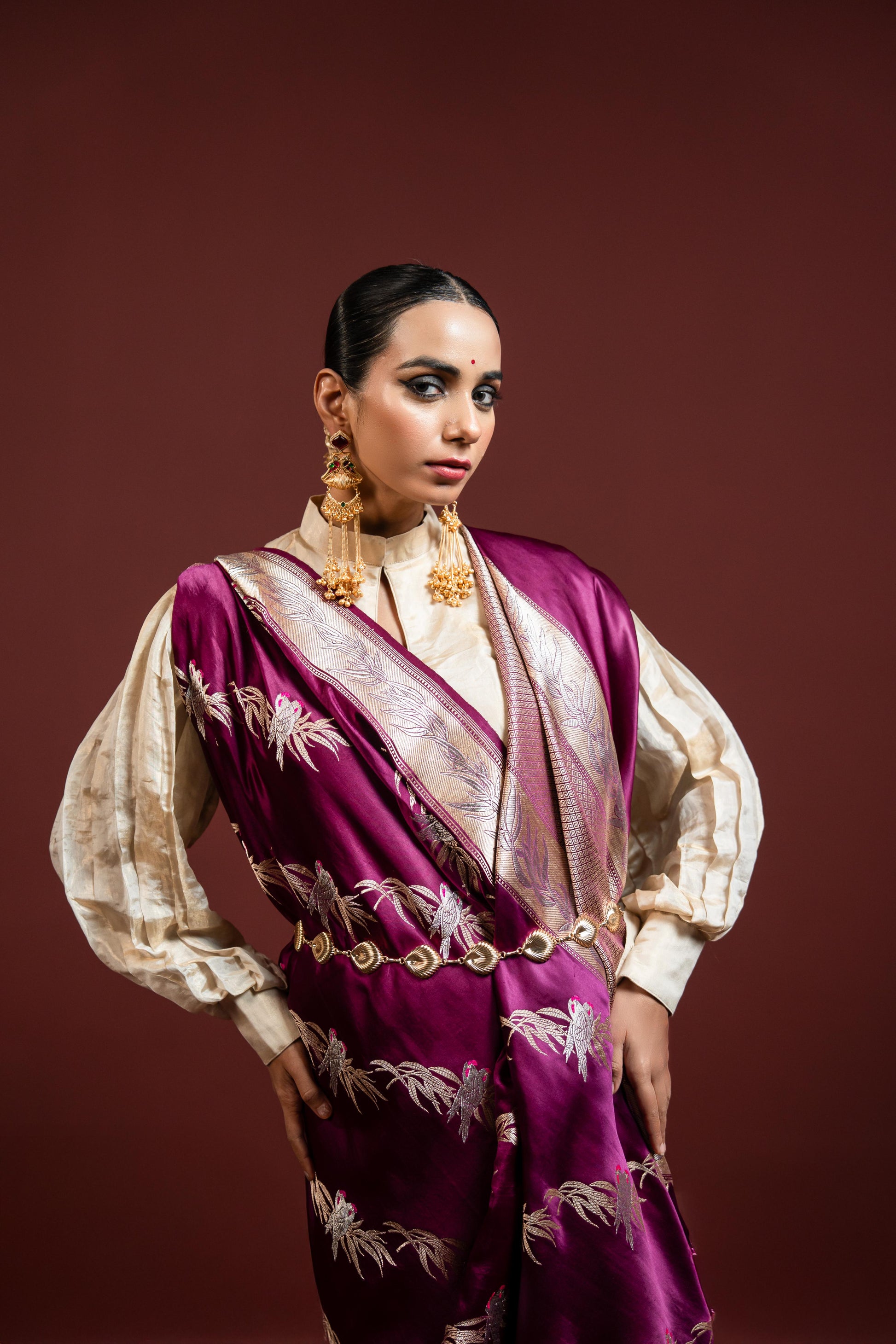 Naina is a saree that speaks through presence rather than volume. Drenched in a deep wine-purple hue, it is adorned with delicate floral weaving in soft metallic tones—creating a rich yet composed visual narrative. The contrast border adds structure, while the intricate detailing reflects refined craftsmanship rooted in tradition.