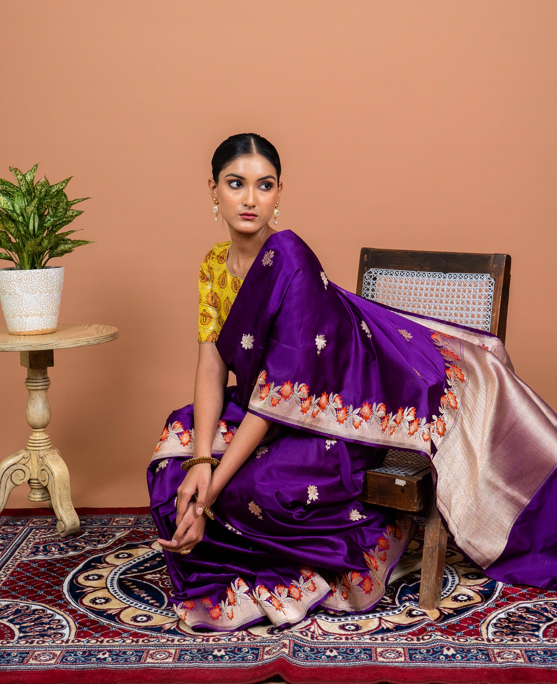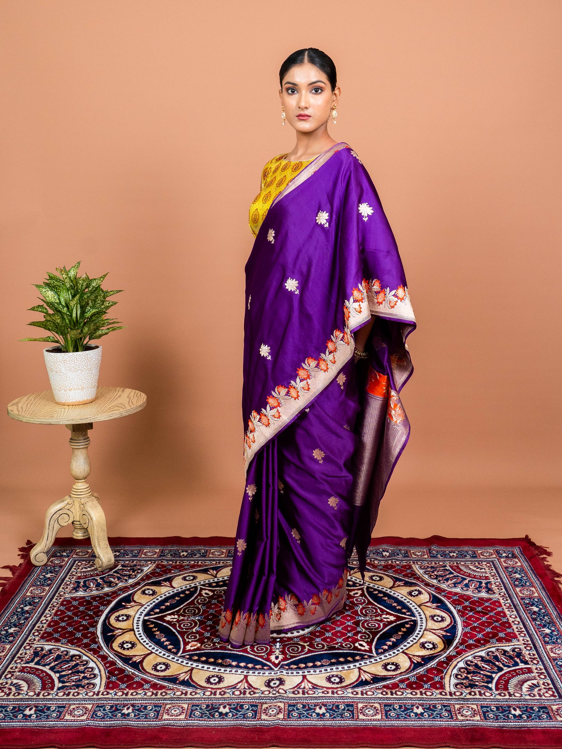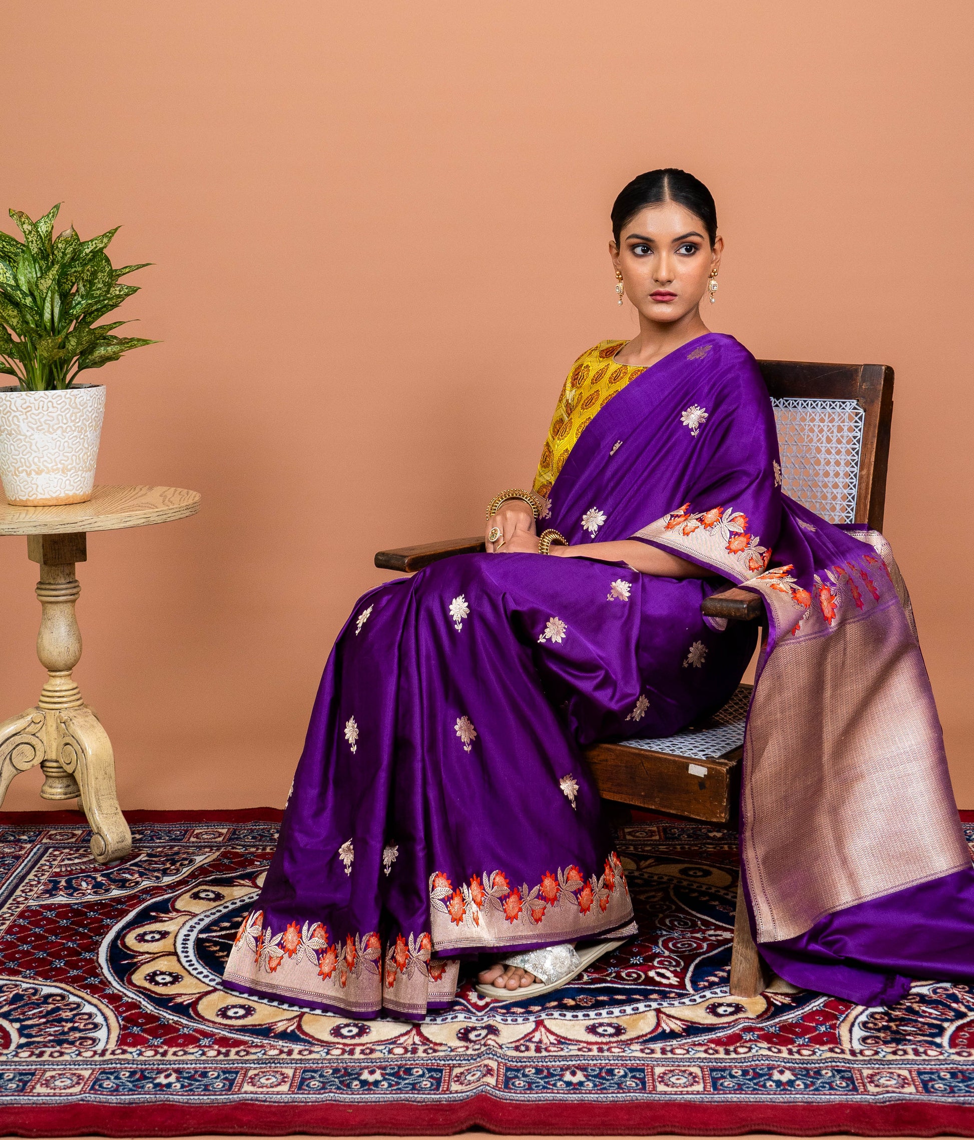 There’s a quiet elegance in simplicity, and the Namra Handwoven Banarasi Silk Saree in a deep, regal purple embodies just that. Woven with precision and care, this saree is for the woman who doesn’t need to chase attention—she commands it effortlessly. The fine silk drapes like a dream, while the subtle handwoven patterns whisper tales of tradition and artistry.