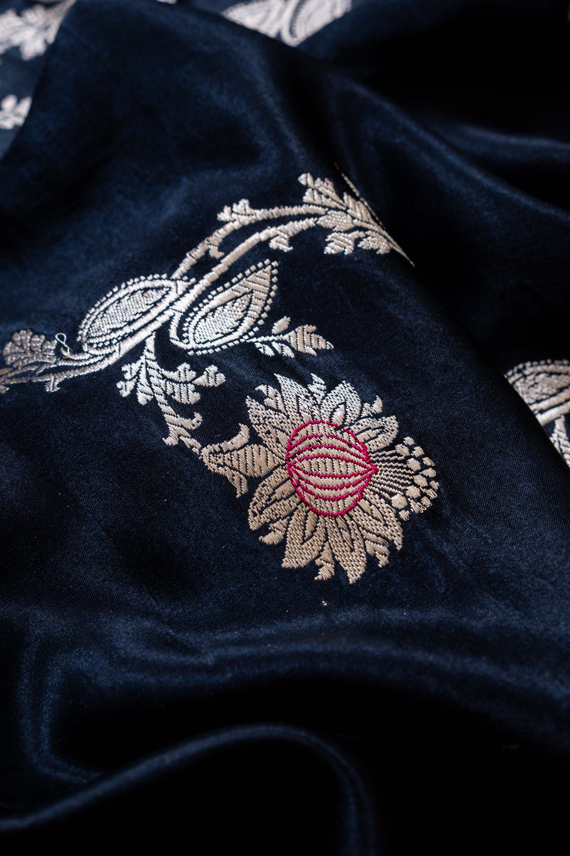 Drenched in mystery and elegance, the Neer Handwoven Banarasi Saree in deep black is a vision of timeless grace. It whispers sophistication while carrying the legacy of fine craftsmanship.