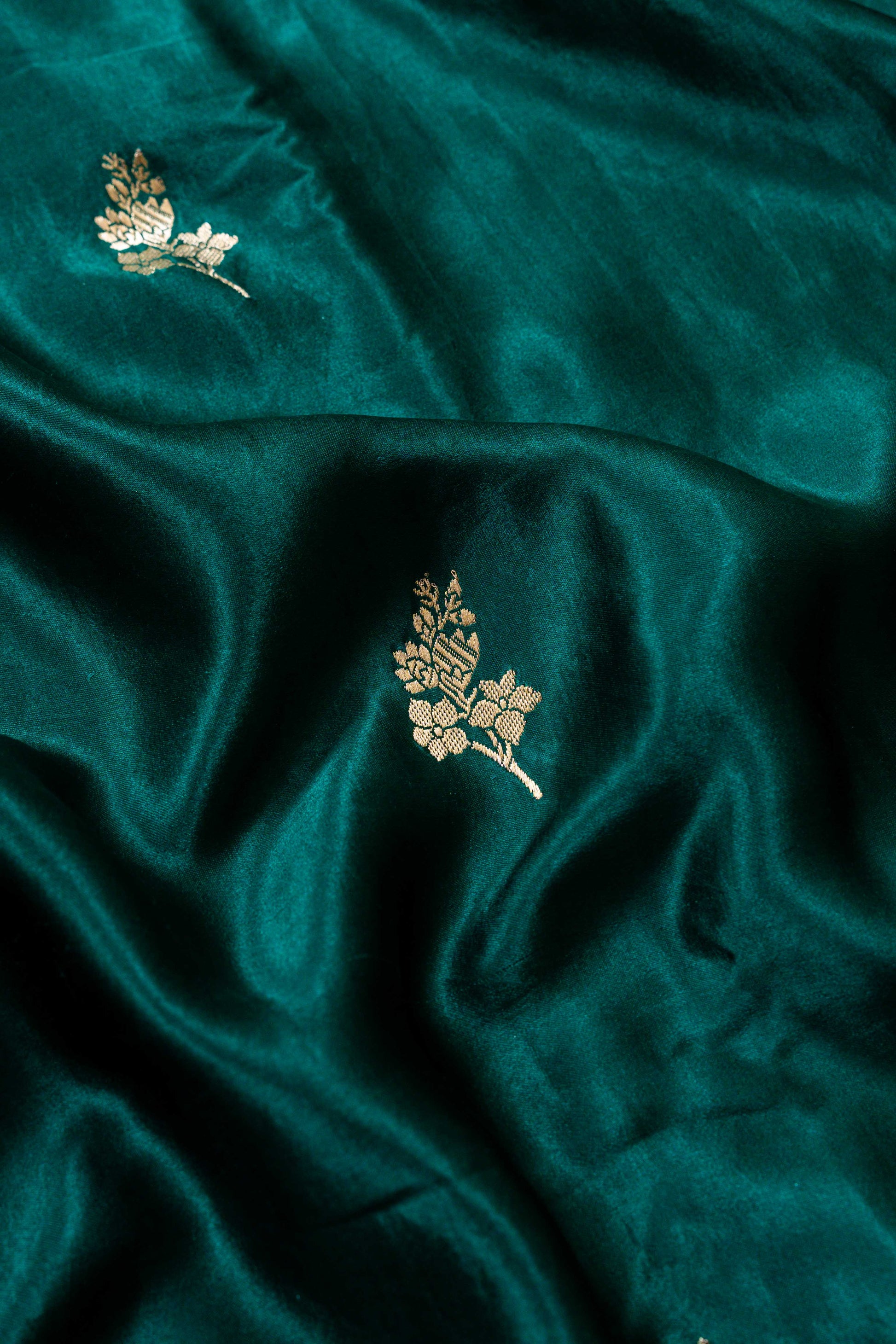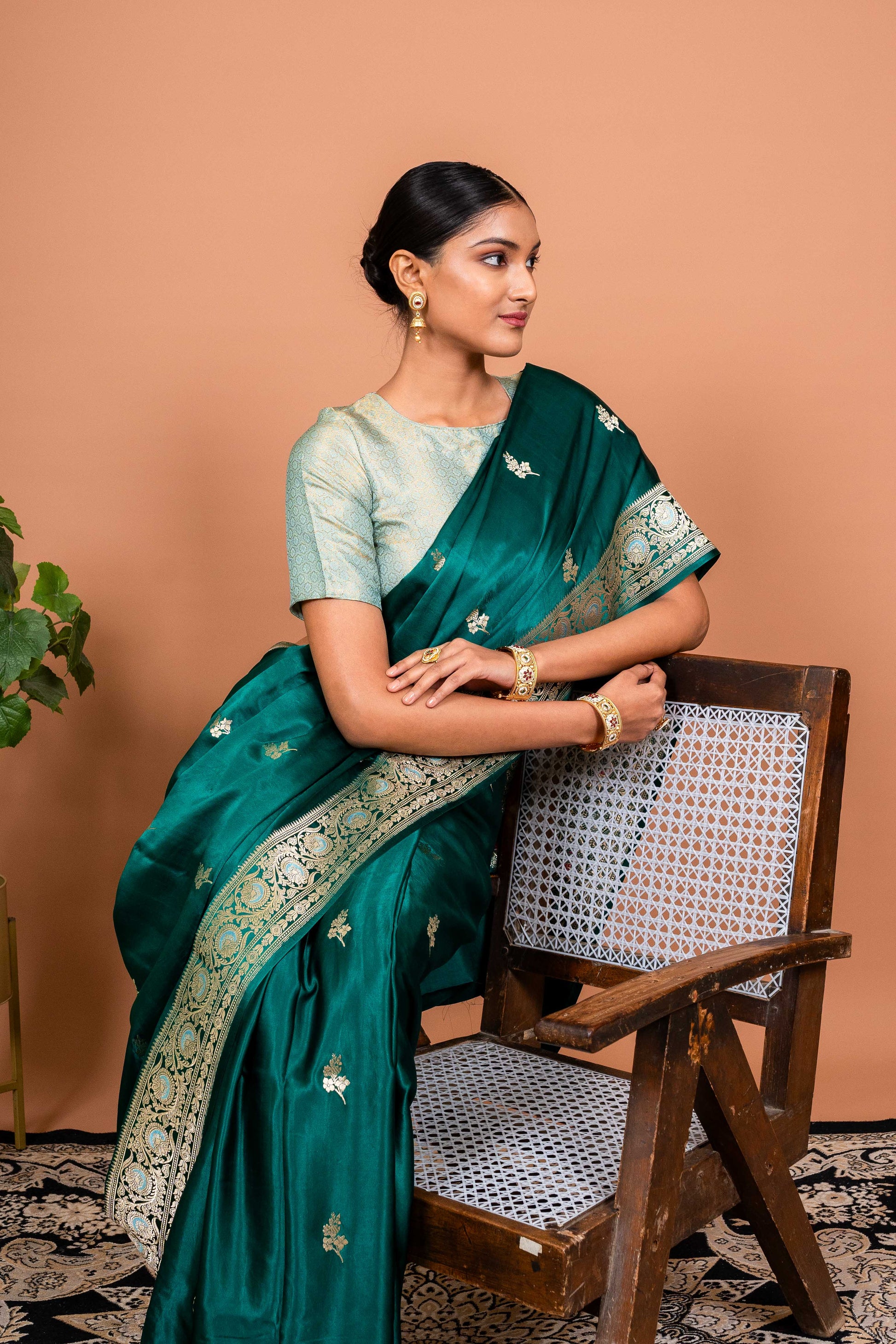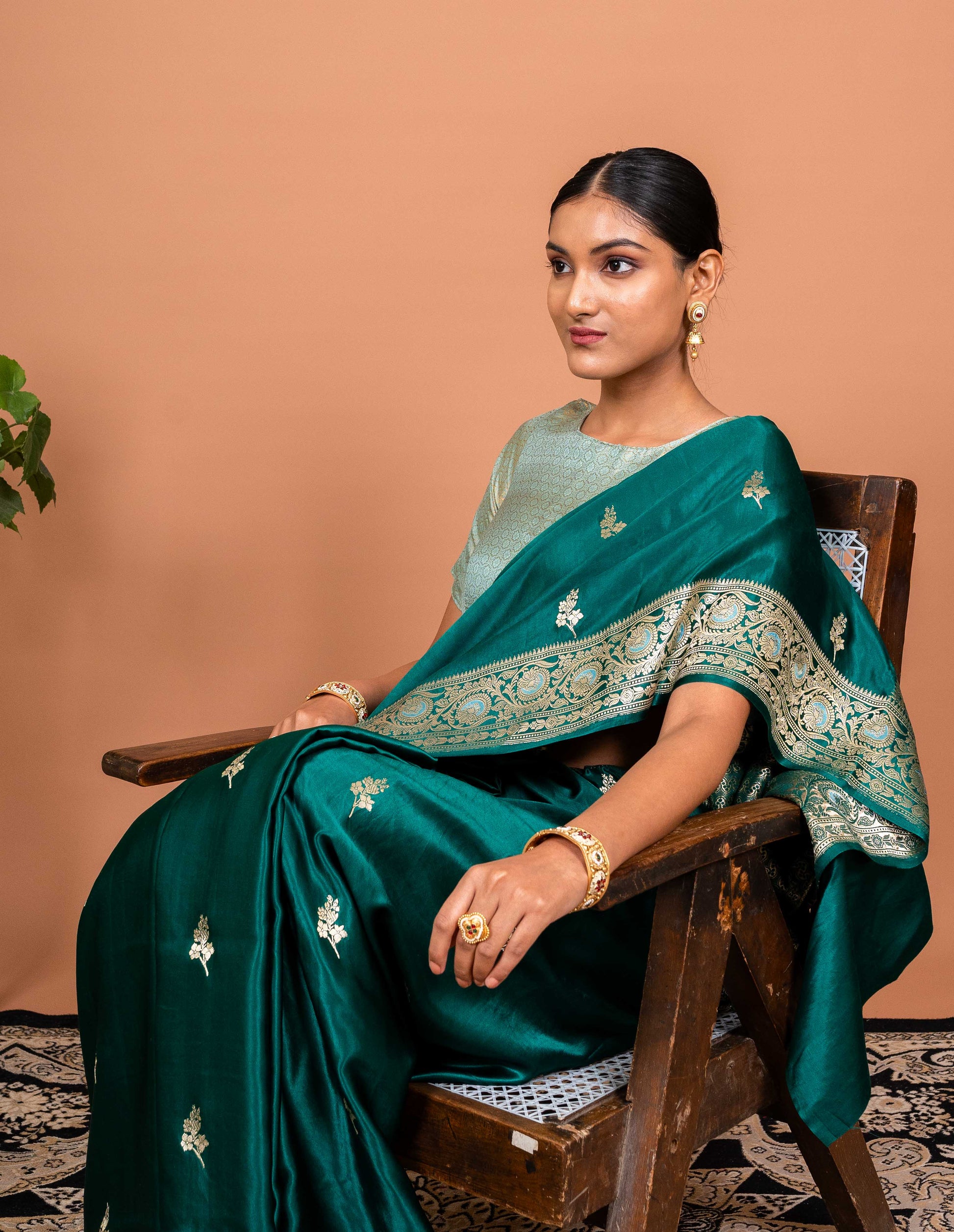 Rooted in heritage, woven with love. The Neev Booti Handwoven Banarasi Silk Saree in a refreshing green hue is an ode to timeless craftsmanship. "Neev" means foundation, and this saree embodies the deep-rooted traditions of Banaras, where every thread is a testament to centuries of artistry. Delicate booti motifs dance across the silk, creating a drape that is both classic and effortlessly graceful.