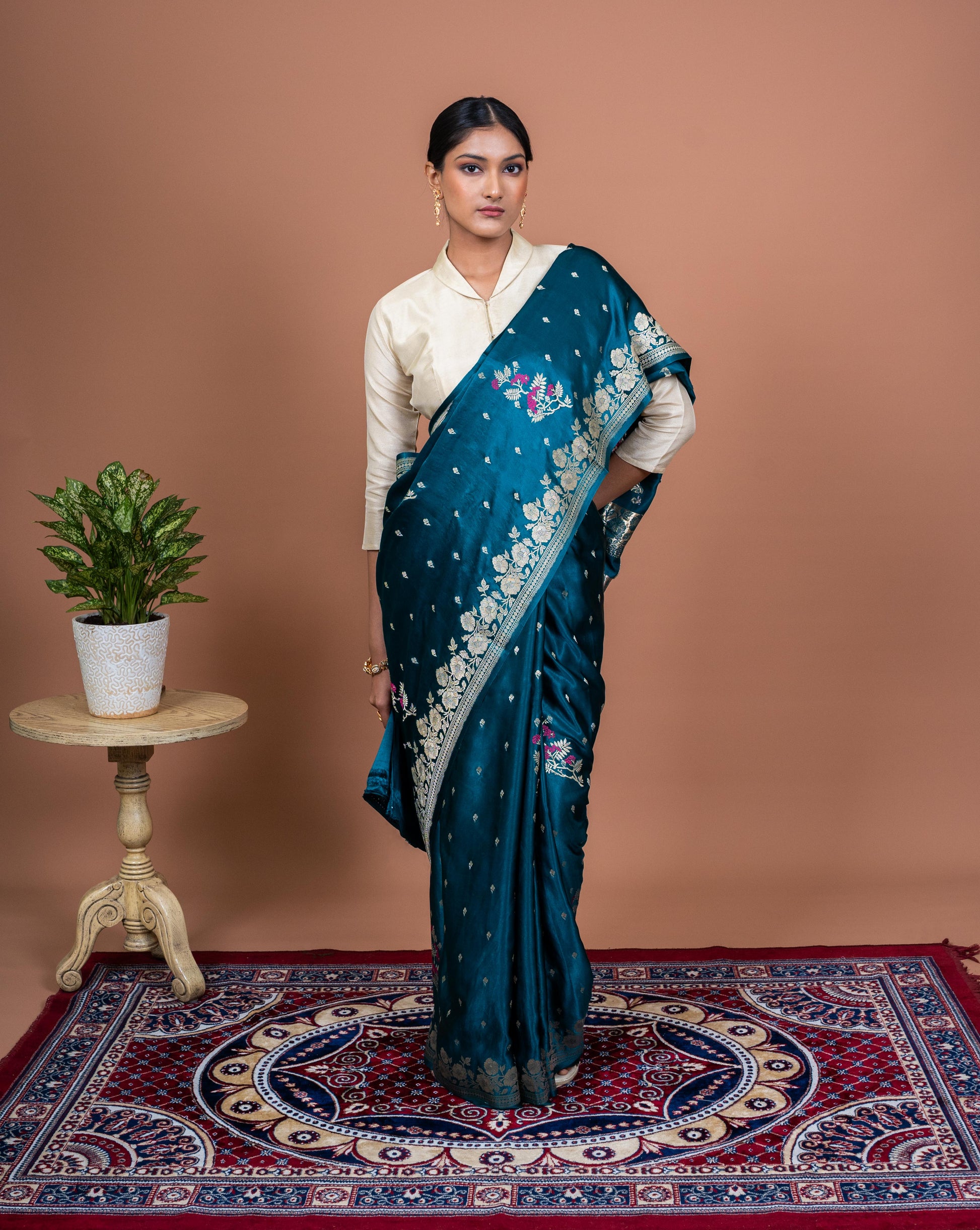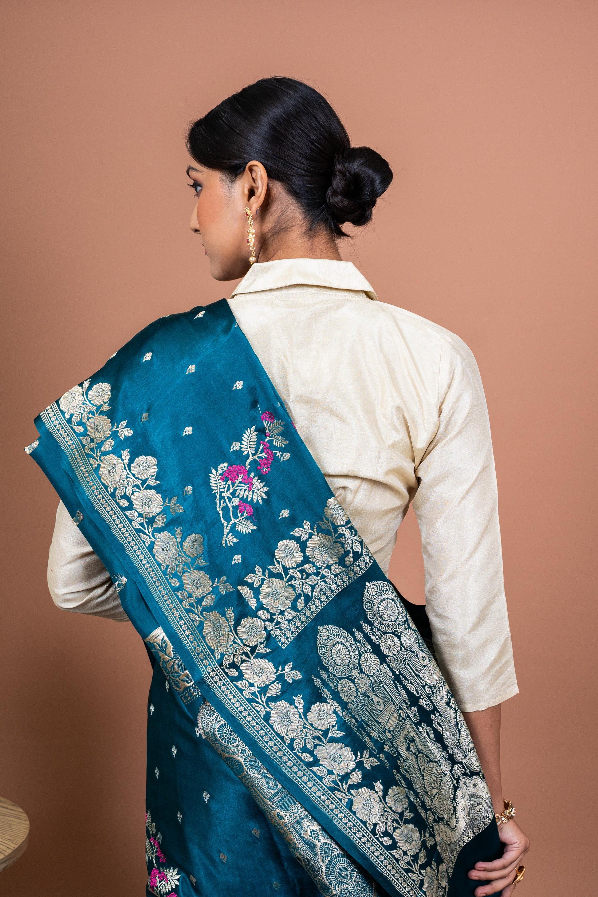 The Nirvana Handwoven Banaras Saree in turquoise is a symbol of peace and refinement, capturing the essence of serene elegance. With its delicate craftsmanship, this saree evokes a sense of tranquility, making it perfect for the woman who carries both strength and grace.