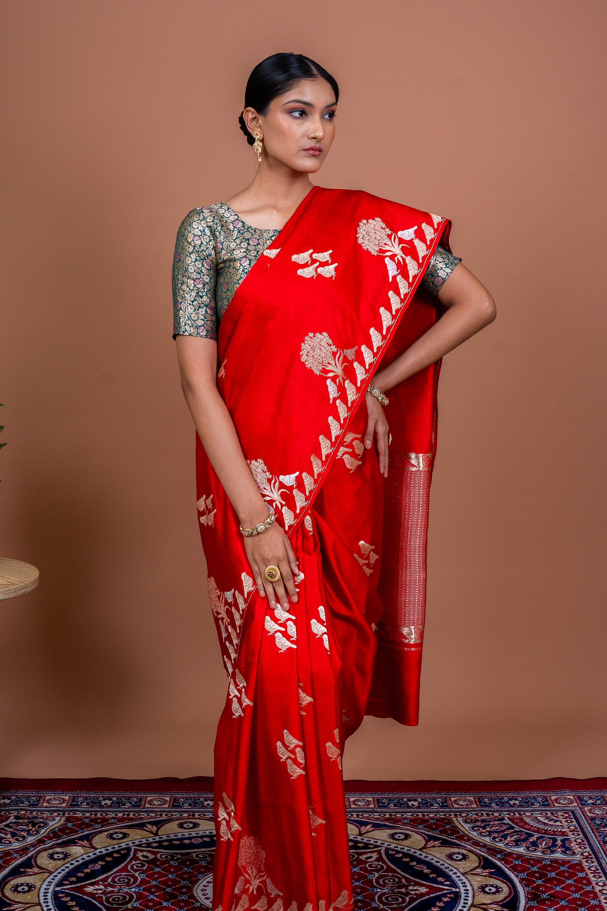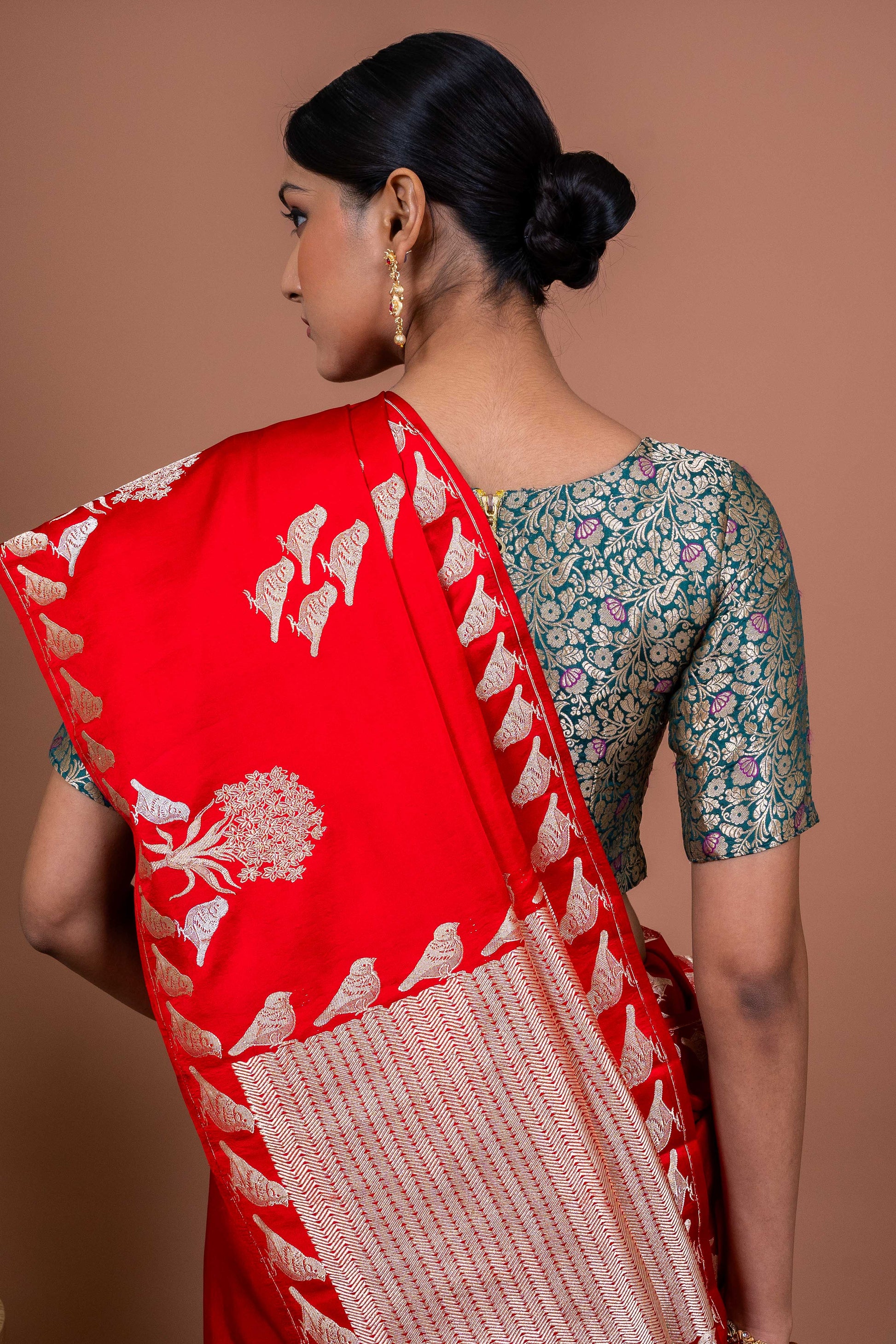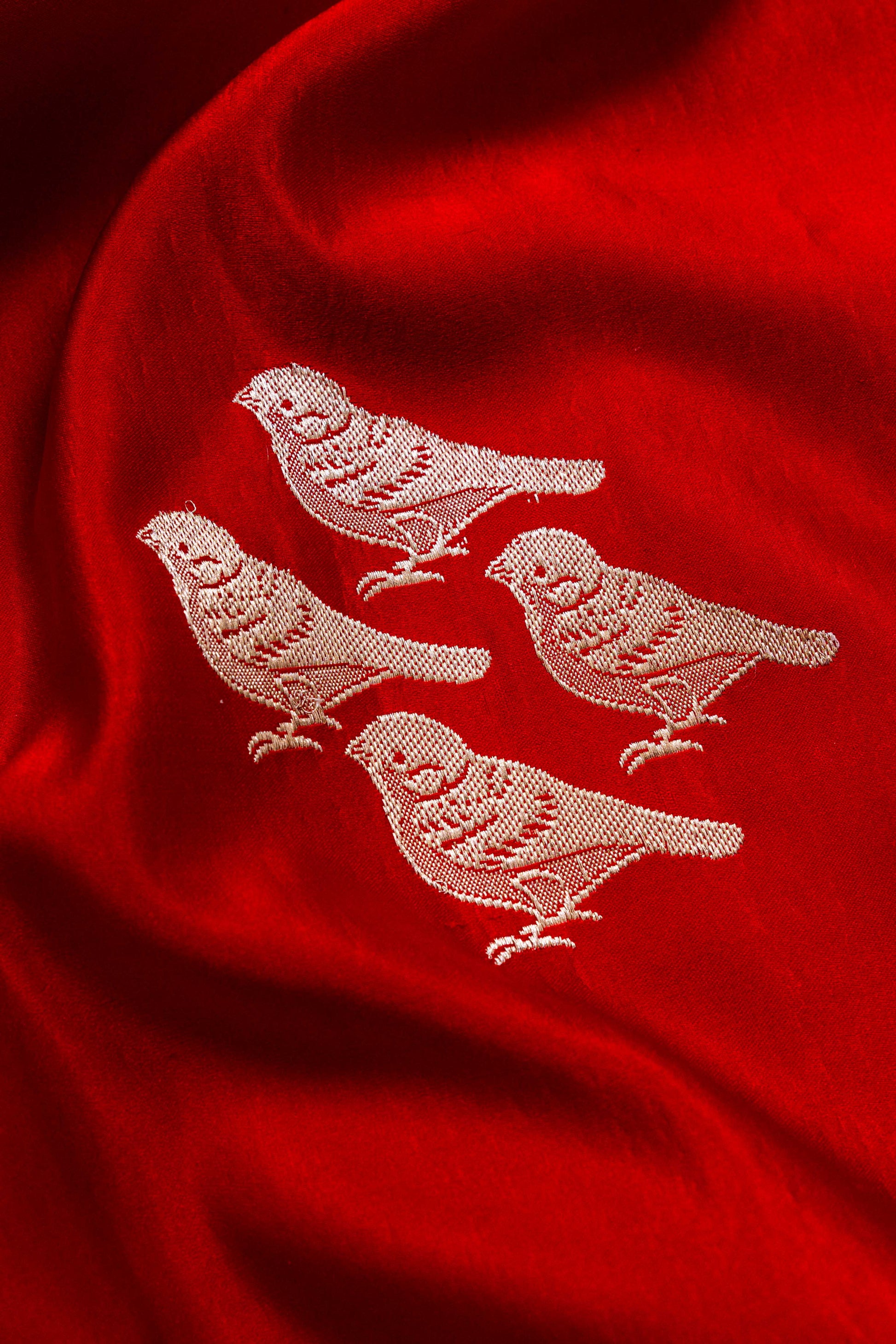 The Parinda Handwoven Banarasi Saree in striking red is more than just fabric—it’s a flight of artistry, tradition, and grace woven into six yards of elegance. A piece that celebrates movement, freedom, and the timeless beauty of Banaras weaves.