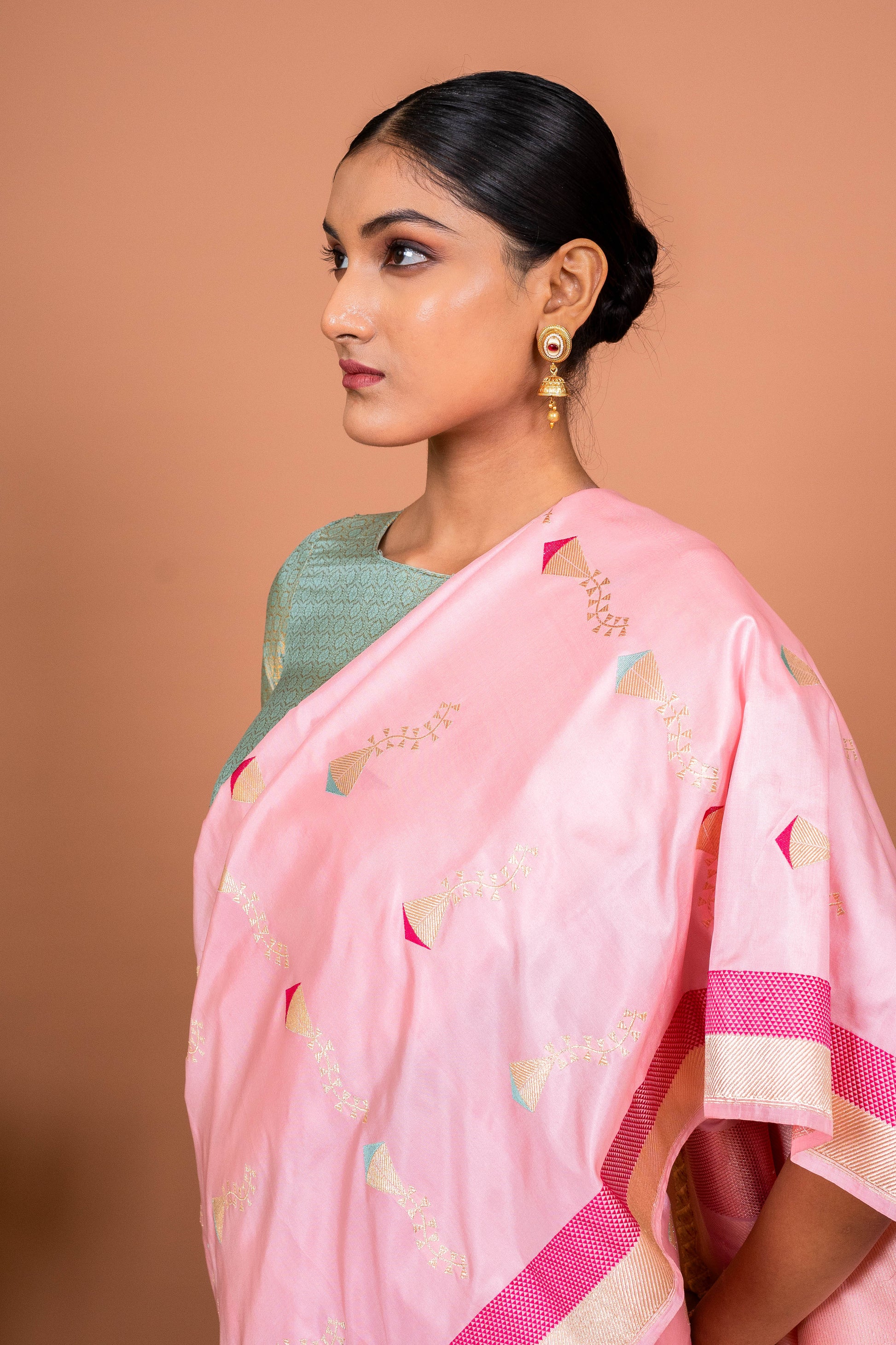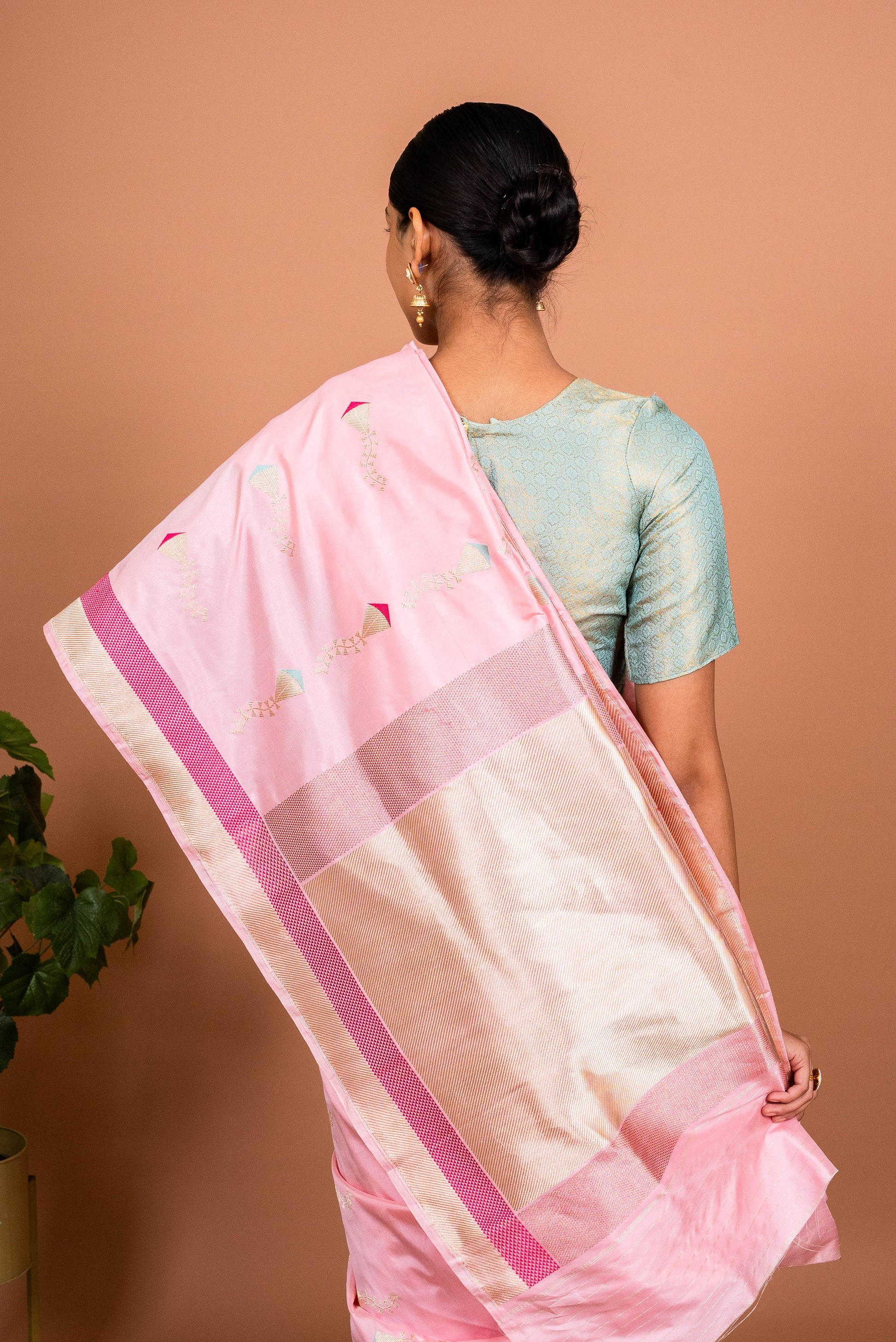 As light as the breeze and as vibrant as a festival sky, the Patang Handwoven Banarasi Silk Saree in a lively pink hue is pure joy in a drape. Inspired by the elegance of soaring kites, this saree carries a playful spirit while staying true to its roots in intricate Banarasi craftsmanship. It's made for the woman who moves with grace, confidence, and a heart full of dreams.