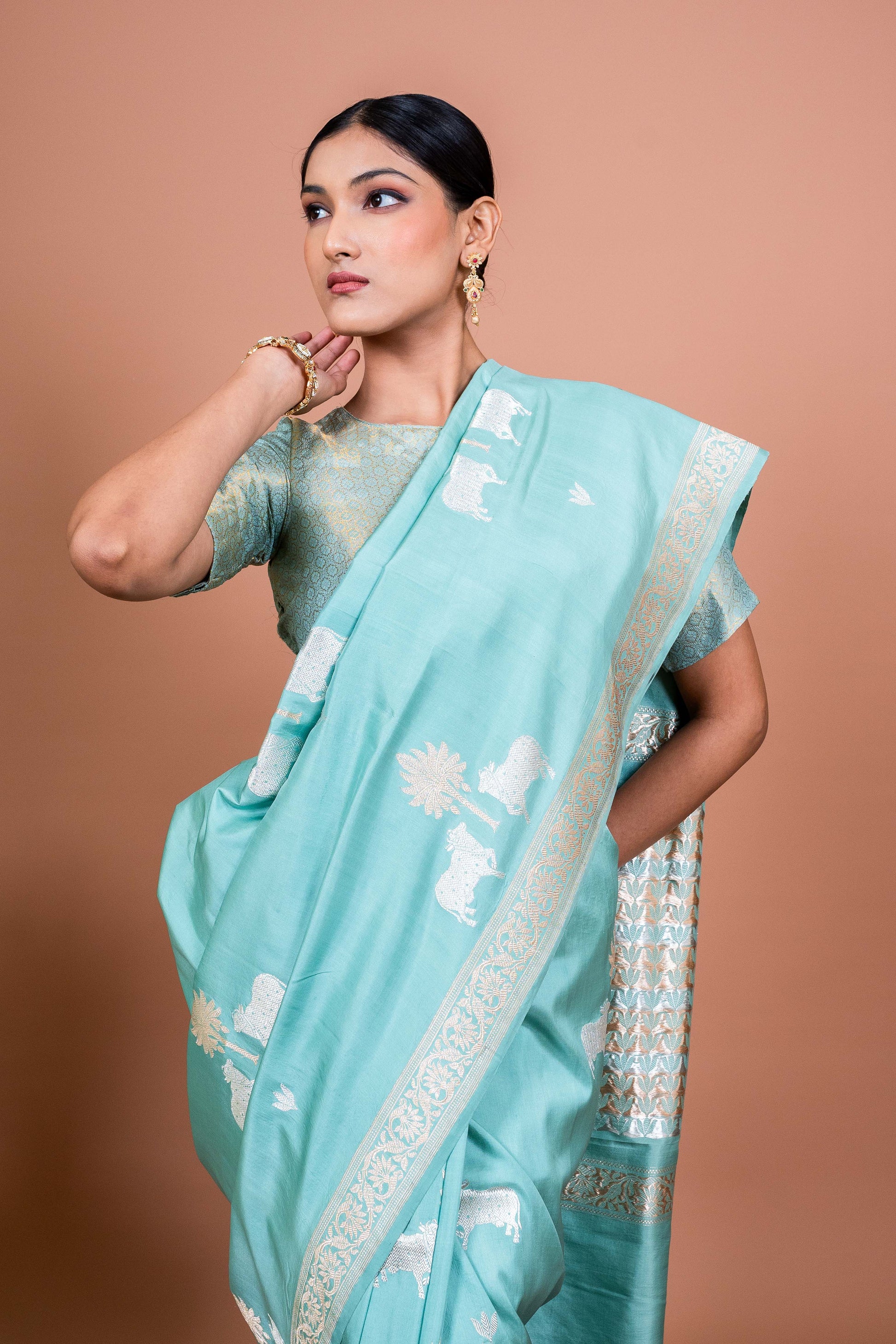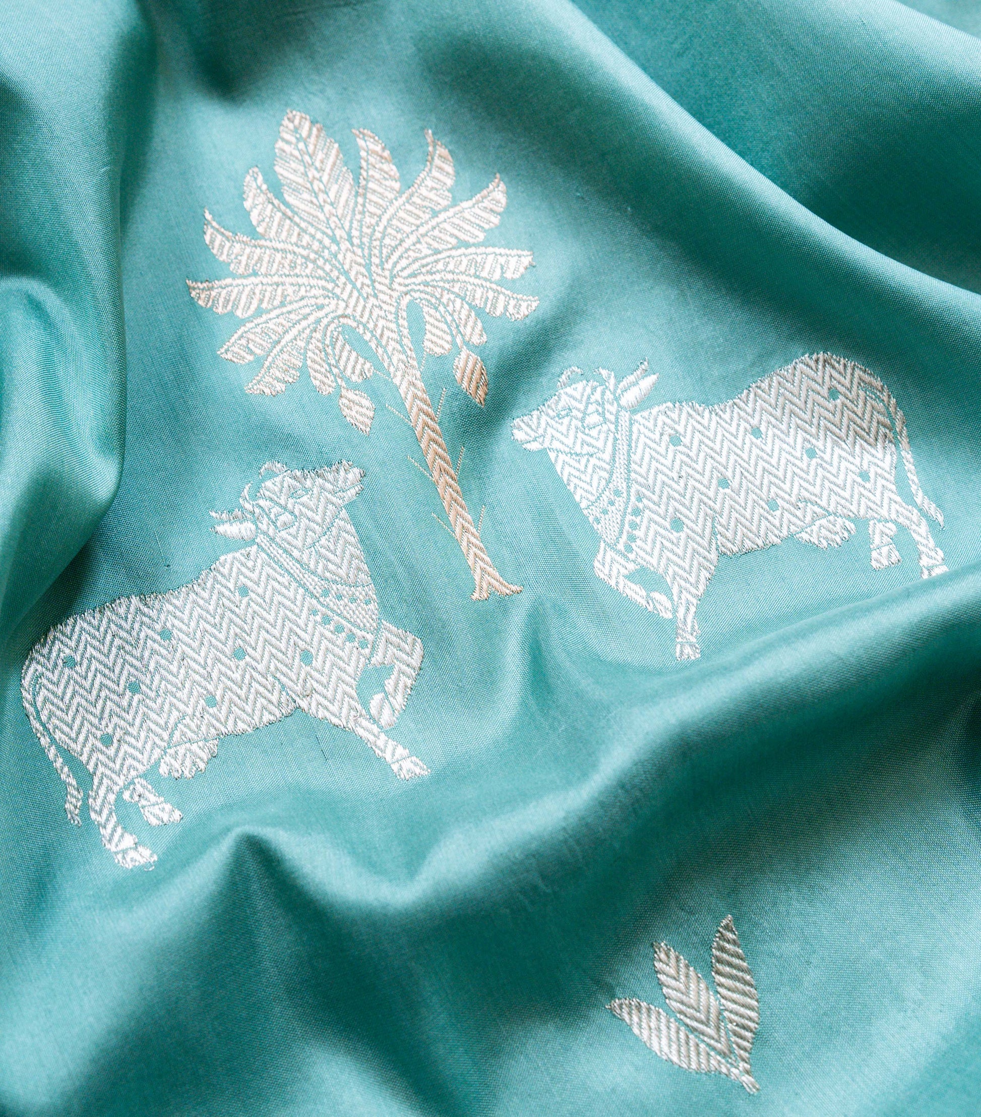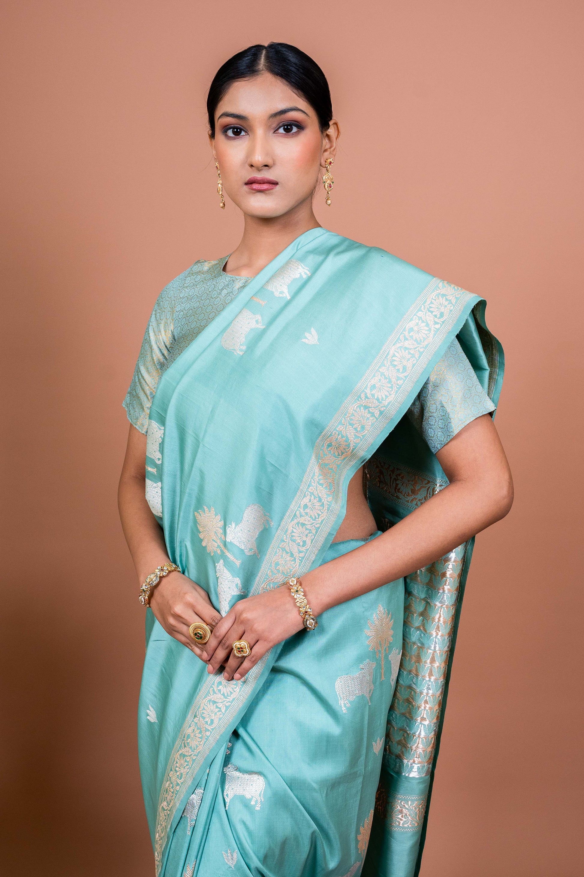 The Pichhwai Handwoven Banarasi Saree is a canvas of tradition, painted in the serene depths of blue. Inspired by the timeless art of Pichhwai paintings, this saree is a masterpiece that blends heritage with elegance.