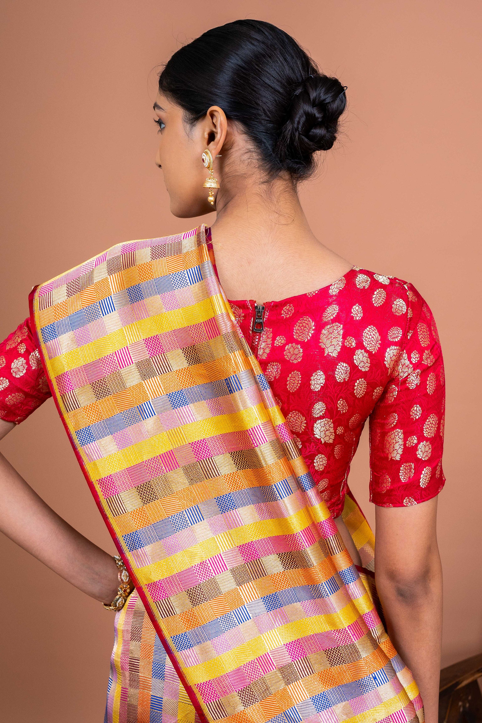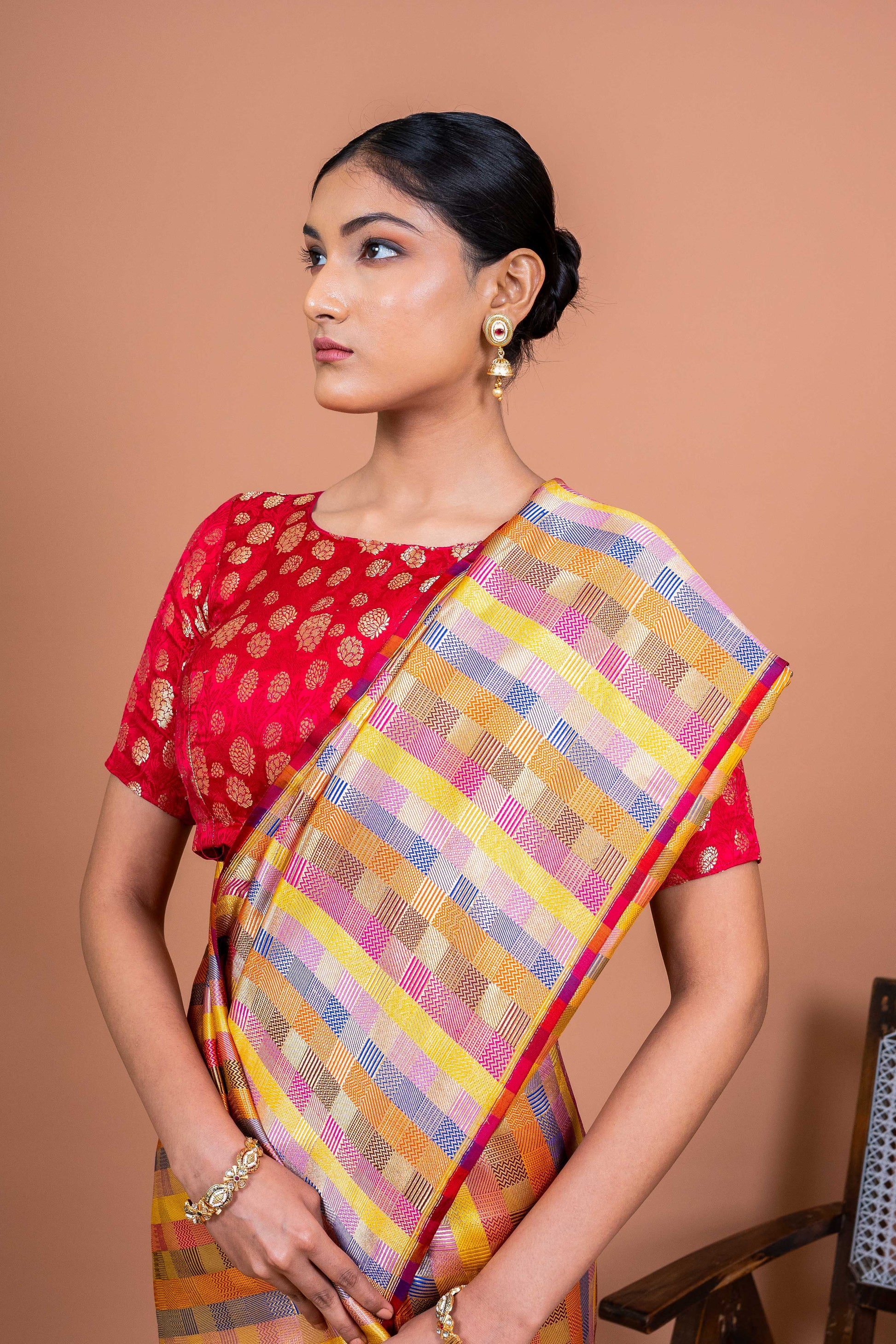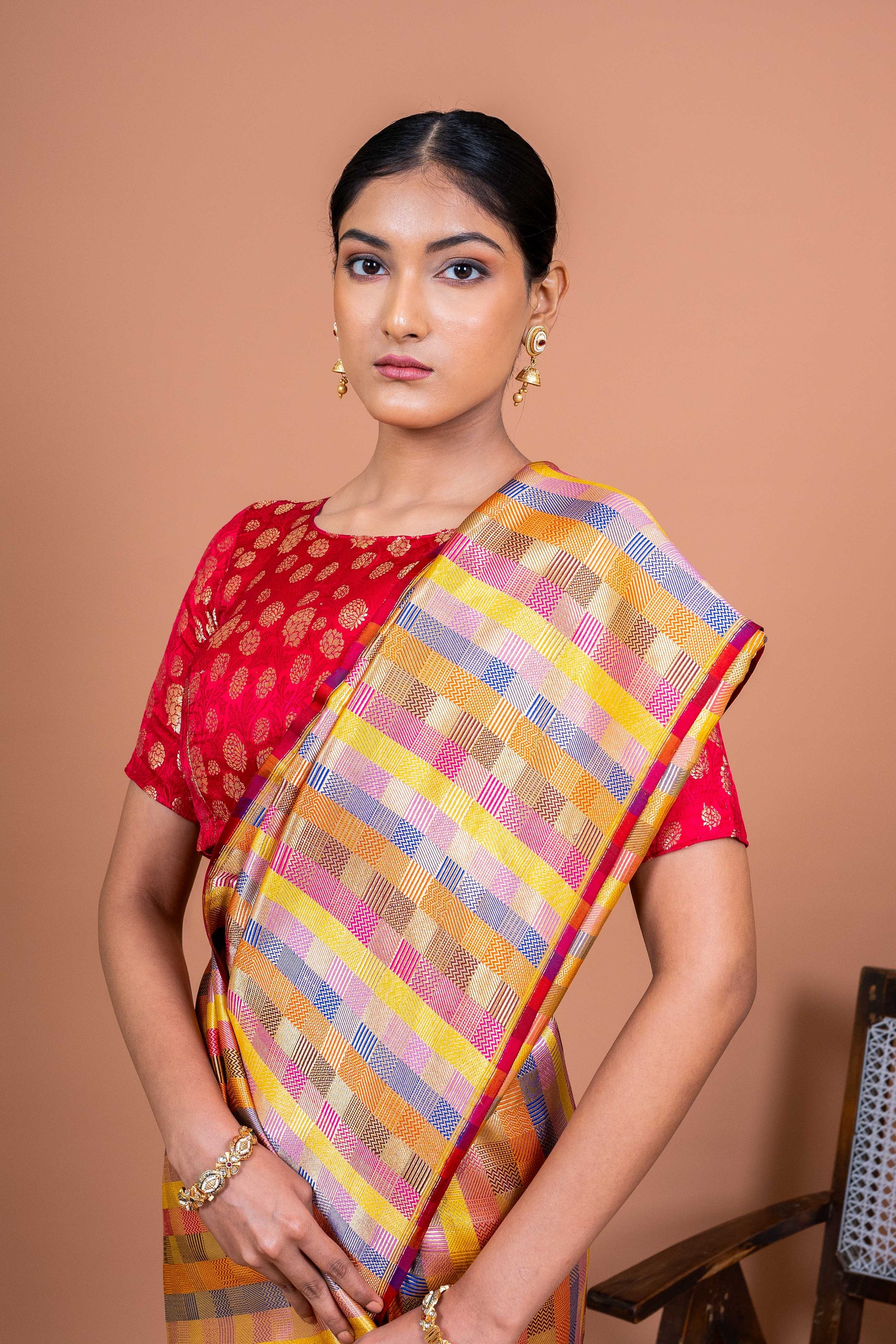 Embrace the vibrancy of life and step into the spotlight with the Multicolor Rangeen Handwoven Banaras Saree, where tradition meets contemporary elegance in every thread.