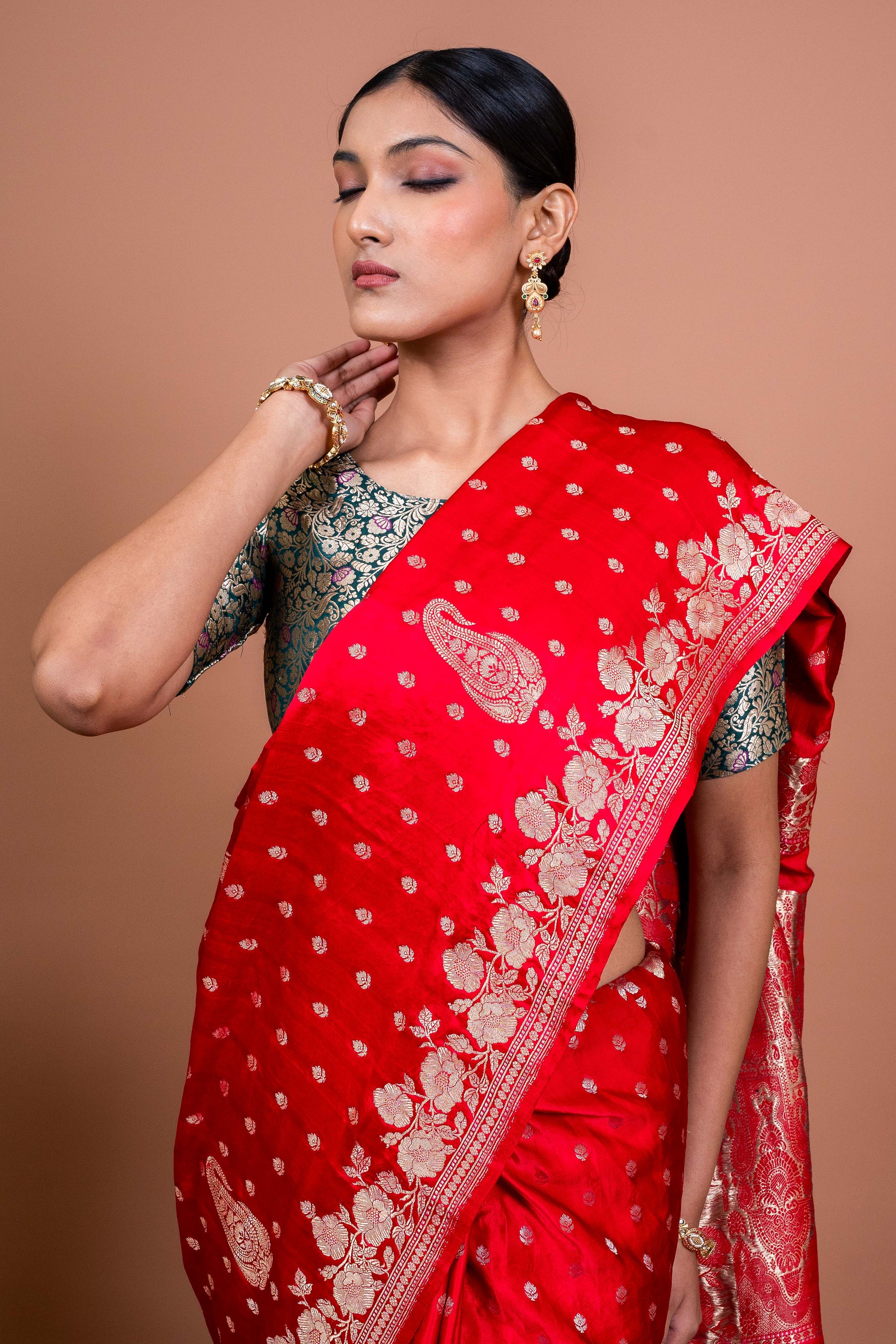 The Sabhya Boota Handwoven Banarasi Saree in a captivating red is a tribute to grace, tradition, and timeless craftsmanship. Every thread speaks of heritage, every motif whispers of artistry—making this saree a true classic.