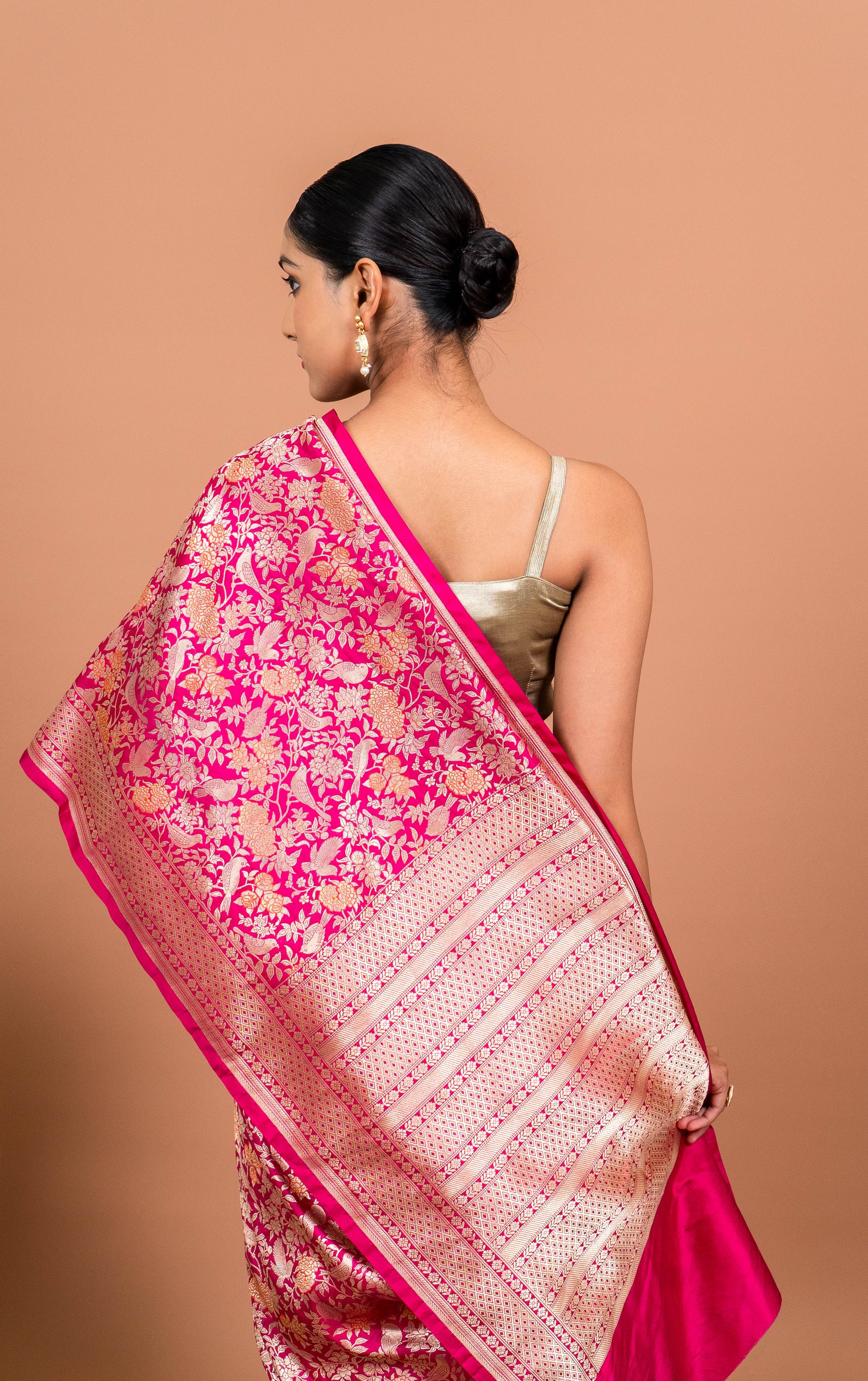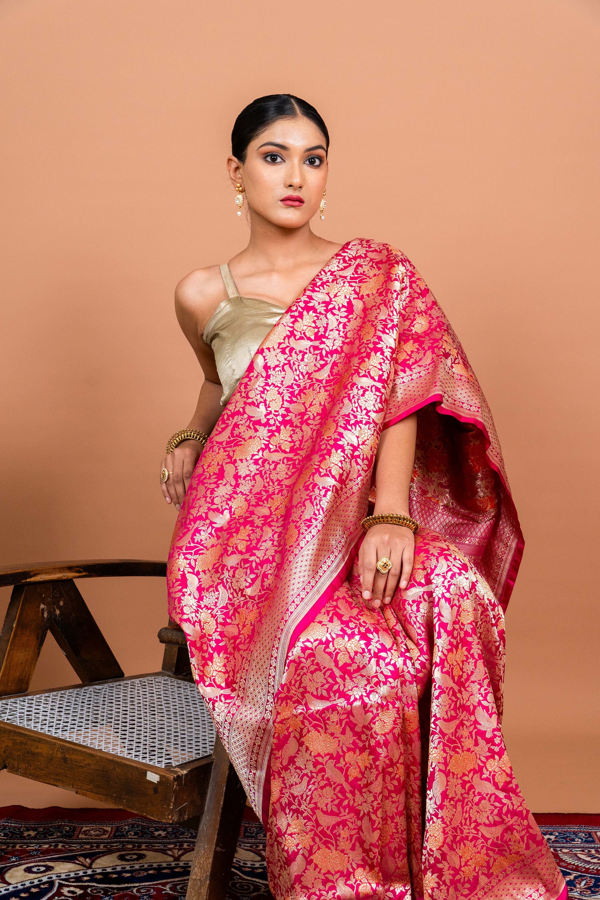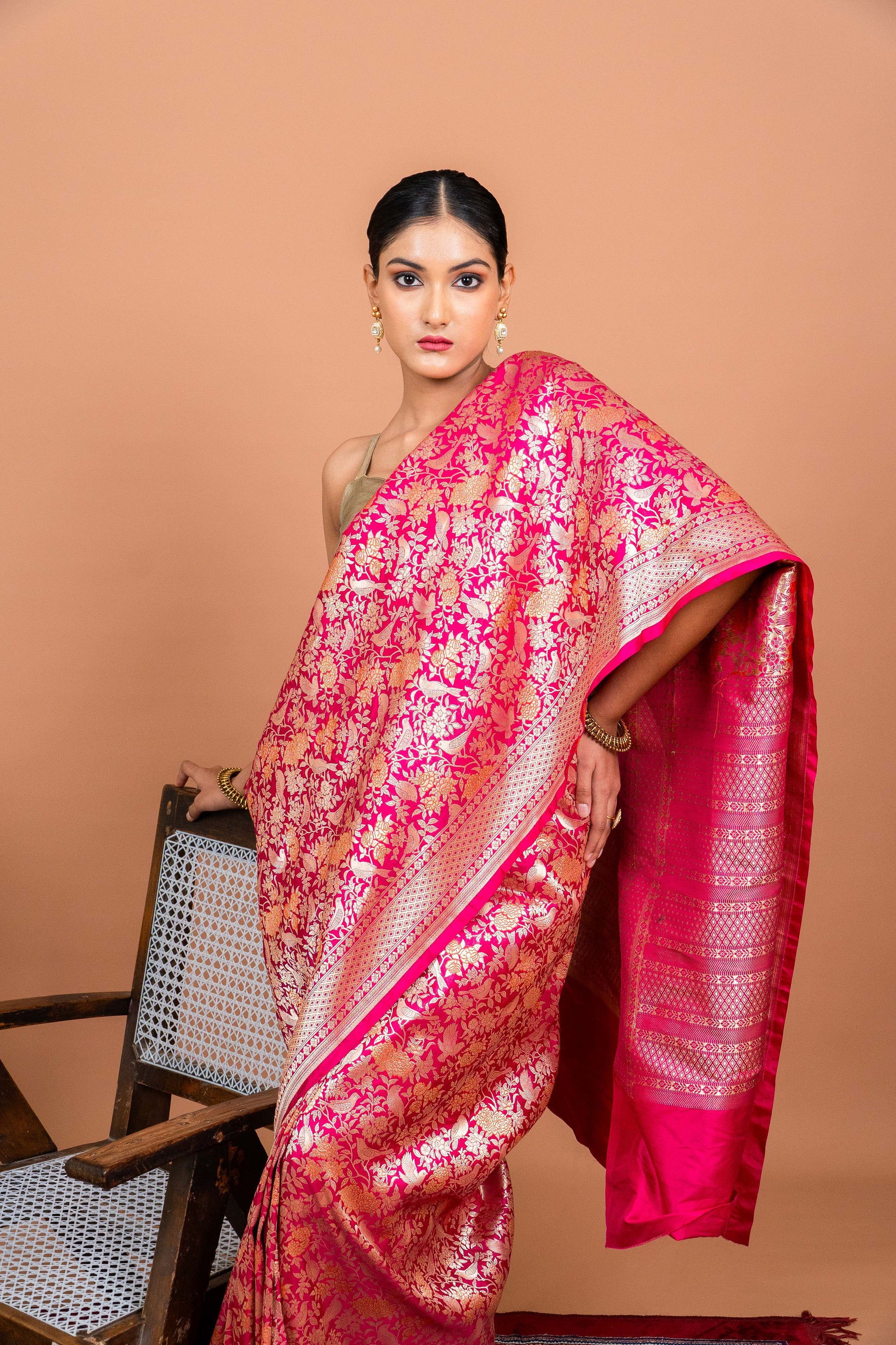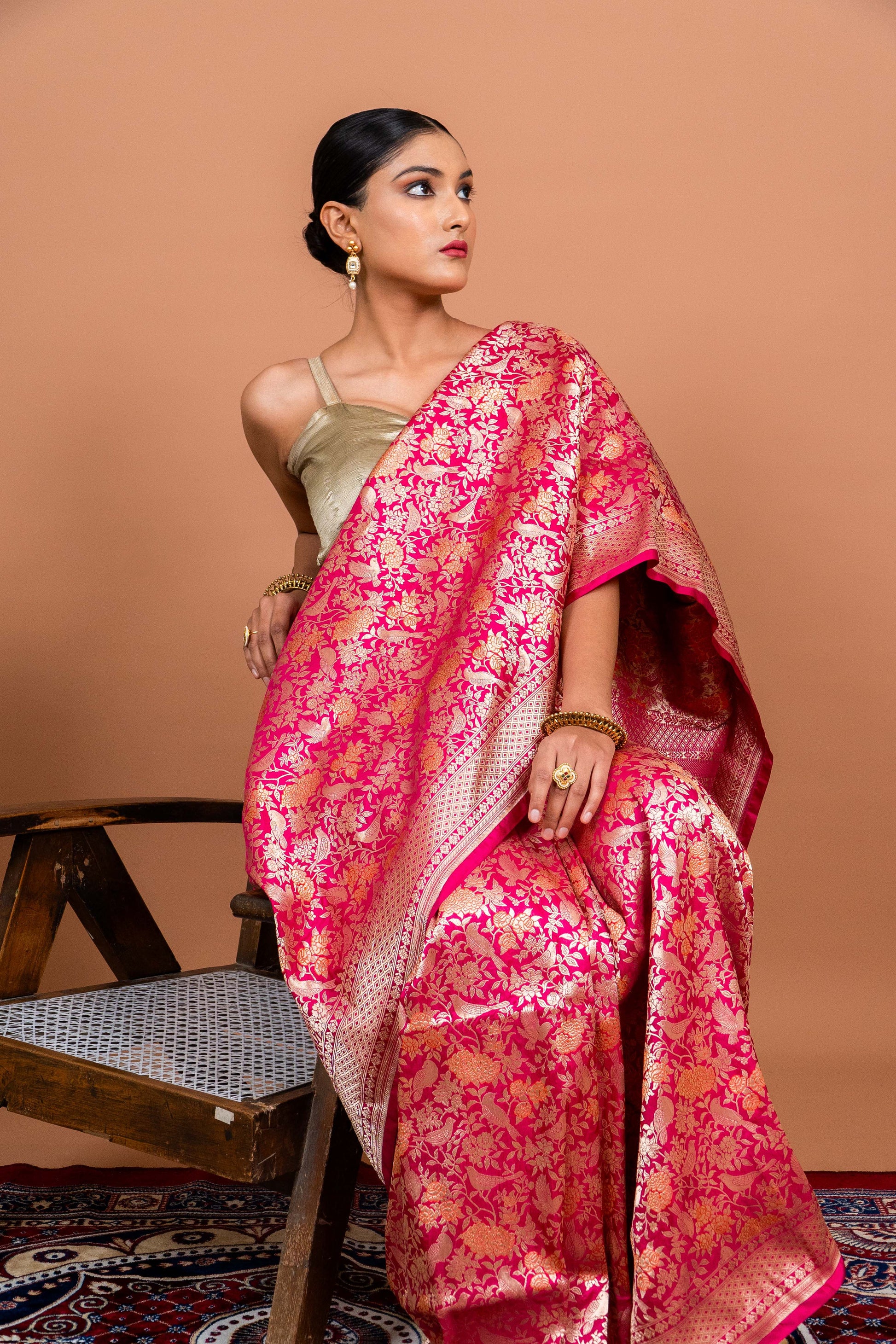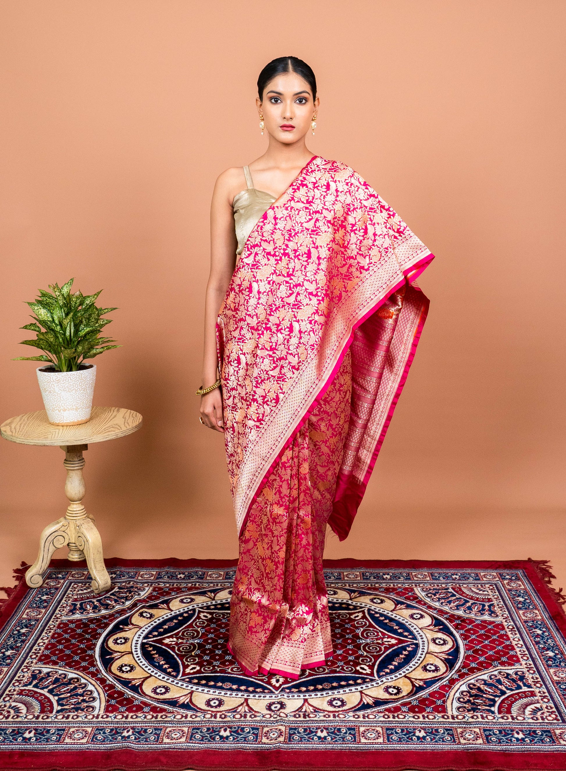 A saree is more than just fabric—it’s a feeling, a legacy, a work of art. The Shikar Gul Handwoven Banarasi Silk Sareein a delightful pink hue is a tribute to heritage weaving, inspired by the majestic Shikargah motifs. With intricate patterns that capture the beauty of nature and tradition, this saree is as graceful as it is captivating.