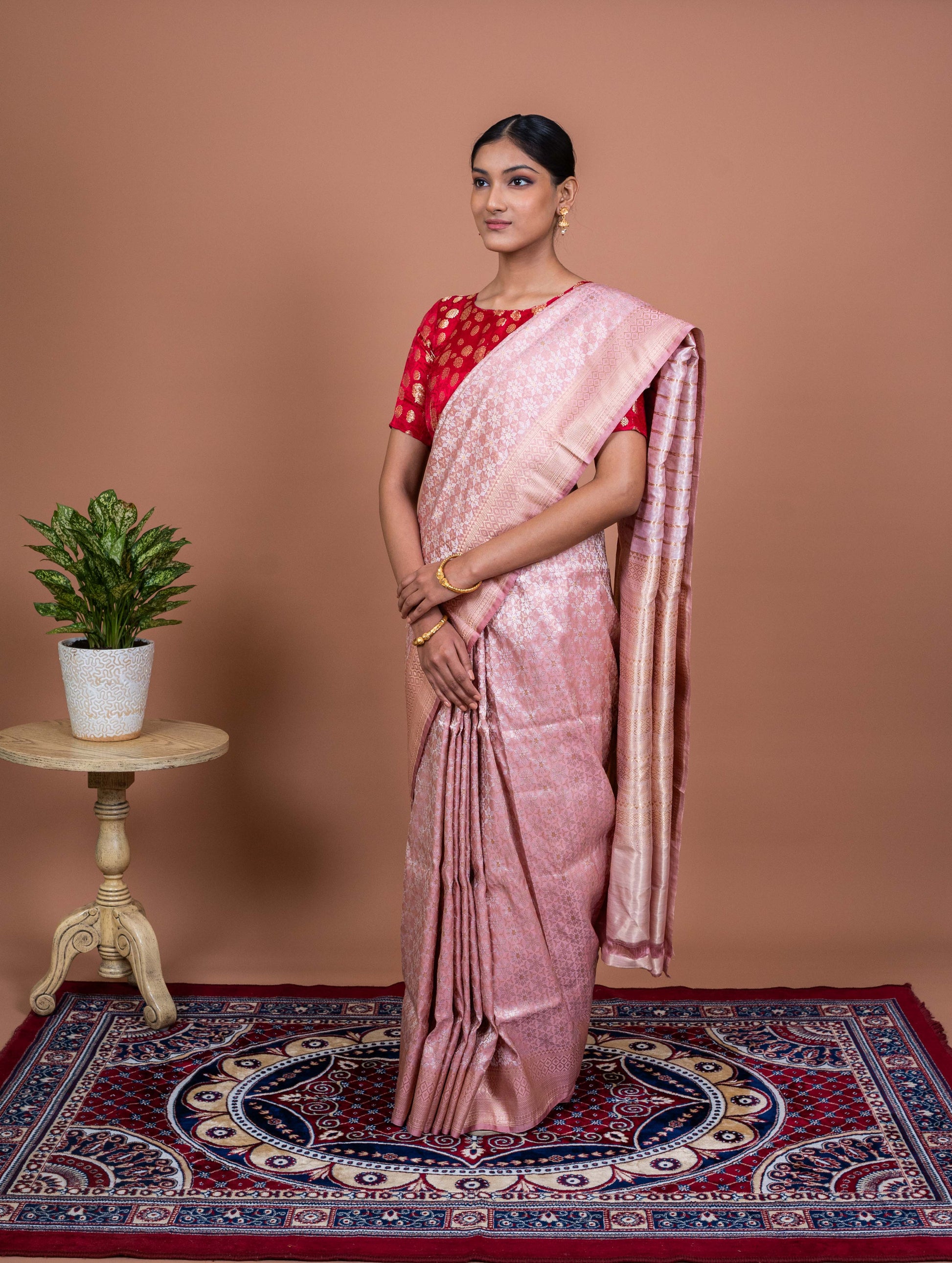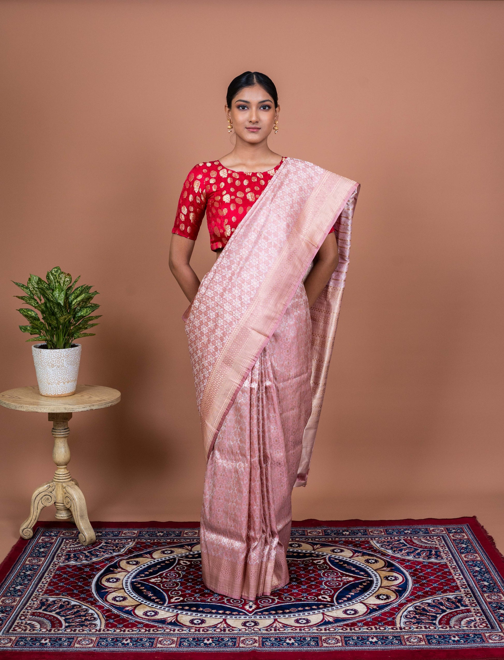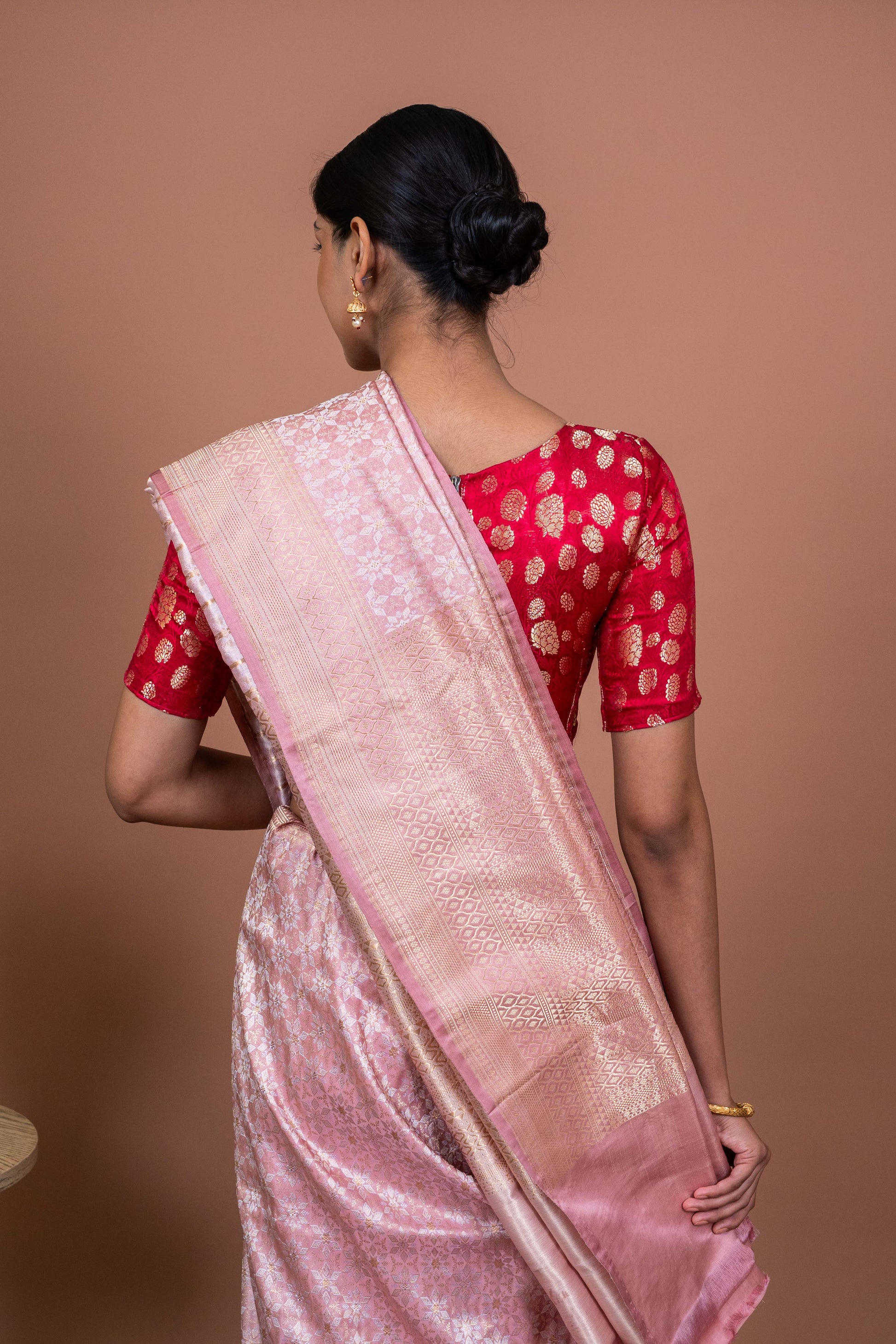 The Sitara Handwoven Banaras Saree in pink is a celebration of femininity and grace, offering a timeless elegance that captivates the heart and soul.