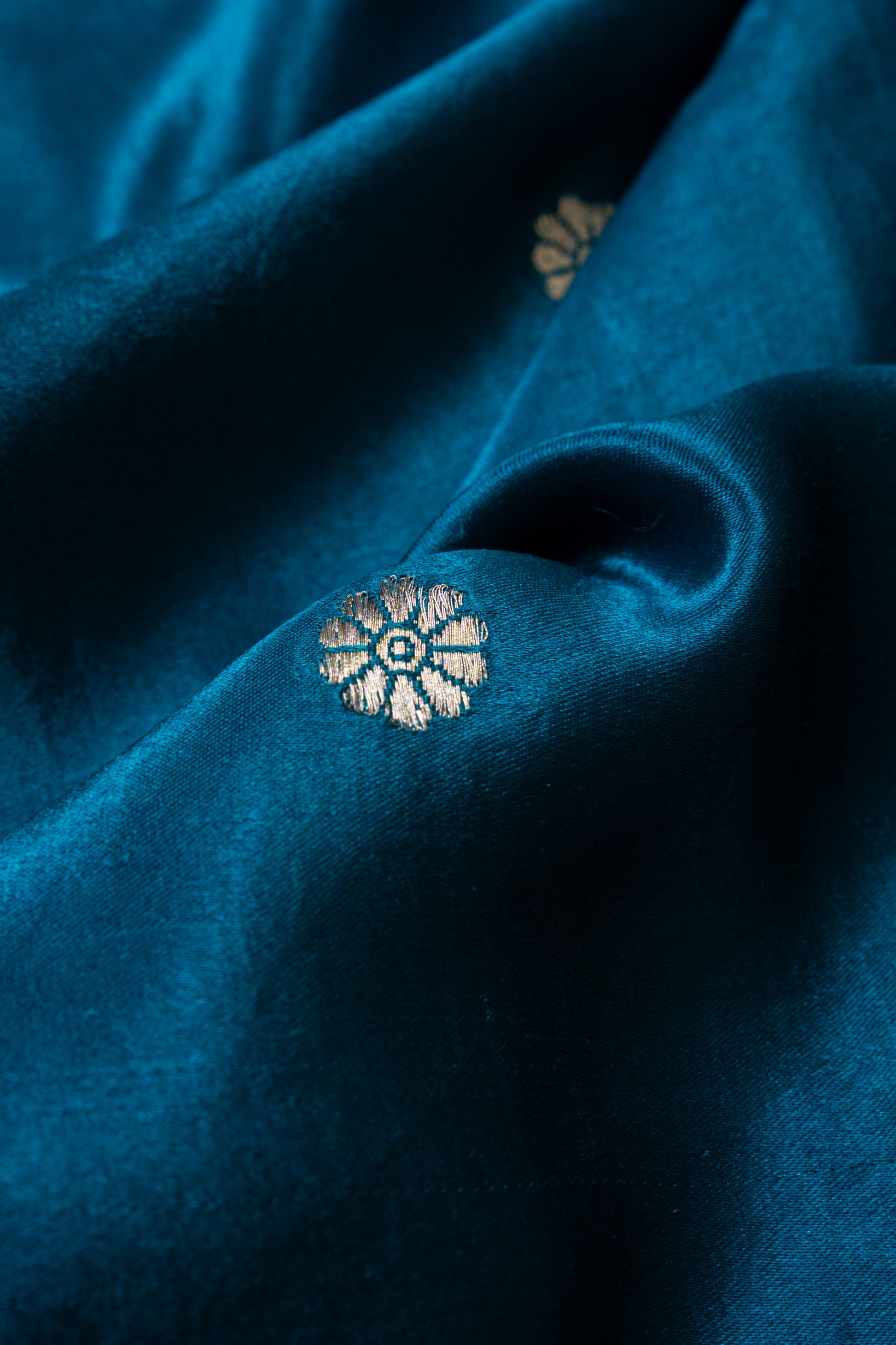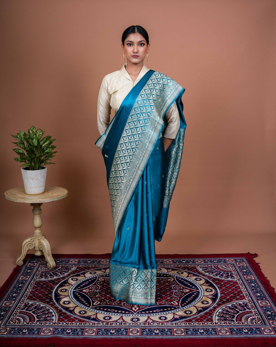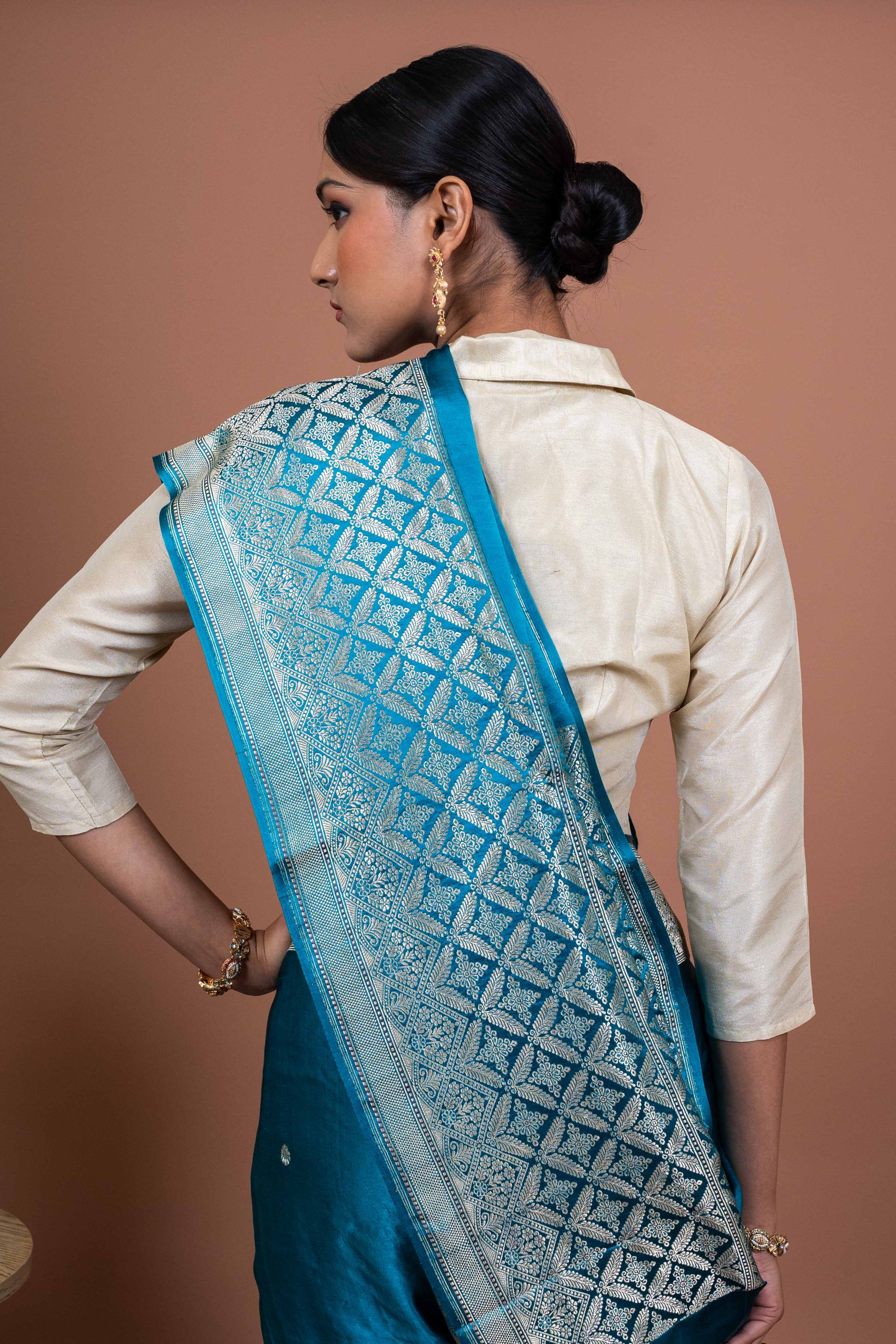 The Triveni Handwoven Banarasi Saree is where heritage meets elegance, draped in a stunning shade of turquoise. Inspired by the confluence of art, culture, and tradition, this saree is a masterpiece that reflects timeless beauty.
