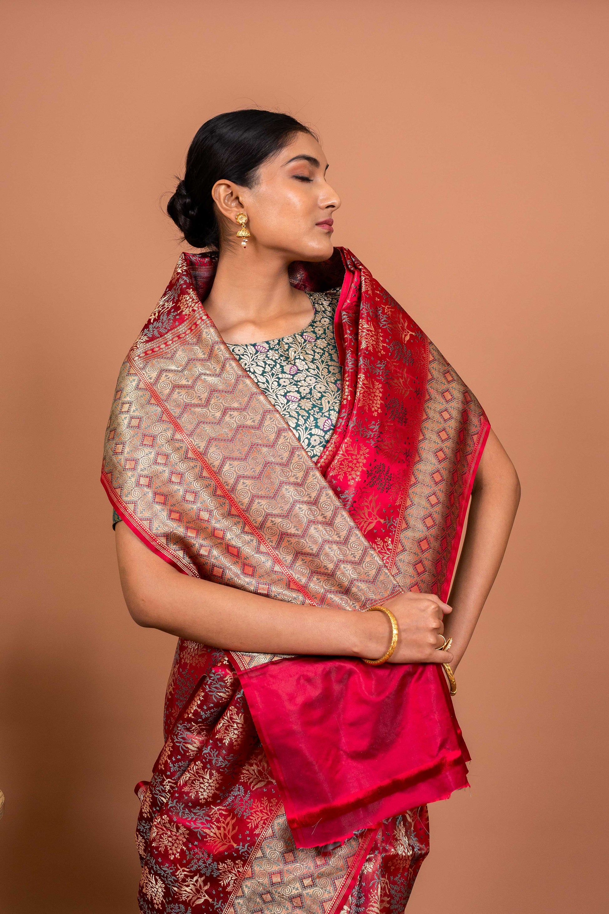 There’s something magical about a saree that carries the essence of nature. The Vana Tanchhoi Handwoven Banarasi Saree in green is a tribute to timeless artistry, inspired by lush landscapes and woven with intricate precision. It’s not just fabric—it’s a canvas of tradition, skill, and elegance.