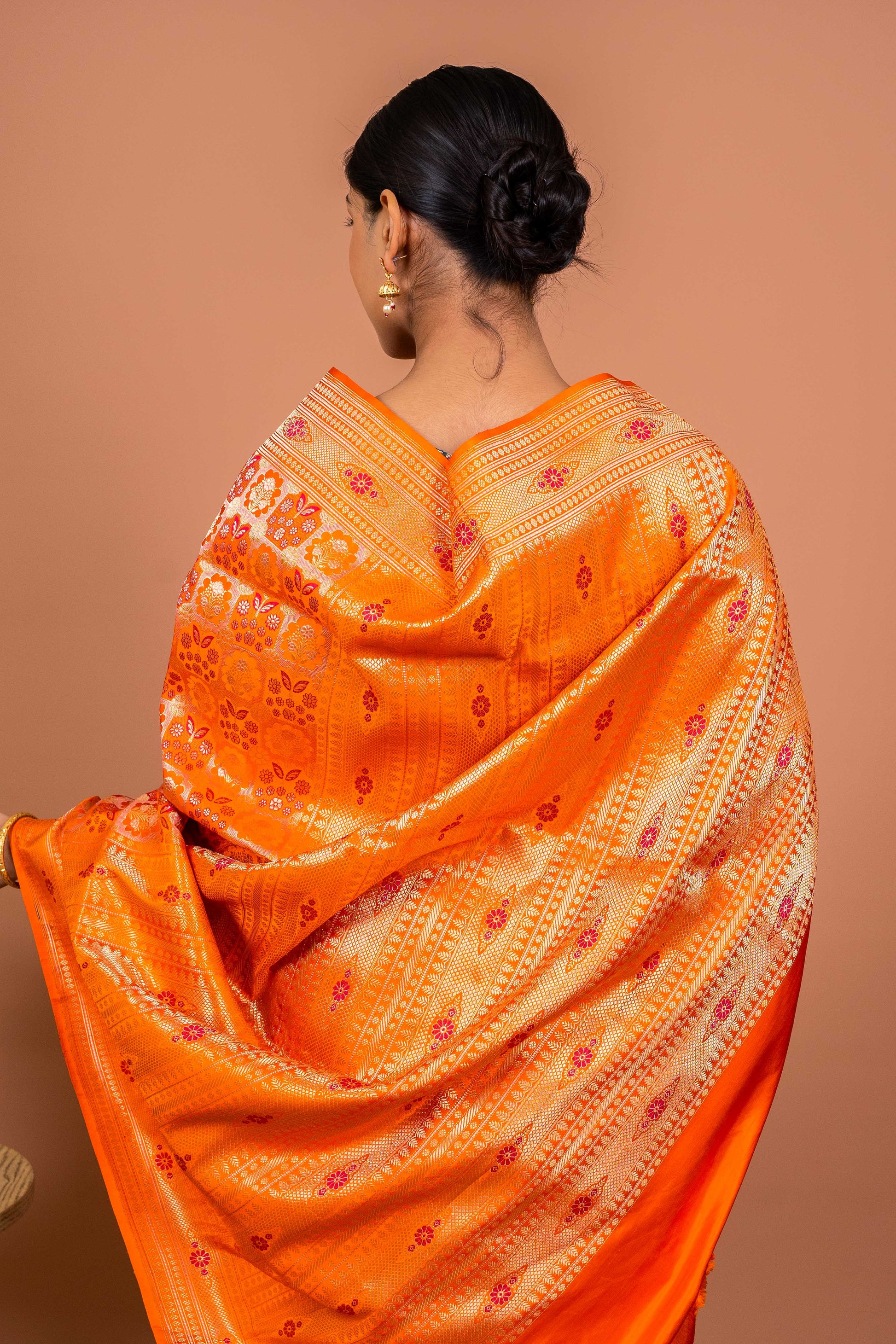Some sarees don’t just drape; they tell a story. The Vana Tanchhoi Handwoven Banarasi Saree in a radiant shade of orange is a testament to tradition, craftsmanship, and timeless beauty.